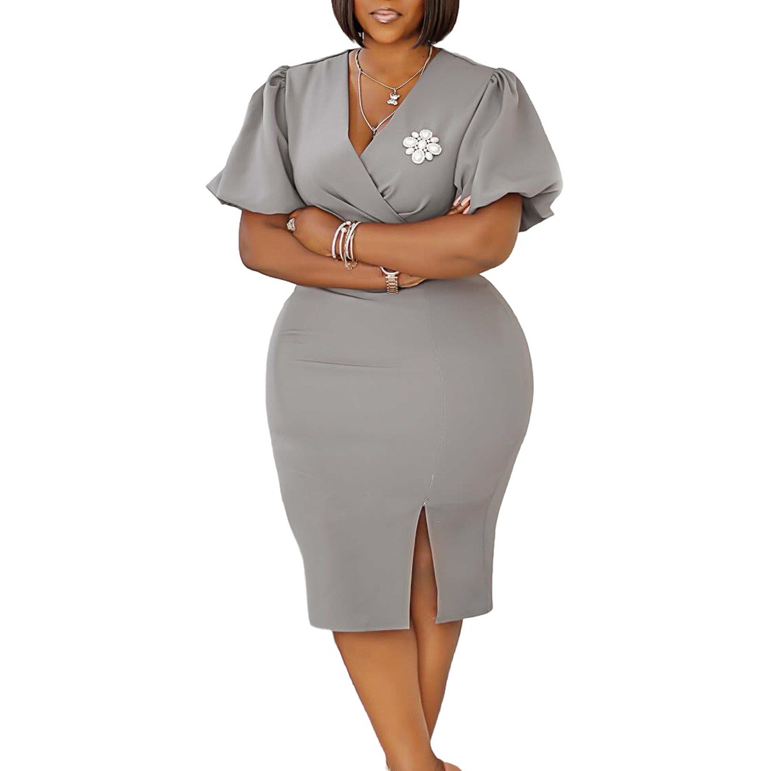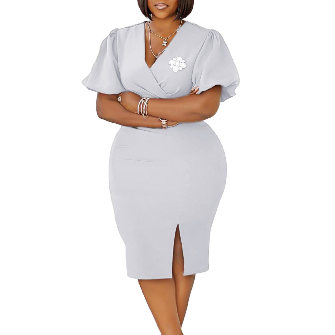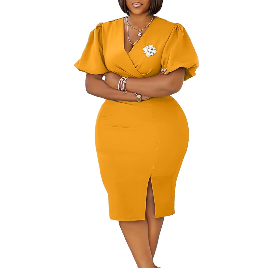 This African Summer Women V-neck Lantern Sleeve Bodycon Slit Dress Design Made Of High End Polyester And Spandex Material, It Has Enough Stretch, Wearing Comfortable And Make You Good Emotion All The Day. The Office Wear For Ladies Is a Perfect Look For Attend Meetings, Meet Important Customers, Go To Work Daily. When You Need Wholesale Best Work Dresses, You Can Find On Our Wholesale Women Apparel Online Store Something That You Really Can Not Find From Other Place.