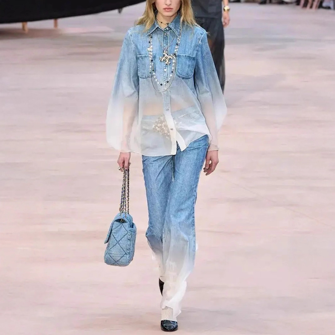 This Autumn Women's Fashion Premium Gradient Denim Single-Breasted Shirt And High-Waisted Bell Bottom Pants Set Design Made Of High Quality polyester And Spandex Material. It Is Stretchy, Durable And Comfortable. It Is a Must-Have Outfit For All Seasons. retail Two Piece Pant Sets Can Solve Your cloth selection Troubles. Explore More 2 Piece Pants Set On BamBam retail Women Clothing Online Store.