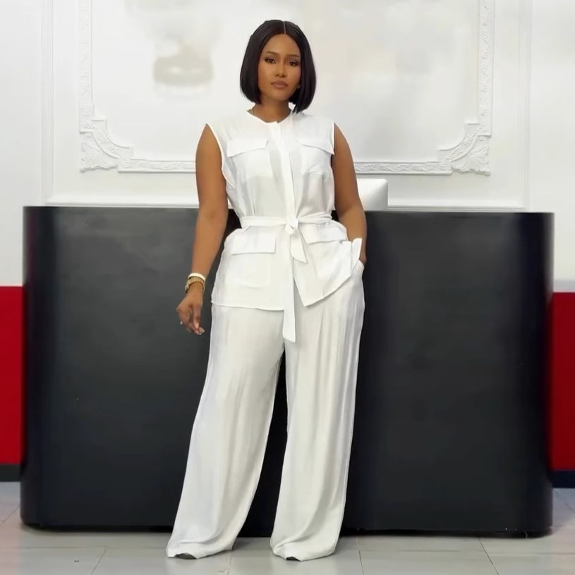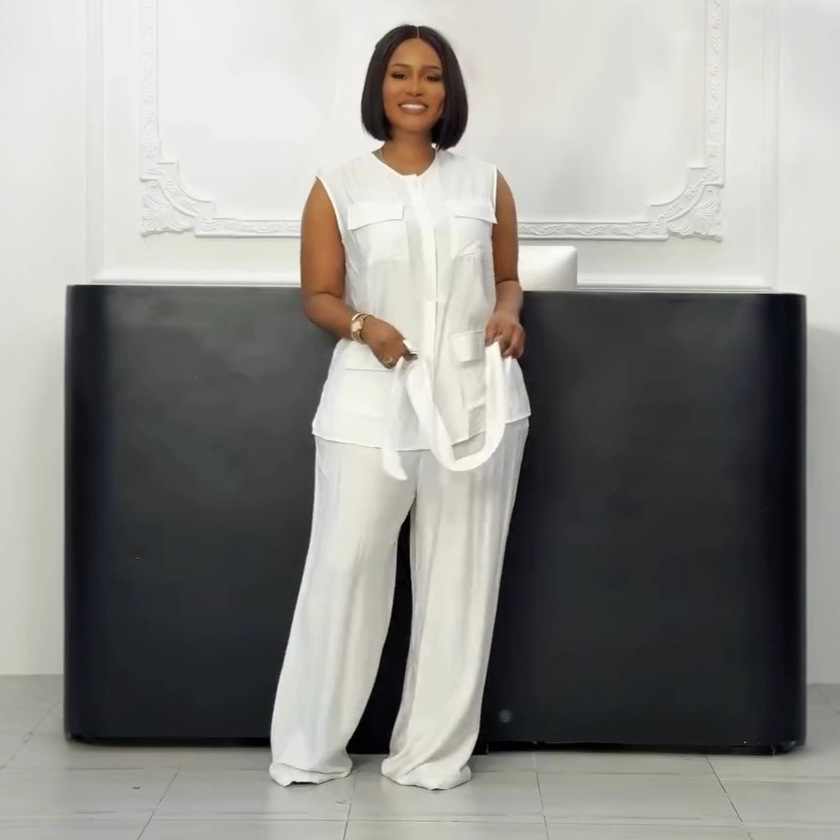This Career Casual Round Neck Lace-Up Sleeveless Vest & Wide-Leg Pants Set Design Made Of High Quality polyester And Spandex Material. It Is Stretchy, Durable And Comfortable. It Is a Must-Have Outfit For All Seasons. retail Two Piece Pant Sets Can Solve Your cloth selection Troubles. Explore More 2 Piece Pants Set On BamBam retail Women Clothing Online Store.