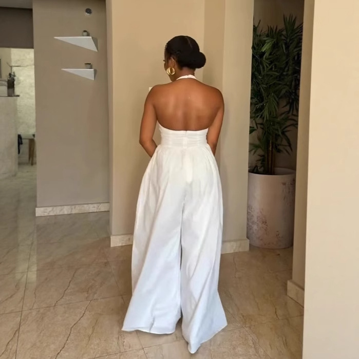 This Elegant Halter Neck v-Neck Low-Back Solid Color Wide-Leg Jumpsuit Design Made Of High Quality Polyster And Spandex Material. It Is Stretchy, Durable And Comfortable. Affordable Sexy Jumpsuits For Women Has Long Been a Party Favorite. BamBam provides a Rich selection Of Sequin, Beaded, See Through Mesh, Leopard, Floral Lace, Leather, Velvet, Tight And Fitted retail Jumpsuit Without Moq Limit.