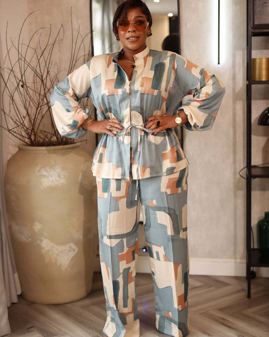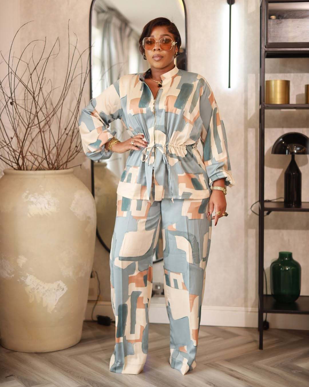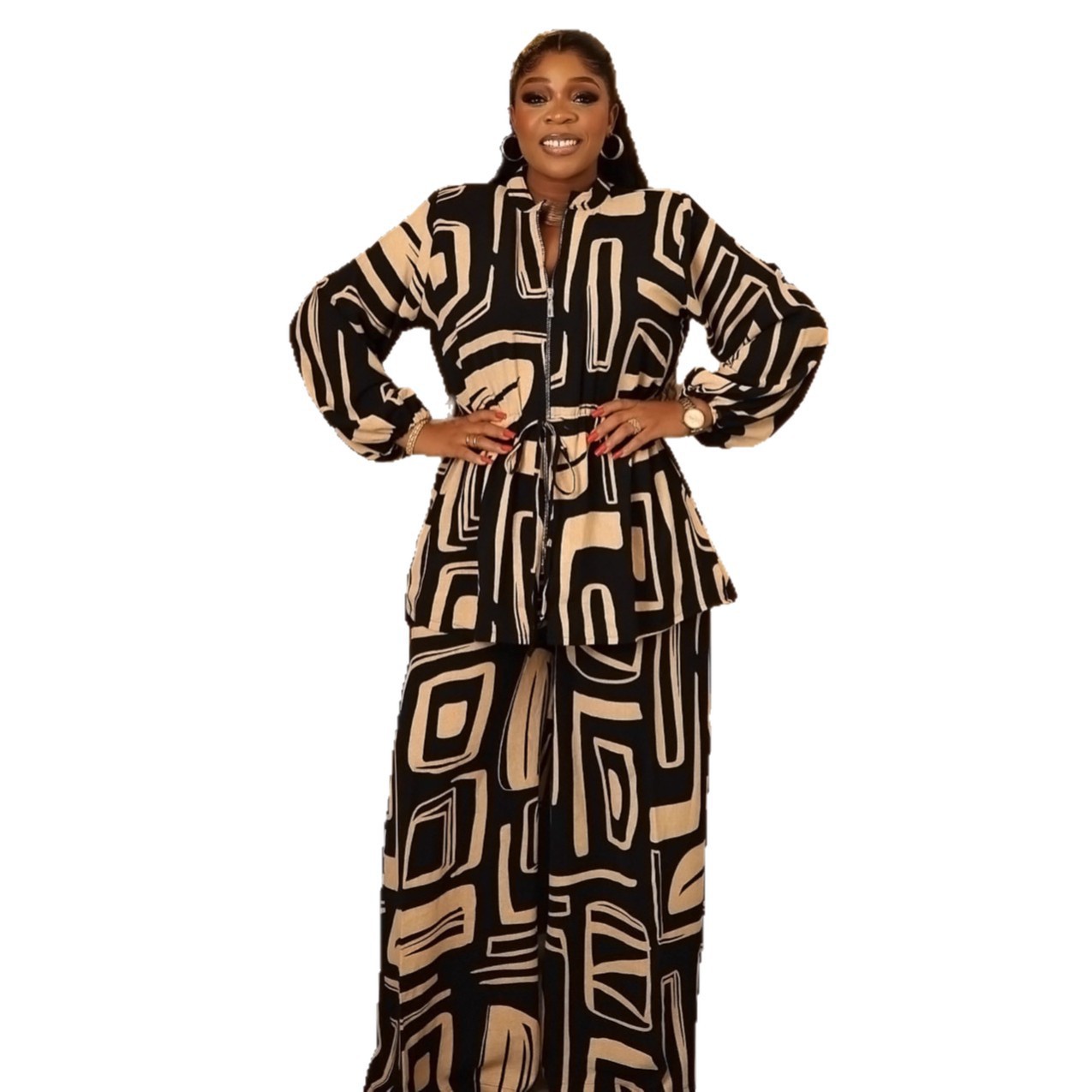 This Elegant Stand Collar Print Drawstring Slim Waist Long Sleeve Two-Piece Pants Set Design Made Of High Quality polyester And Spandex Material. It Is Stretchy, Durable And Comfortable. It Is a Must-Have Outfit For All Seasons. retail Two Piece Pant Sets Can Solve Your cloth selection Troubles. Explore More 2 Piece Pants Set On BamBam retail Women Clothing Online Store.