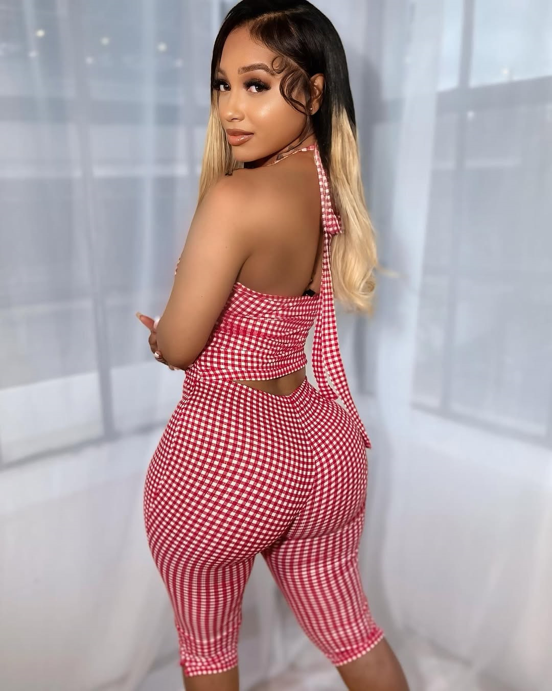 This Fashion Plaid Print Sexy Stretch Short Halter Top Slim Tight Pants Set Design Made Of High Quality polyester And Spandex Material. It Is Stretchy, Durable And Comfortable. It Come With The Top And Shorts. retail Short Sets Saves Some People From The Trouble Of Matching. And For Matchmakers It Is More Flexible Than One-Piece Outfit. Two Piece Short Set Can Be Worn Together Or Individually, Ladies Can Match Them According To Different Occasions. Grab Different Two Piece Short Sets For This Spring And Summer.