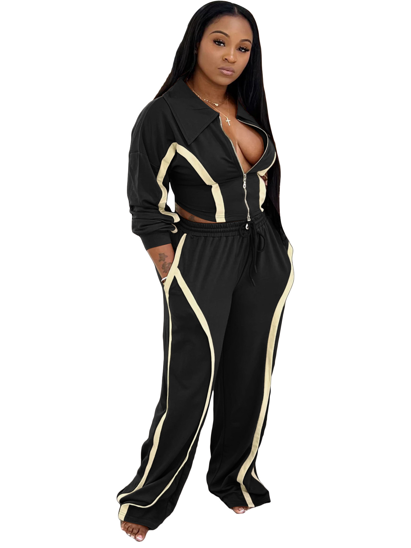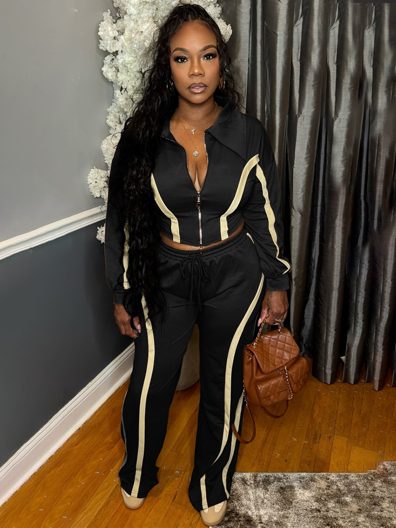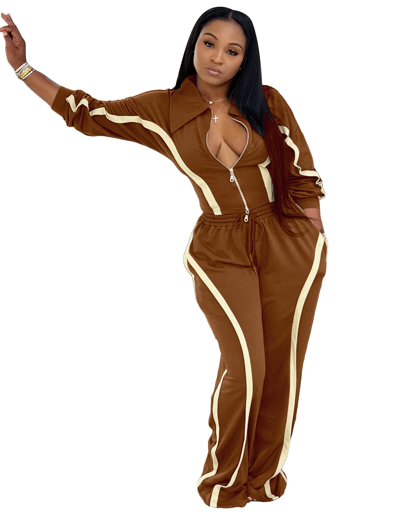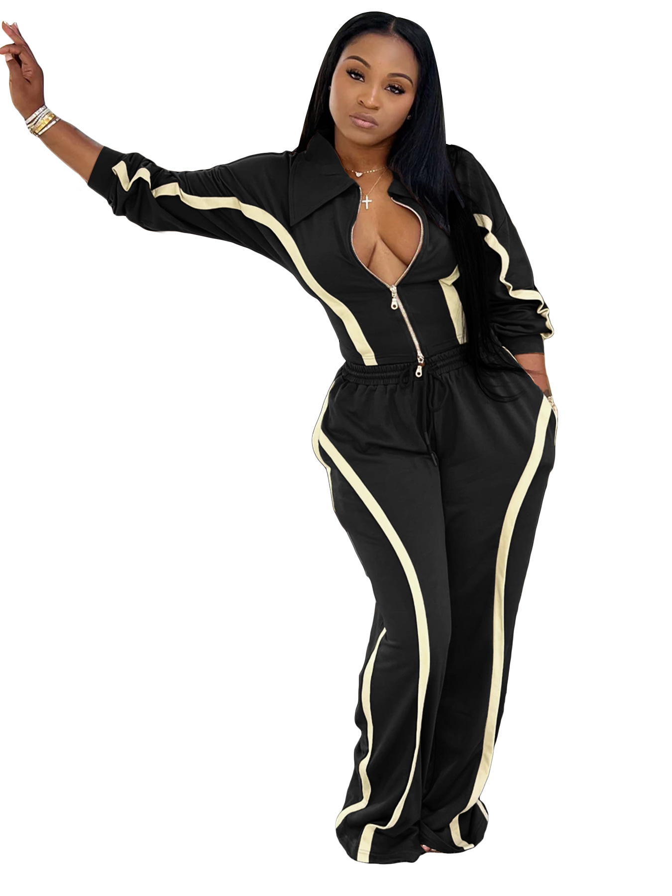This Fashion Women's Striped Patchwork Color Block Zipper Turndown Collar Top Wide Leg Pants Two-Piece Set Design Made Of High Quality polyester And Spandex Material. It Is Stretchy, Durable And Comfortable. It Is a Must-Have Outfit For All Seasons. retail Two Piece Pant Sets Can Solve Your cloth selection Troubles. Explore More 2 Piece Pants Set On BamBam retail Women Clothing Online Store.