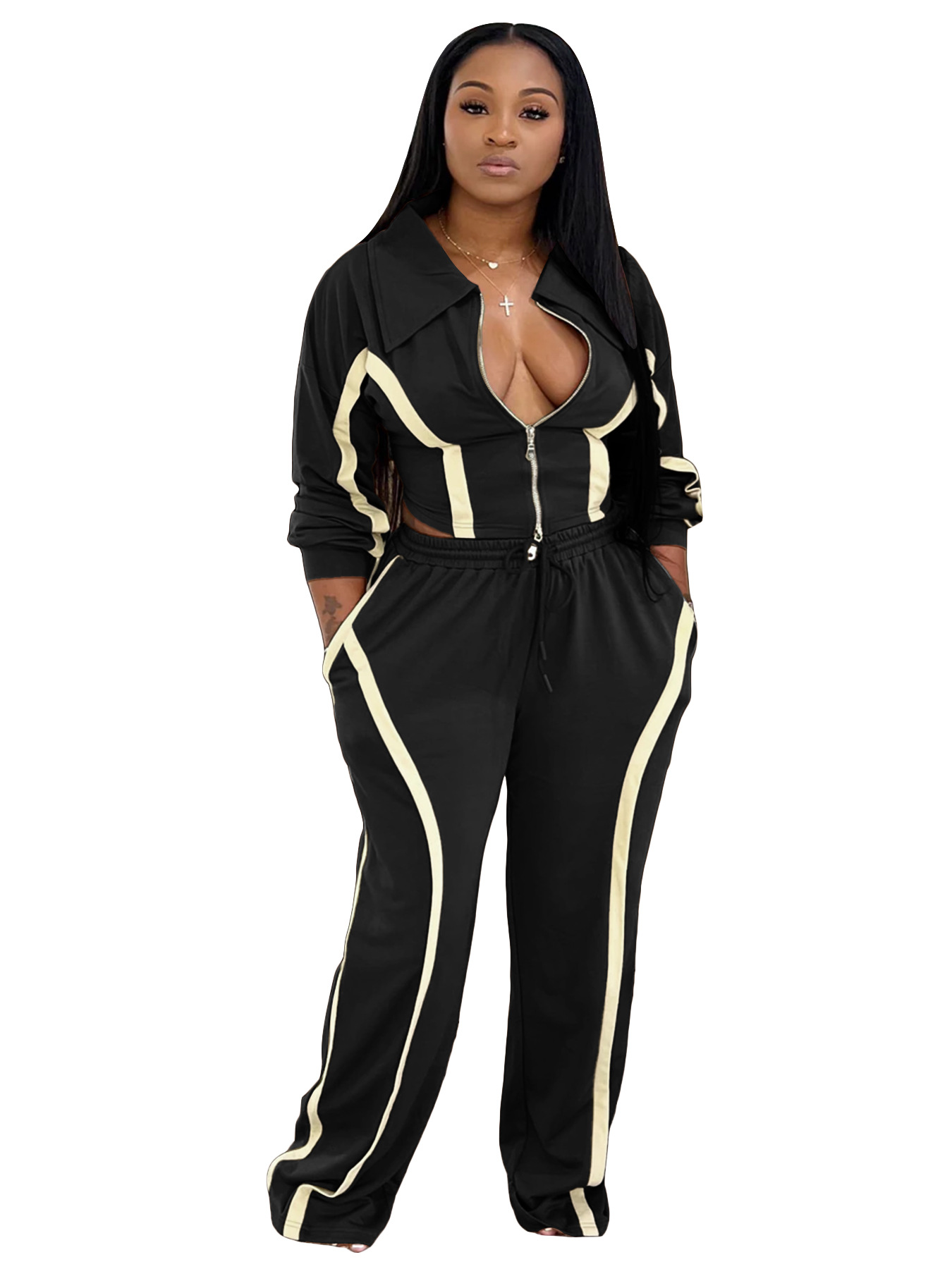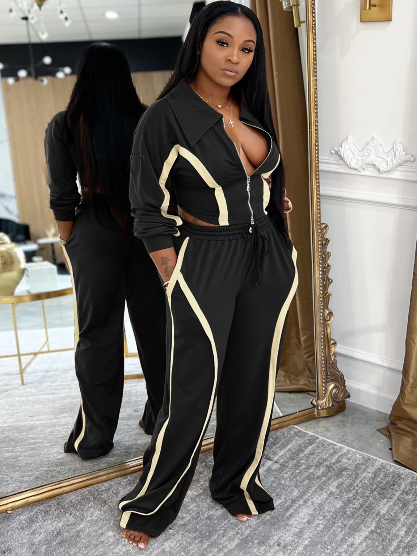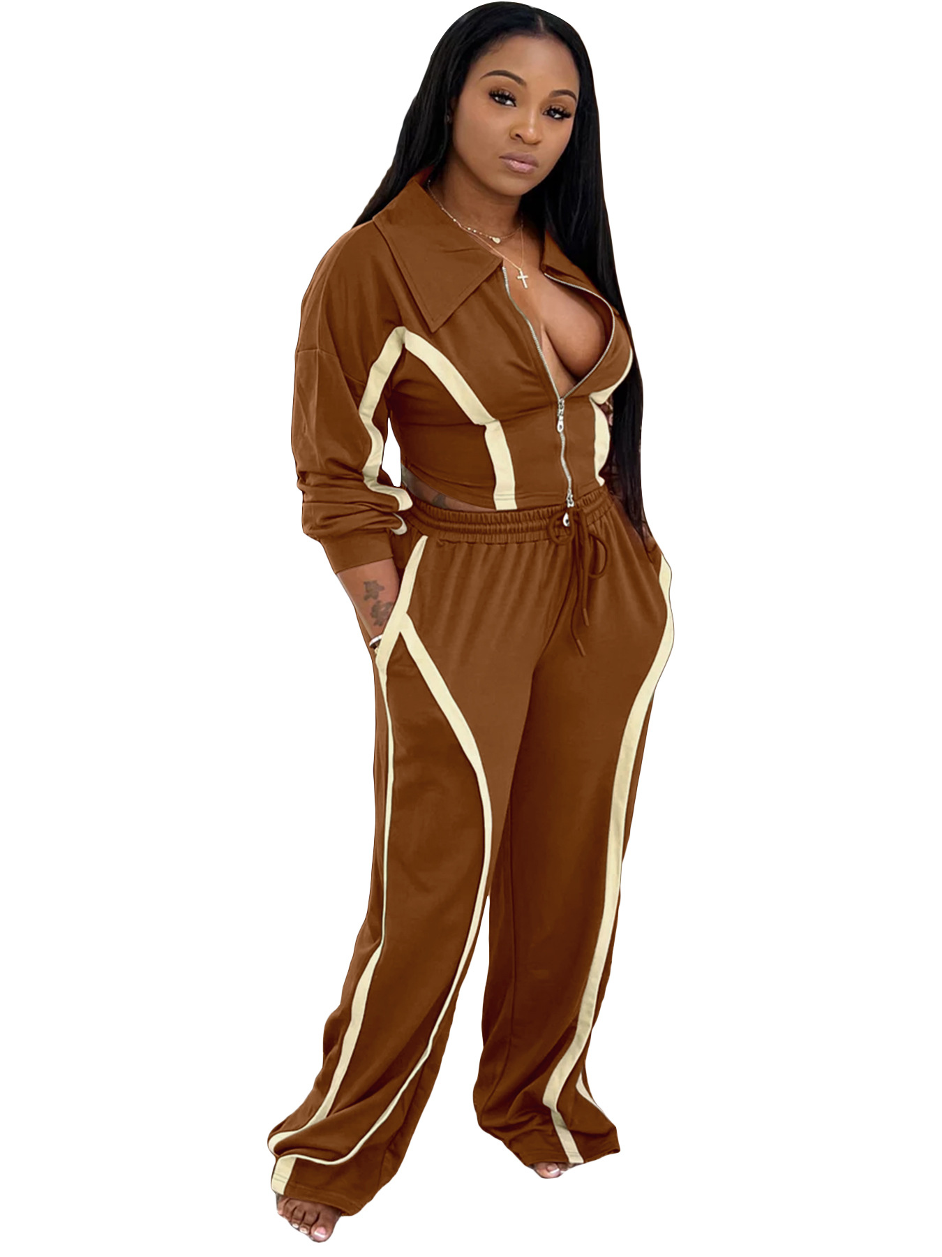 This Fashion Women's Striped Patchwork Color Block Zipper Turndown Collar Top Wide Leg Pants Two-Piece Set Design Made Of High Quality polyester And Spandex Material. It Is Stretchy, Durable And Comfortable. It Is a Must-Have Outfit For All Seasons. retail Two Piece Pant Sets Can Solve Your cloth selection Troubles. Explore More 2 Piece Pants Set On BamBam retail Women Clothing Online Store.