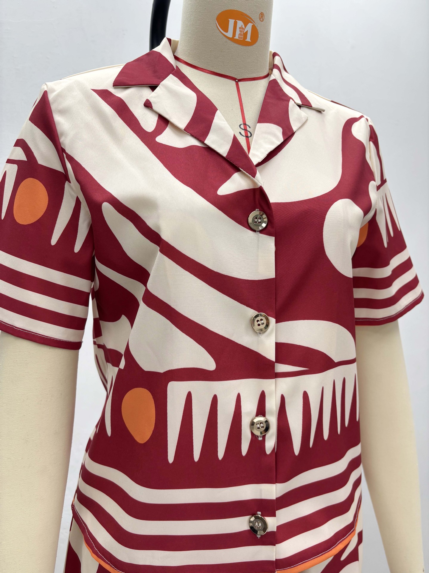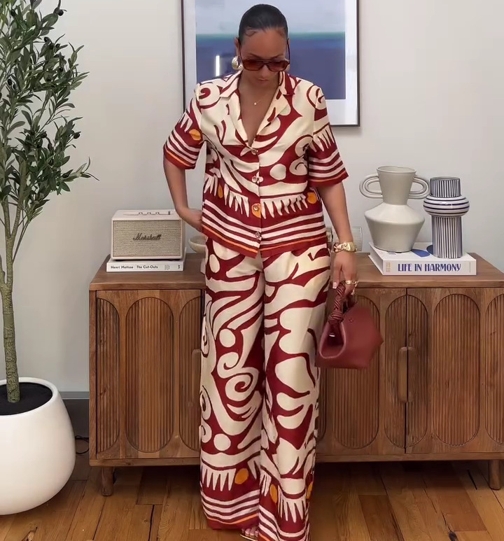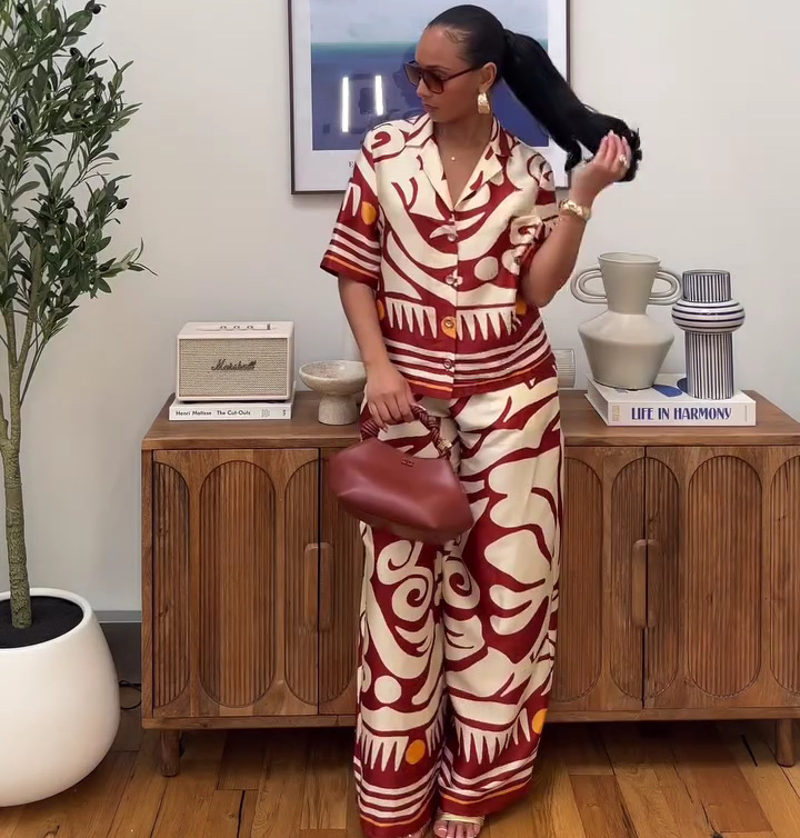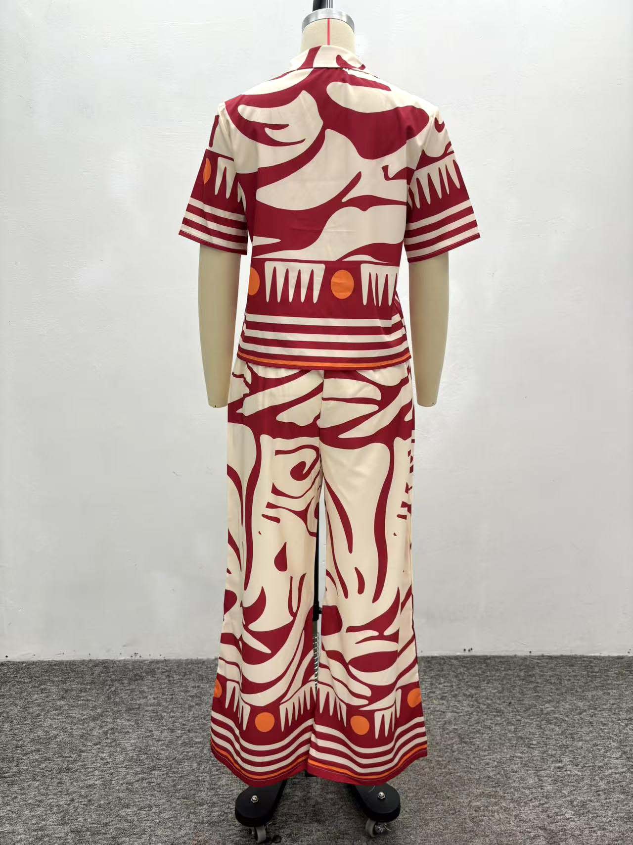 This Fashion Women's Turndown Collar Printed Shirt & High-Waisted Wide-Leg Pants African Chic Elegant Two-Piece Set For Summer Design Made Of High Quality polyester And Spandex Material. It Is Stretchy, Durable And Comfortable. It Is a Must-Have Outfit For All Seasons. retail Two Piece Pant Sets Can Solve Your cloth selection Troubles. Explore More 2 Piece Pants Set On BamBam retail Women Clothing Online Store.