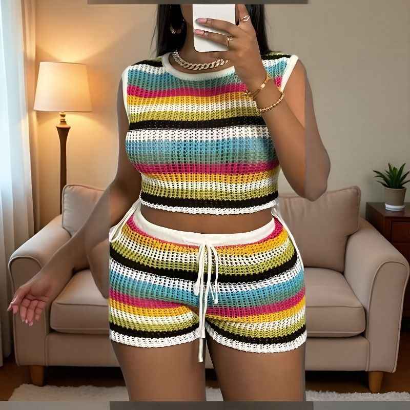 This Knitted Striped Patchwork Two-Piece Shorts Set Women's Casual Outfit Design Made Of High Quality polyester And Spandex Material. It Is Stretchy, Durable And Comfortable. It Come With The Top And Shorts. retail Short Sets Saves Some People From The Trouble Of Matching. And For Matchmakers It Is More Flexible Than One-Piece Outfit. Two Piece Short Set Can Be Worn Together Or Individually, Ladies Can Match Them According To Different Occasions. Grab Different Two Piece Short Sets For This Spring And Summer.