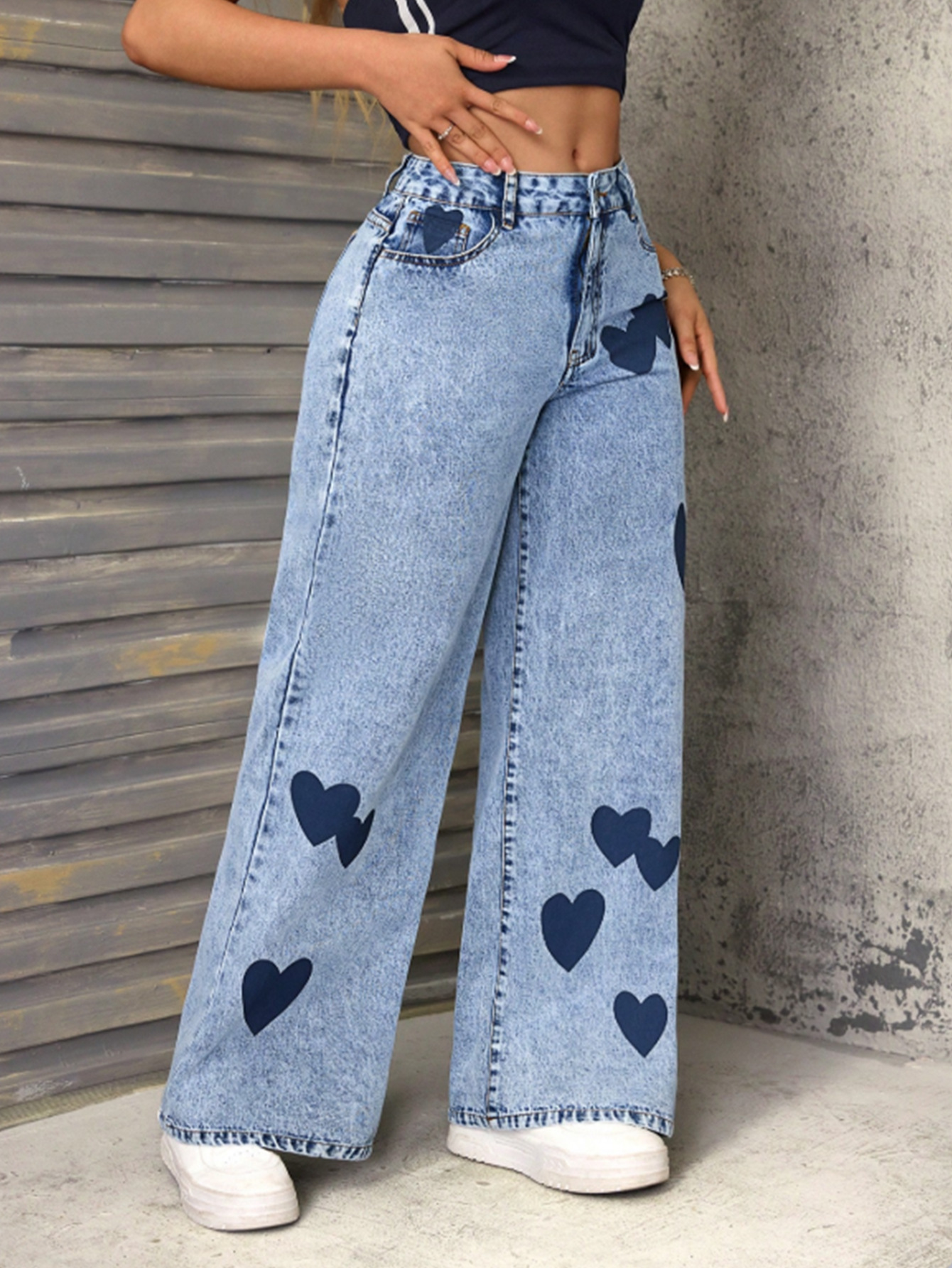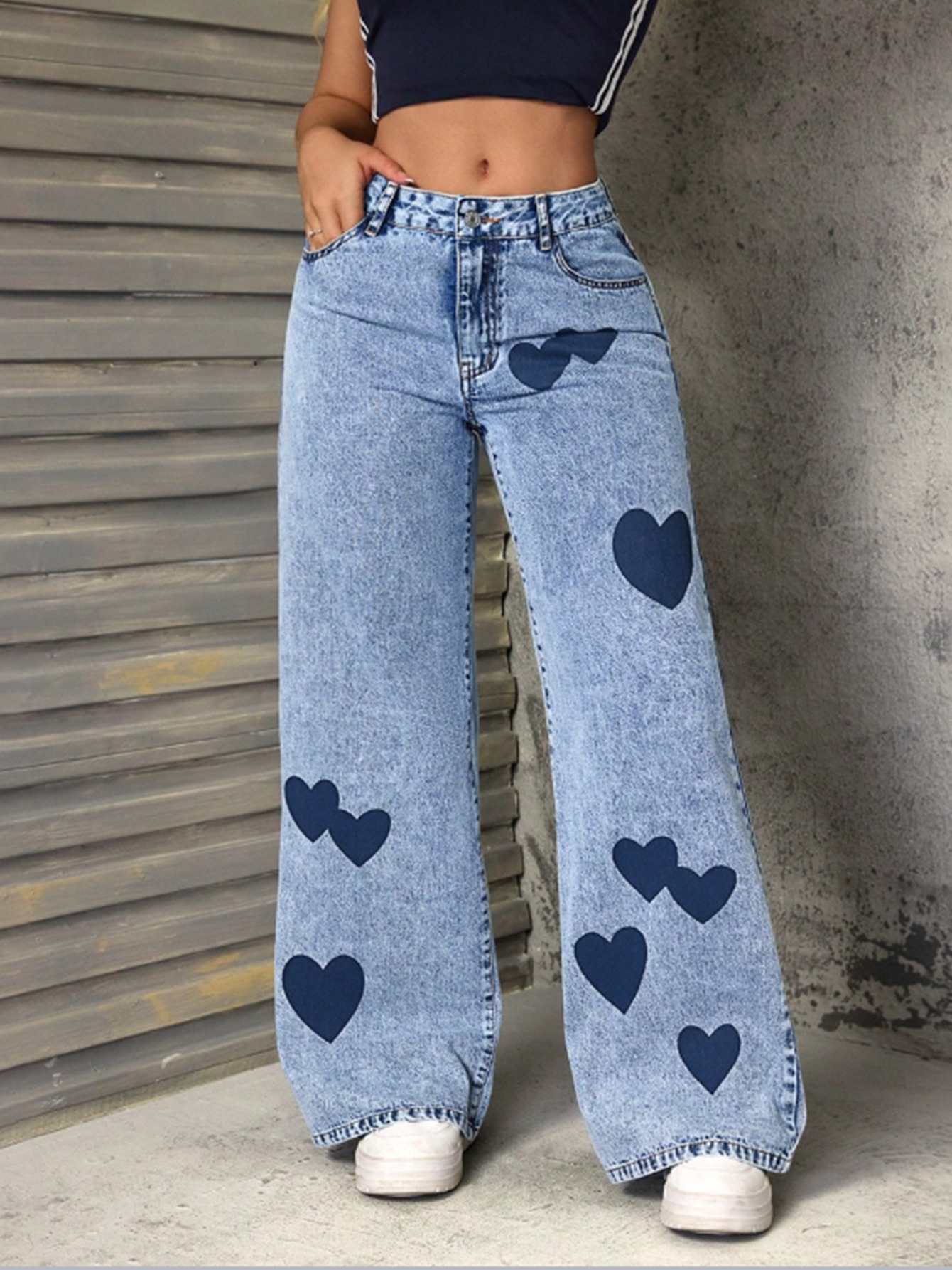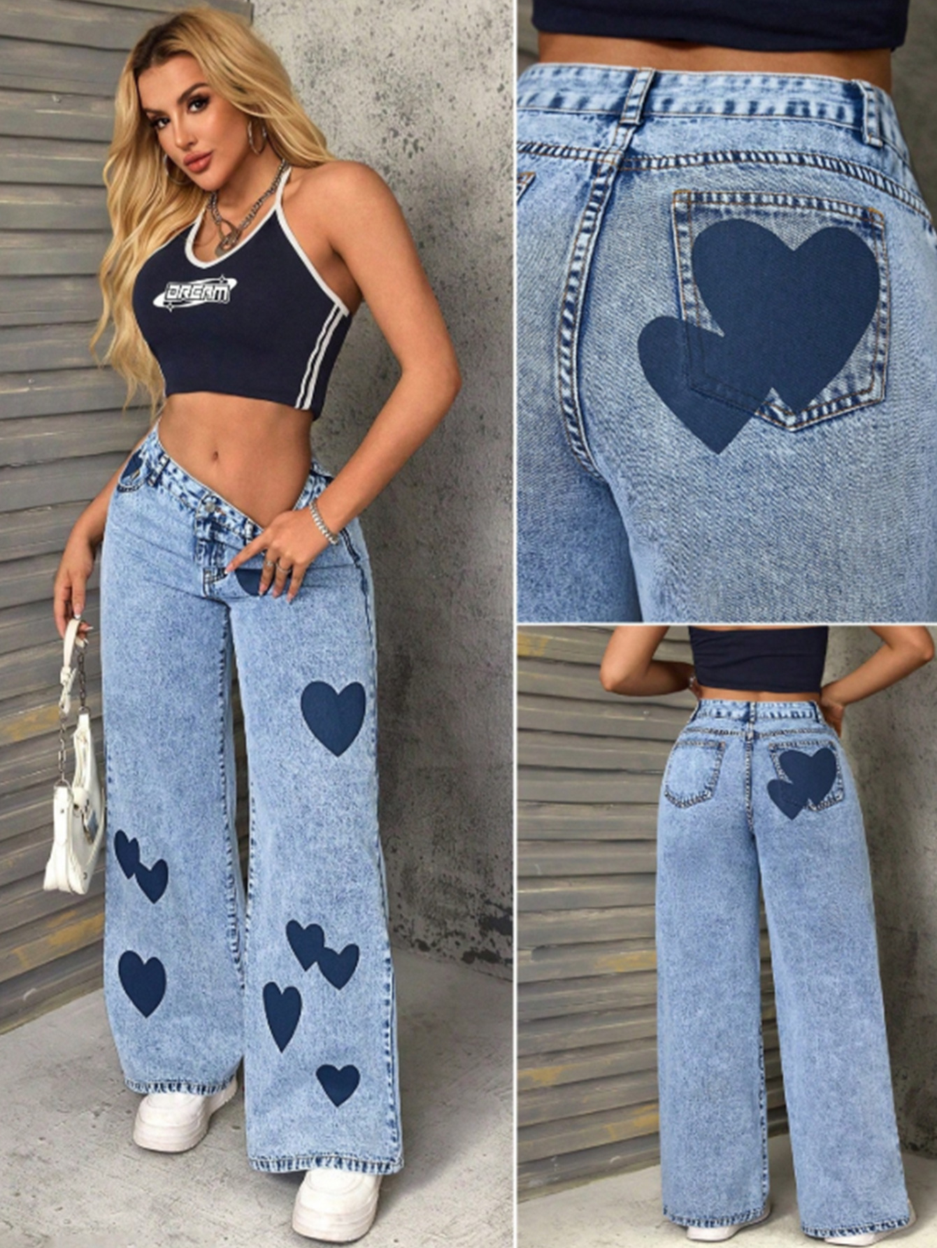 This Loose Heart Print Women's Denim Pants Design Made Of Durable And Stretchy Jeans Fabric. It Is a Must-Have Item For everyday use. Trendy retail Jeans Is a Indispensable Item For Everyday Fashion. Women’s Jeans With High Waist Is a Must Have trouser/pant that helps bring the grace of shape of your legs out even more and fits perfectly snugging your thighs and body gracefully. Grab a Must Have High Waist Jeans retail For Your Closet, Just Choose Different Matching Tops To stay in control of Every Occasion Easily.