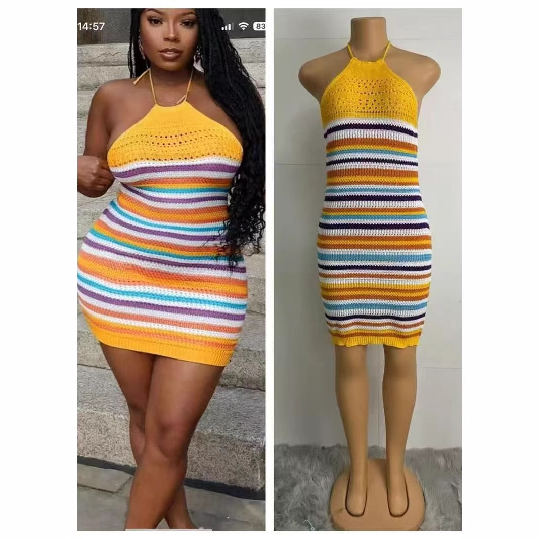 This Rainbow Summer Stripes Sleeveless Sexy Low Back Knitting Dress combines warmth with fashion. It Is a Must-Have Item For This Winter. Sweater Dresses For Women At BamBam are used for Different Occasions - Daily Life, Party Knitting Dresses, And Sweater Dresses For Work. When You Need retail Sweater Dresses, You Can Always Find What You Need On Our retail Female Garment Online Store.