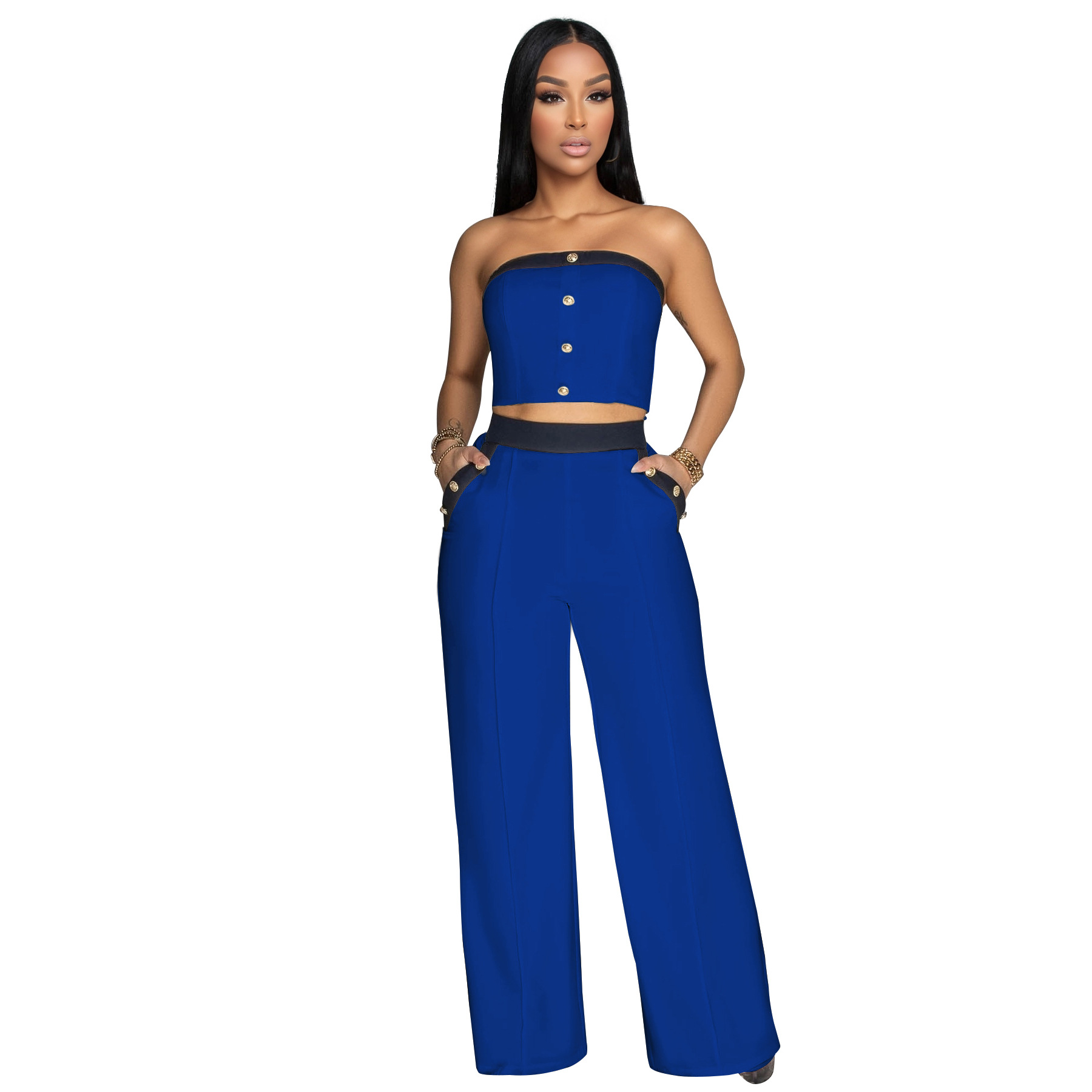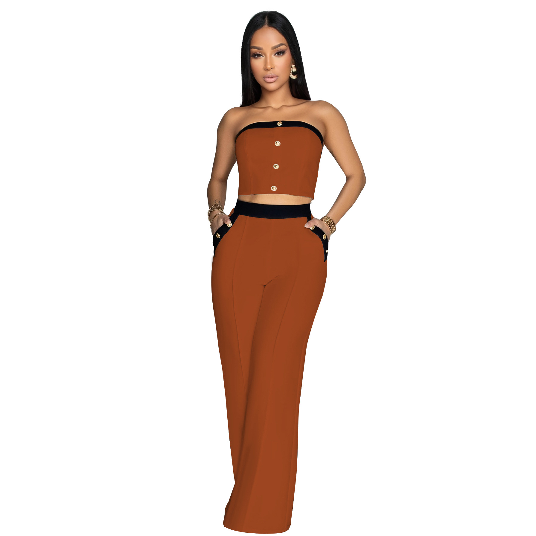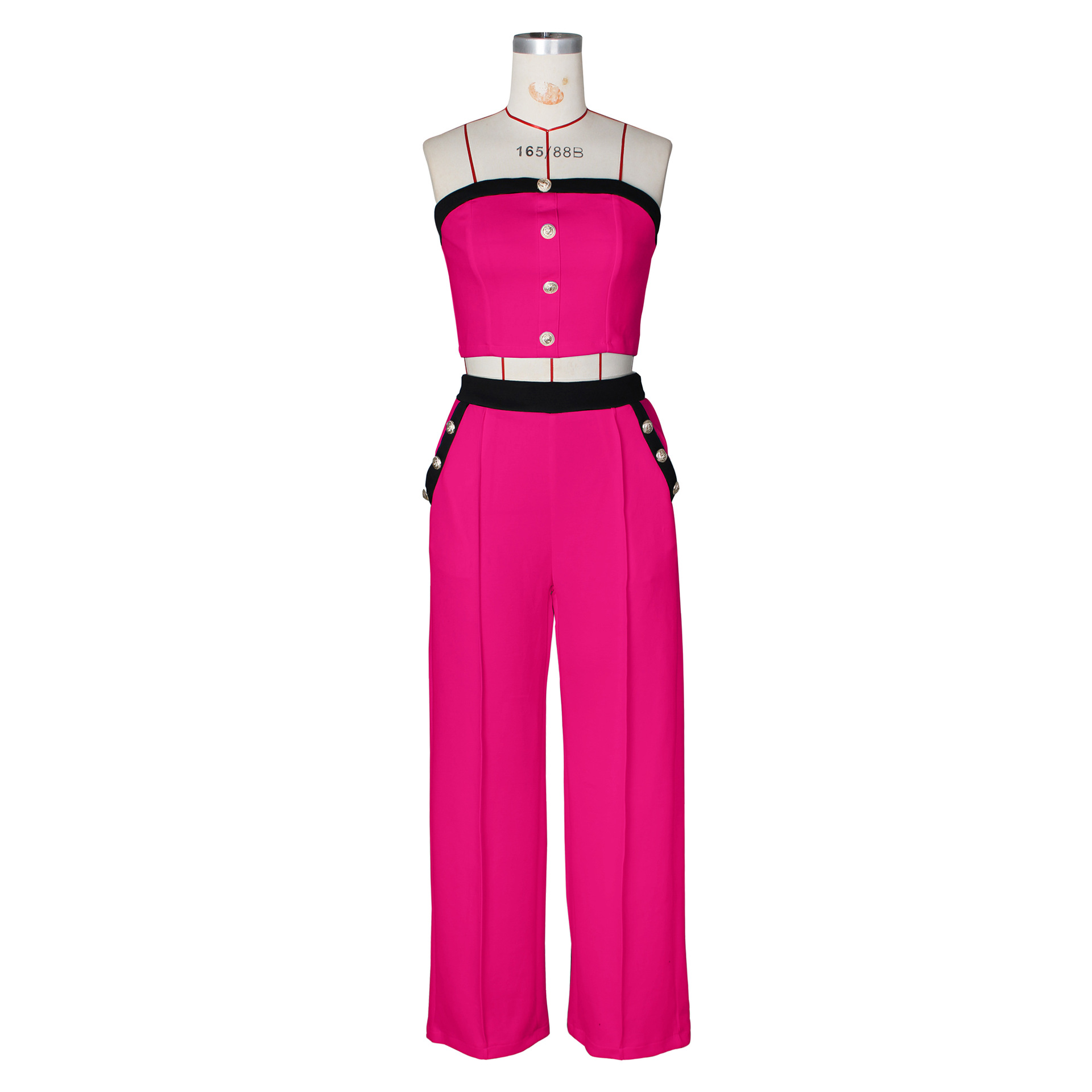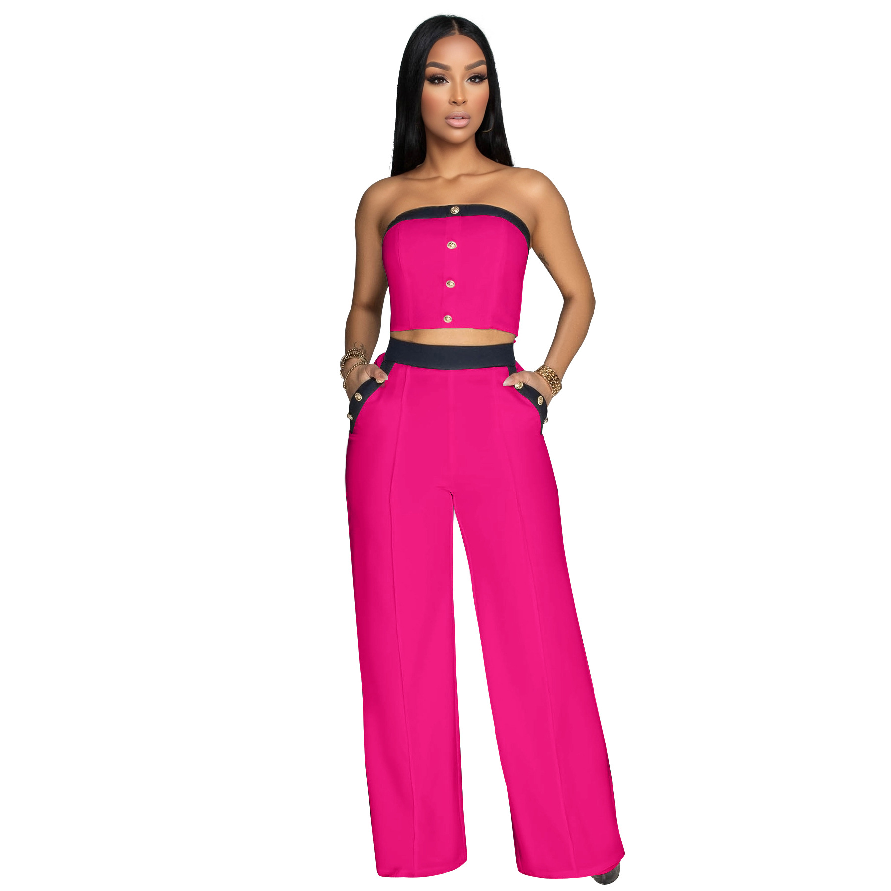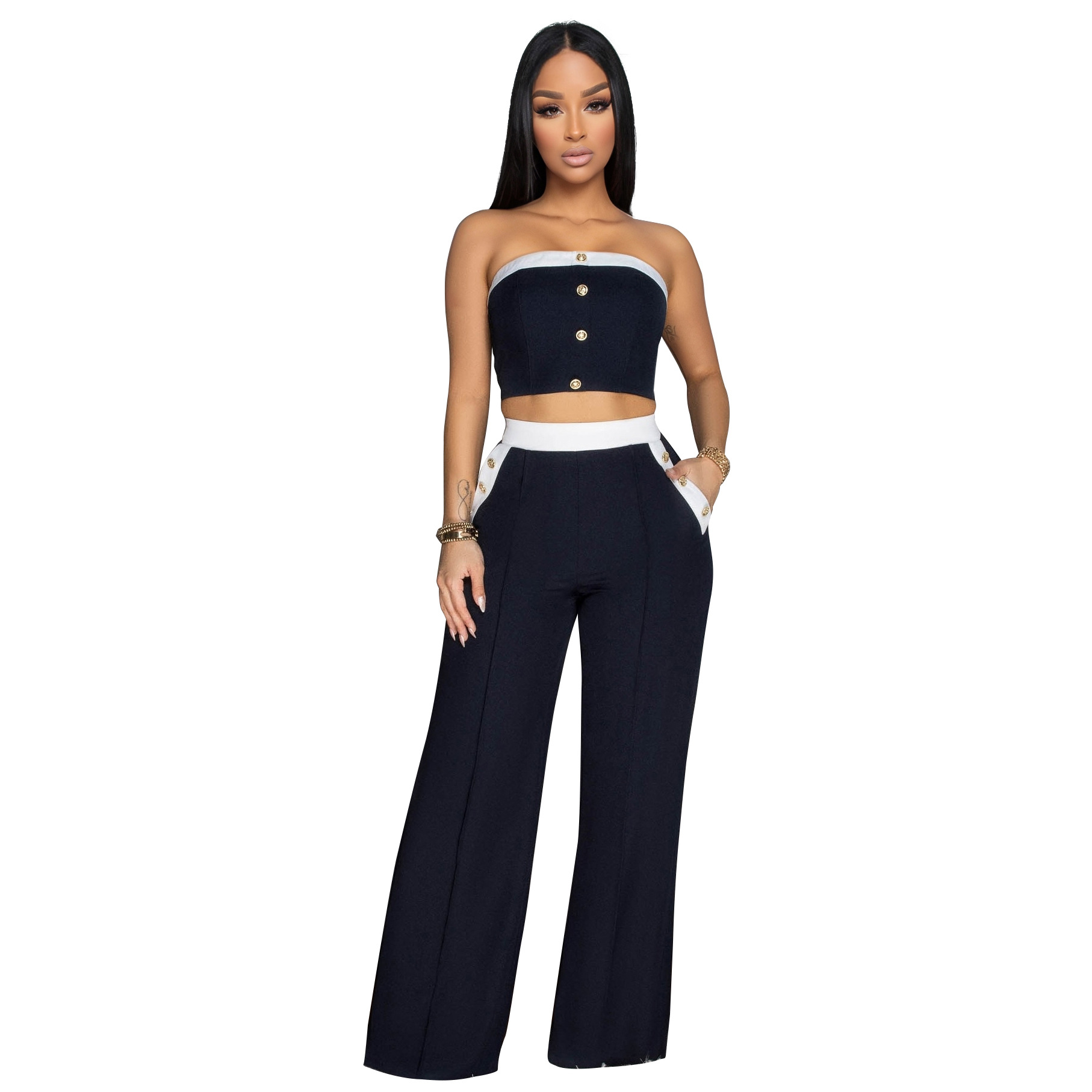 This Sexy Color Blocked Decorative Button Straight High Waist Wide Leg Women's Pants Set Design Made Of High Quality polyester And Spandex Material. It Is Stretchy, Durable And Comfortable. It Is a Must-Have Outfit For All Seasons. retail Two Piece Pant Sets Can Solve Your cloth selection Troubles. Explore More 2 Piece Pants Set On BamBam retail Women Clothing Online Store.