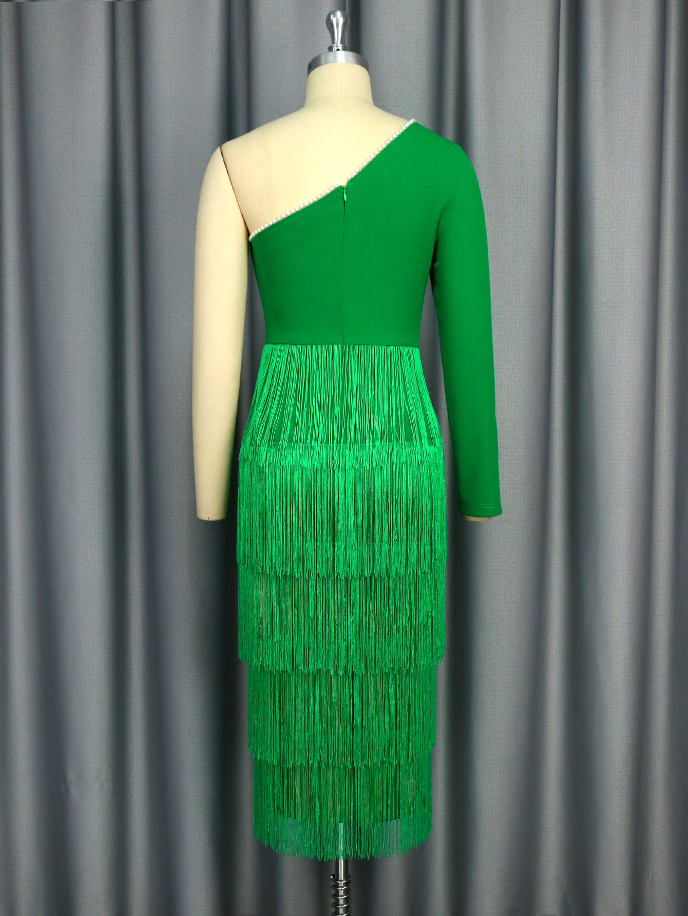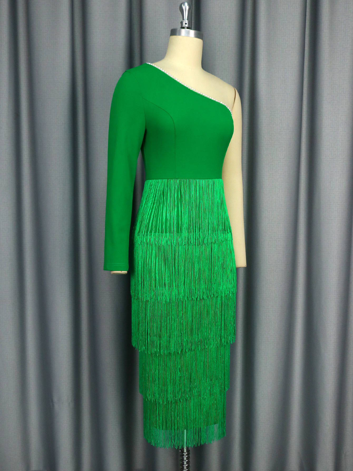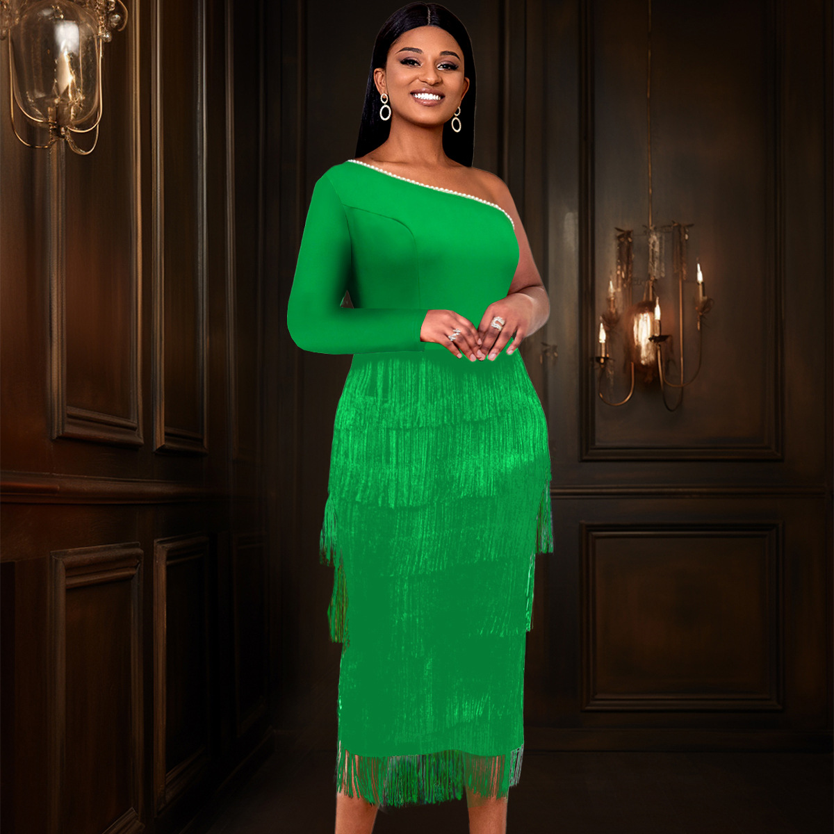 This Sexy One-Shoulder Long-Sleeved High-Waist Slim Tassel Formal Party Evening Dress Design Made Of Good Quality Polyester And Spandex Material, Which Is Stretchy, Durable And Comfortable. The Long Evening Dresses And Gowns Is Always The main Choice For All Kinds Of Parties, Cocktail, Prom, Events, And Dating Occasions. Evening Gowns At BamBam Comes With Huge Selections - Sequins, Beaded, Satin, Velvet, Lace.... When You Need retail Evening Dresses, BamBam retail Women Garment Online Shop Is Your One-Stop Online Shopping Choice.