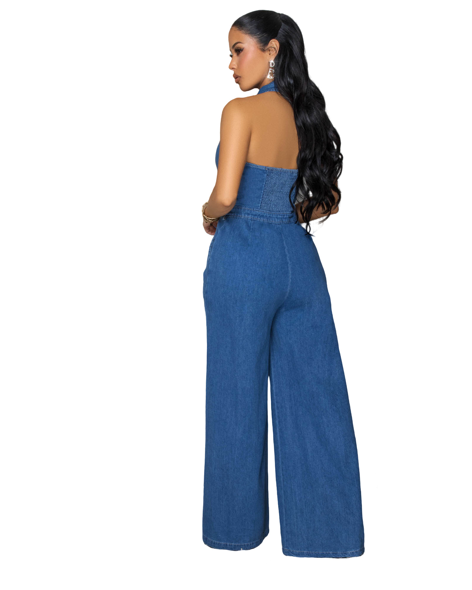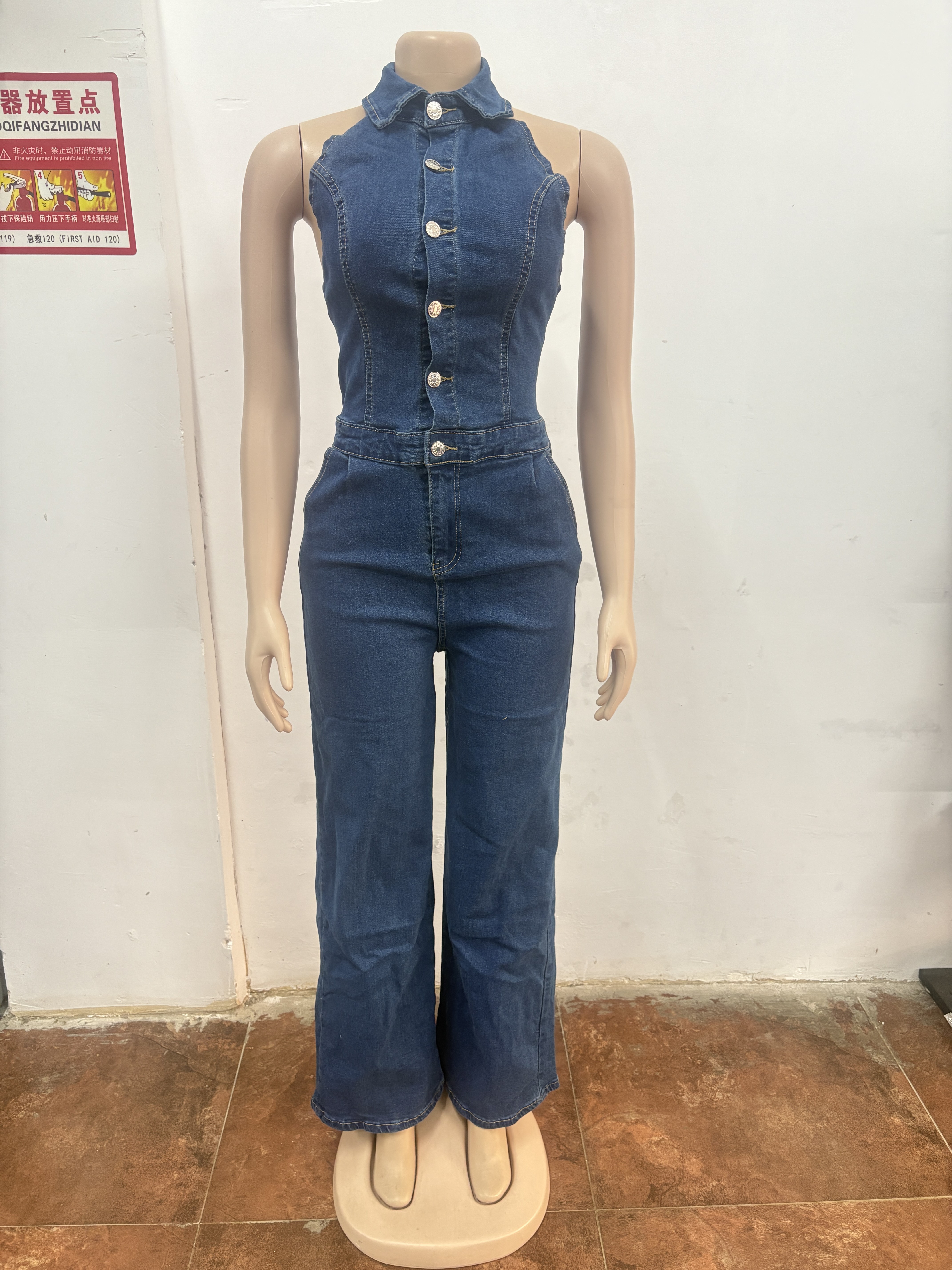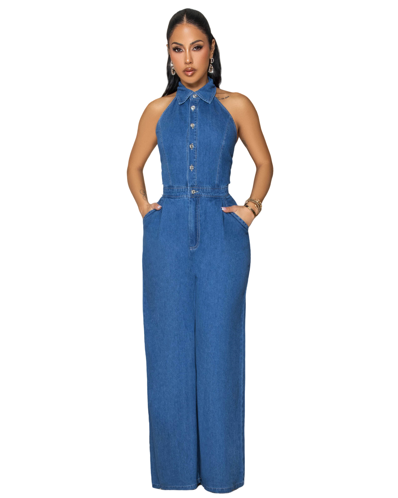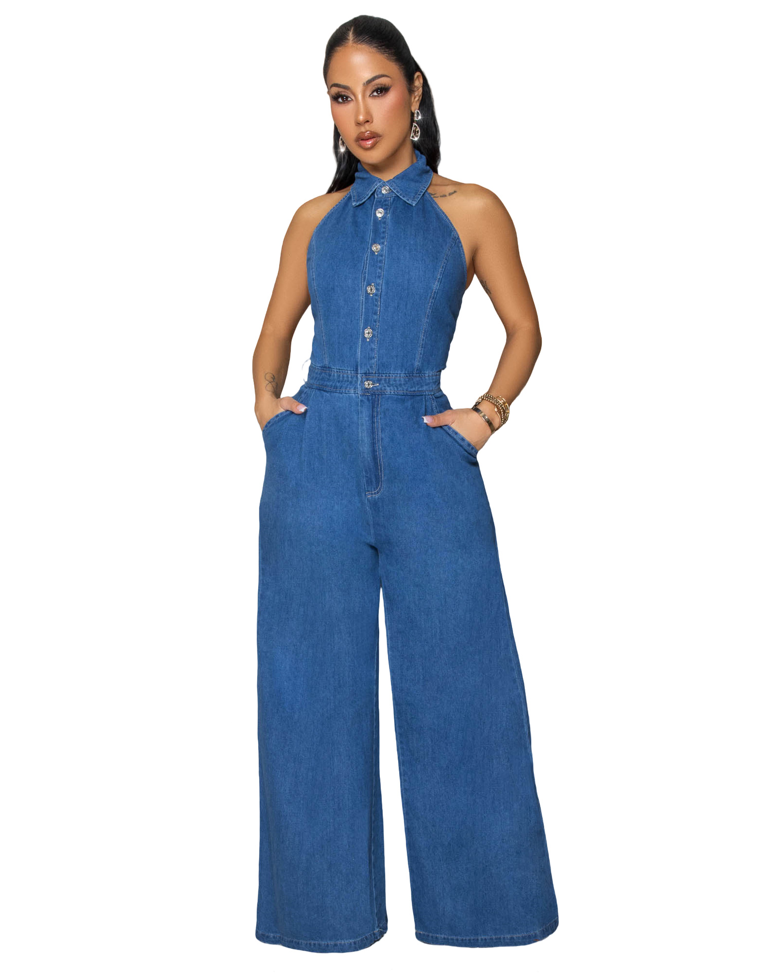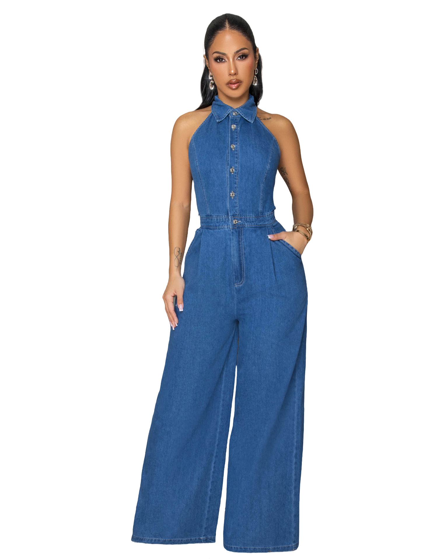 This Sexy Patchwork Halter Neck Wide-Leg Denim Jumpsuit Design Made Of High Quality Polyster And Spandex Material. It Is Stretchy, Durable And Comfortable. Affordable Sexy Jumpsuits For Women Has Long Been a Party Favorite. BamBam provides a Rich selection Of Sequin, Beaded, See Through Mesh, Leopard, Floral Lace, Leather, Velvet, Tight And Fitted retail Jumpsuit Without Moq Limit.