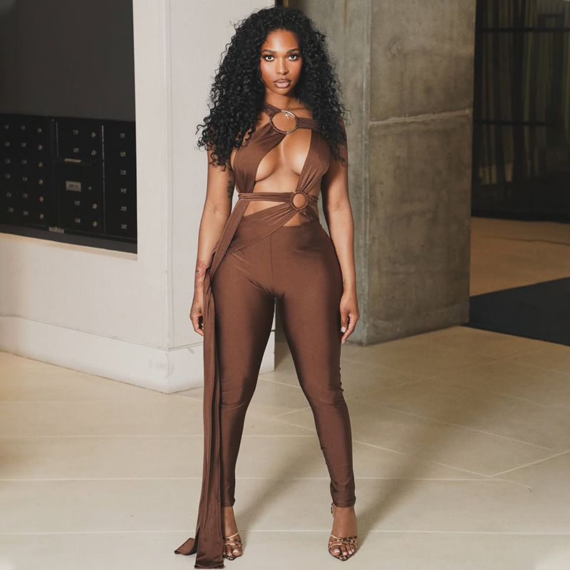 This Sexy Street Style Lace-Up Cut-Out Metal Ring Jumpsuit Solid Tight Slim Romper Design Made Of High Quality Polyster And Spandex Material. It Is Stretchy, Durable And Comfortable. Affordable Sexy Jumpsuits For Women Has Long Been a Party Favorite. BamBam provides a Rich selection Of Sequin, Beaded, See Through Mesh, Leopard, Floral Lace, Leather, Velvet, Tight And Fitted retail Jumpsuit Without Moq Limit.