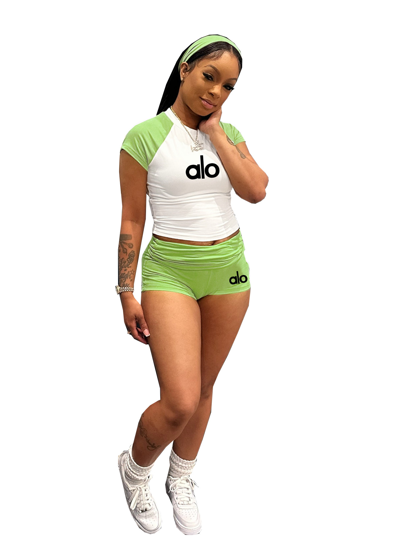 This Street Color-Block Short Sleeve High Waist Casual Sport Shorts Set With Headband Design Made Of High Quality polyester And Spandex Material. It Is Stretchy, Durable And Comfortable. It Come With The Top And Shorts. retail Short Sets Saves Some People From The Trouble Of Matching. And For Matchmakers It Is More Flexible Than One-Piece Outfit. Two Piece Short Set Can Be Worn Together Or Individually, Ladies Can Match Them According To Different Occasions. Grab Different Two Piece Short Sets For This Spring And Summer.