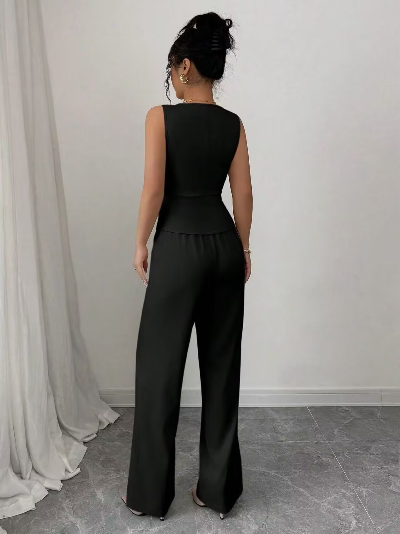 This Summer Solid v-Neck Sleeveless Slim Vest High-Waist Trousers Two-Piece Set Design Made Of High Quality polyester And Spandex Material. It Is Stretchy, Durable And Comfortable. It Is a Must-Have Outfit For All Seasons. retail Two Piece Pant Sets Can Solve Your cloth selection Troubles. Explore More 2 Piece Pants Set On BamBam retail Women Clothing Online Store.