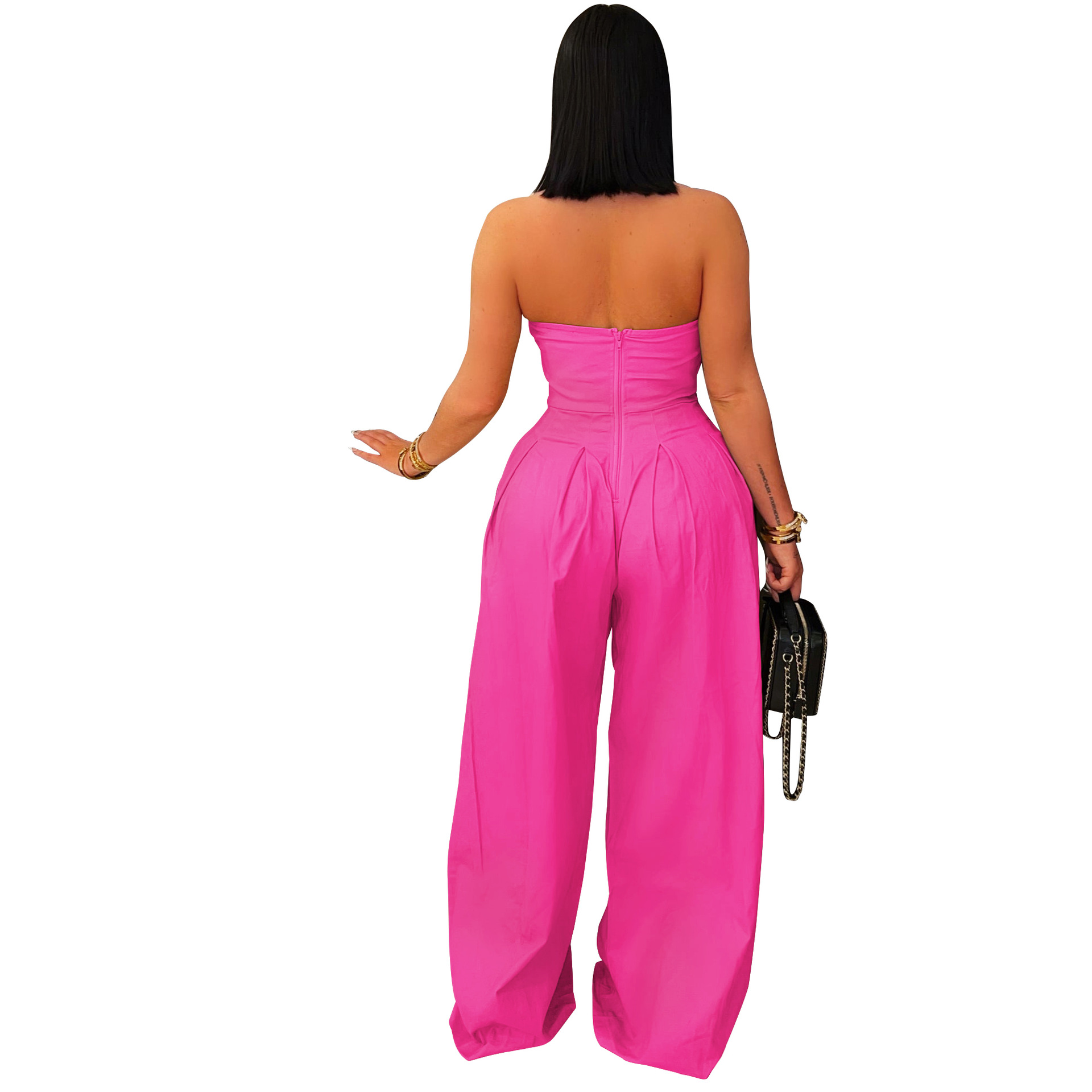 This Summer Strapless Metal Button Wide-Leg Jumpsuit Design Made Of High Quality Polyster And Spandex Material. It Is Stretchy, Durable And Comfortable. Affordable Sexy Jumpsuits For Women Has Long Been a Party Favorite. BamBam provides a Rich selection Of Sequin, Beaded, See Through Mesh, Leopard, Floral Lace, Leather, Velvet, Tight And Fitted retail Jumpsuit Without Moq Limit.