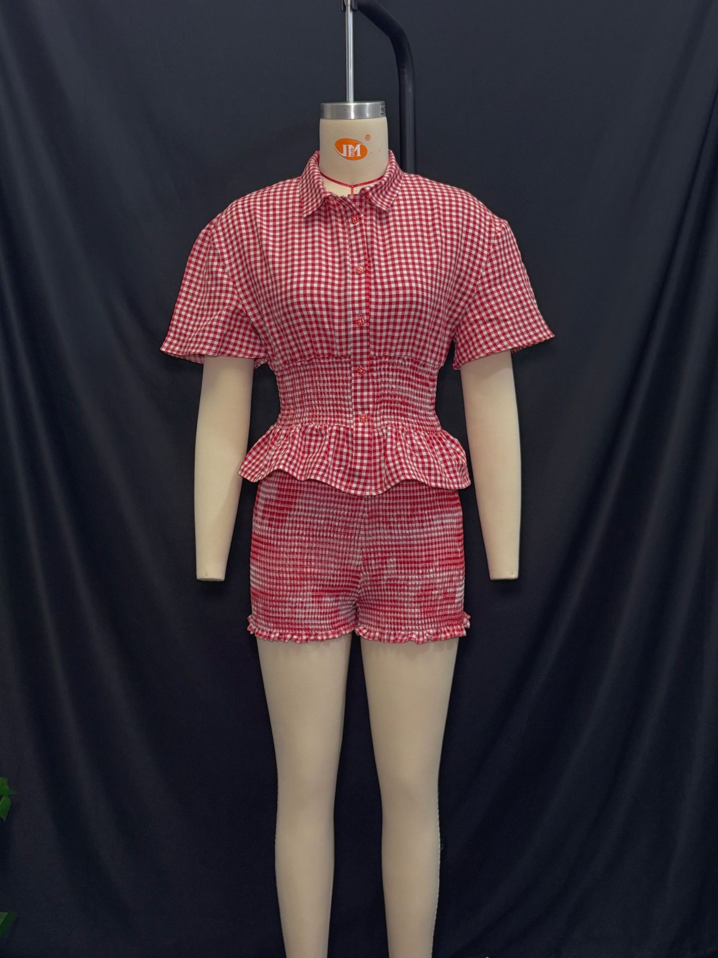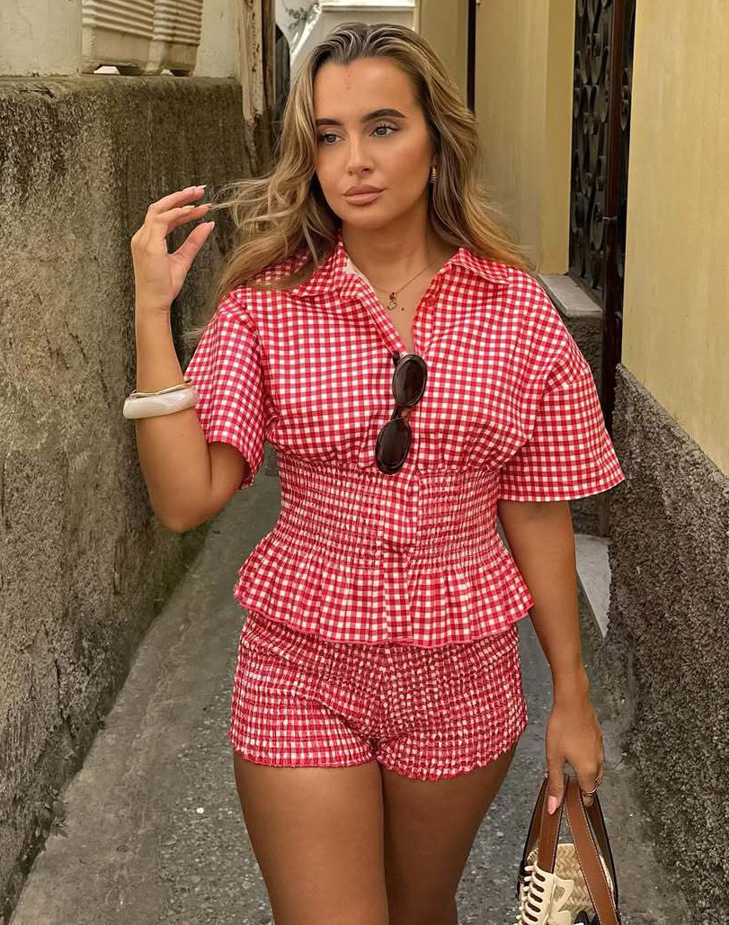 This Summer Sweet Red And White Plaid Short-Sleeved Turndown Collar Shorts Set Design Made Of High Quality polyester And Spandex Material. It Is Stretchy, Durable And Comfortable. It Come With The Top And Shorts. retail Short Sets Saves Some People From The Trouble Of Matching. And For Matchmakers It Is More Flexible Than One-Piece Outfit. Two Piece Short Set Can Be Worn Together Or Individually, Ladies Can Match Them According To Different Occasions. Grab Different Two Piece Short Sets For This Spring And Summer.