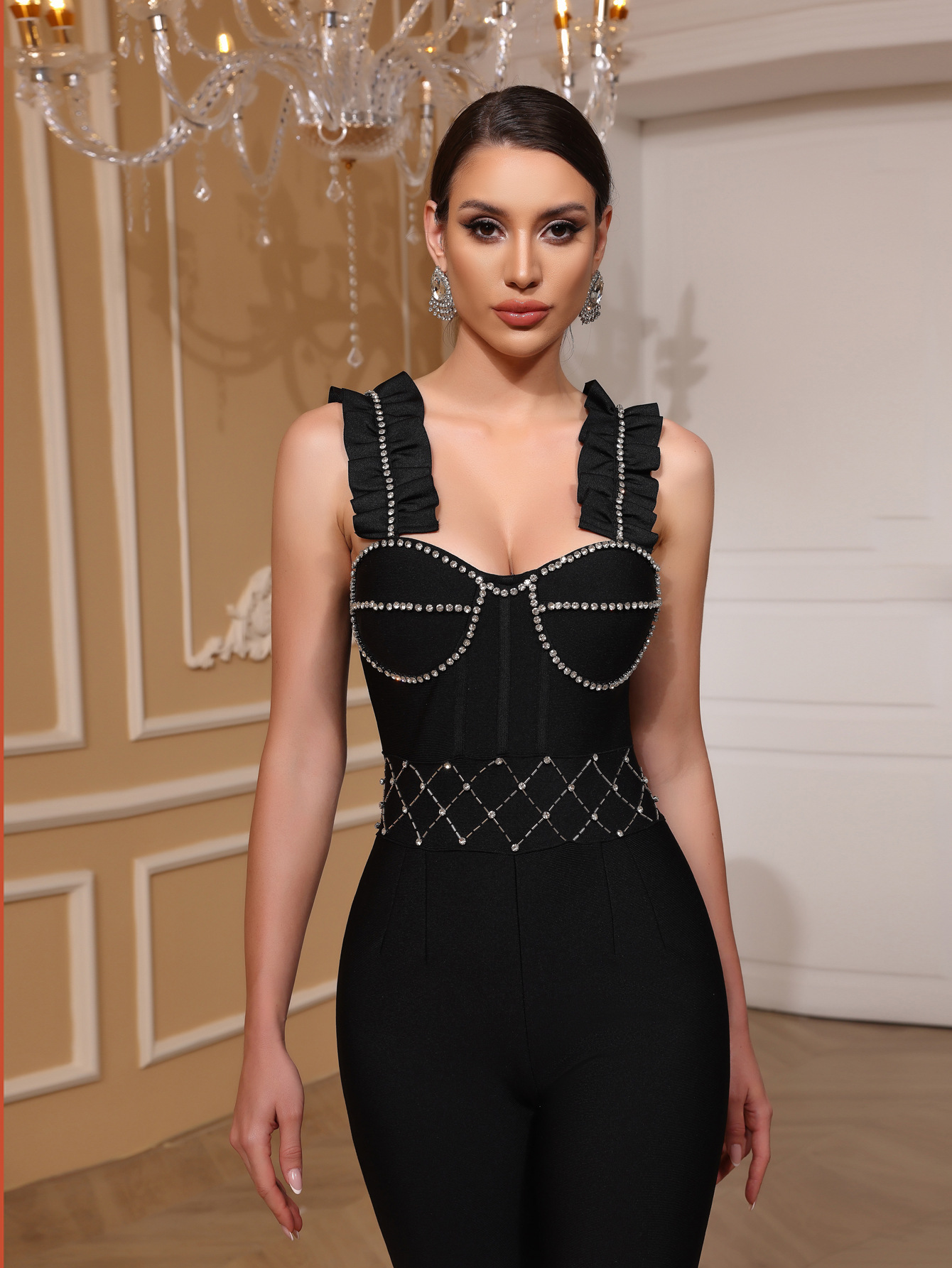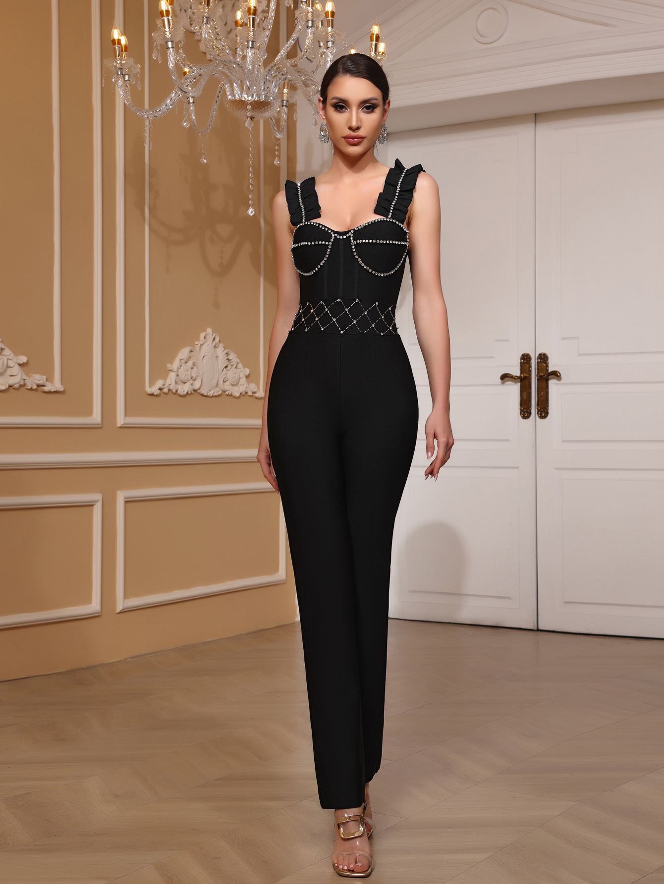 This Sweetheart Neck Low Back Slim Fit Ruffle Rhinestone Sleeveless Party Bandage Jumpsuit Design Made Of High Quality Polyster And Spandex Material. It Is Stretchy, Durable And Comfortable. Affordable Sexy Jumpsuits For Women Has Long Been a Party Favorite. BamBam provides a Rich selection Of Sequin, Beaded, See Through Mesh, Leopard, Floral Lace, Leather, Velvet, Tight And Fitted retail Jumpsuit Without Moq Limit.