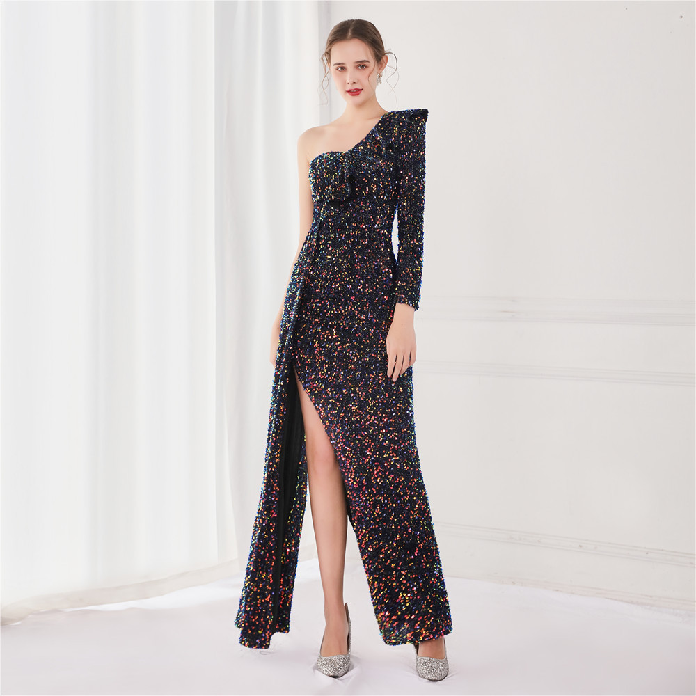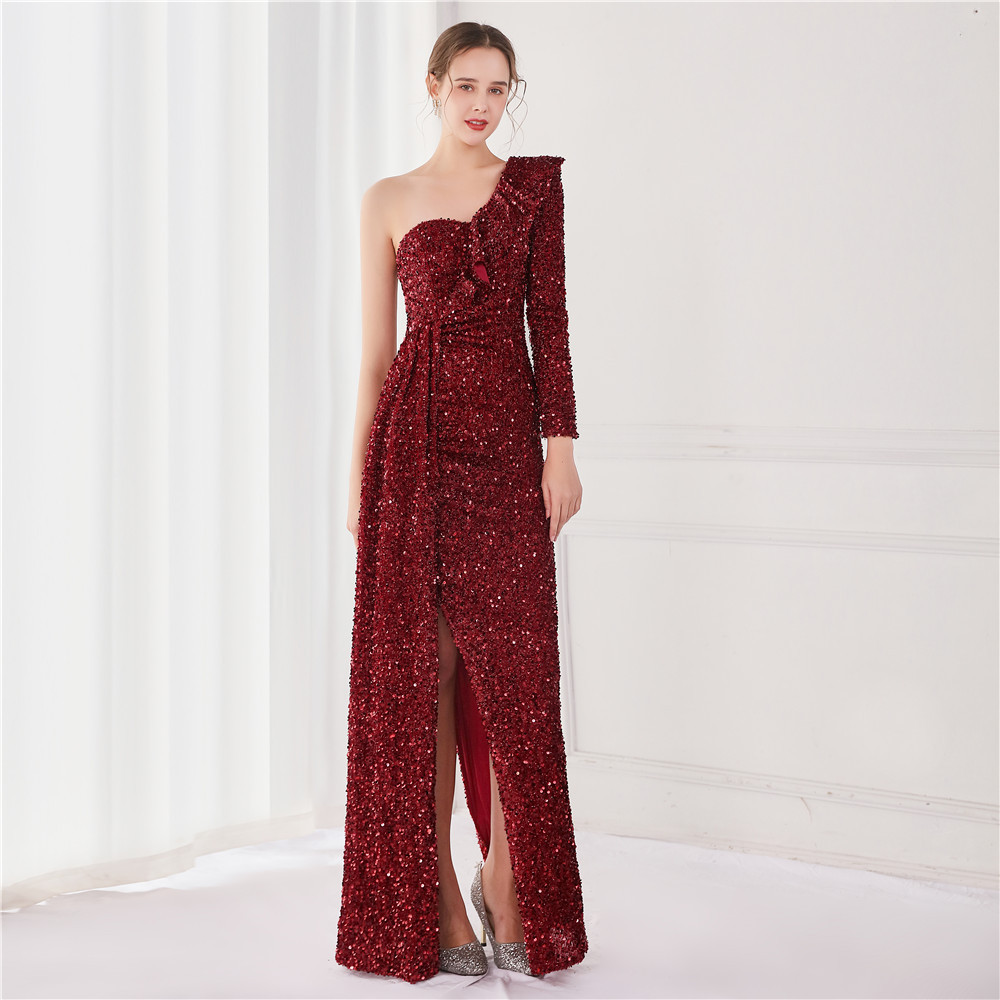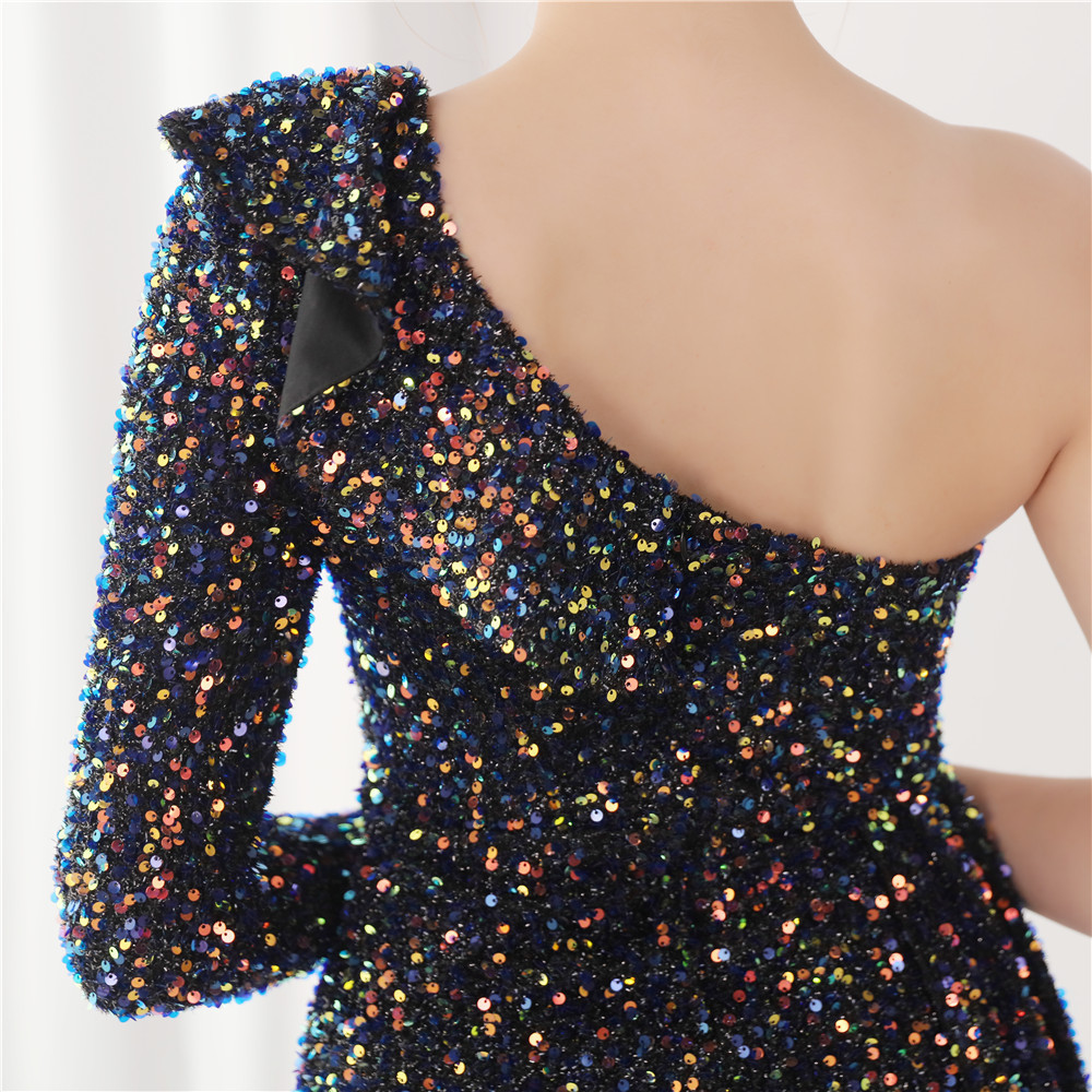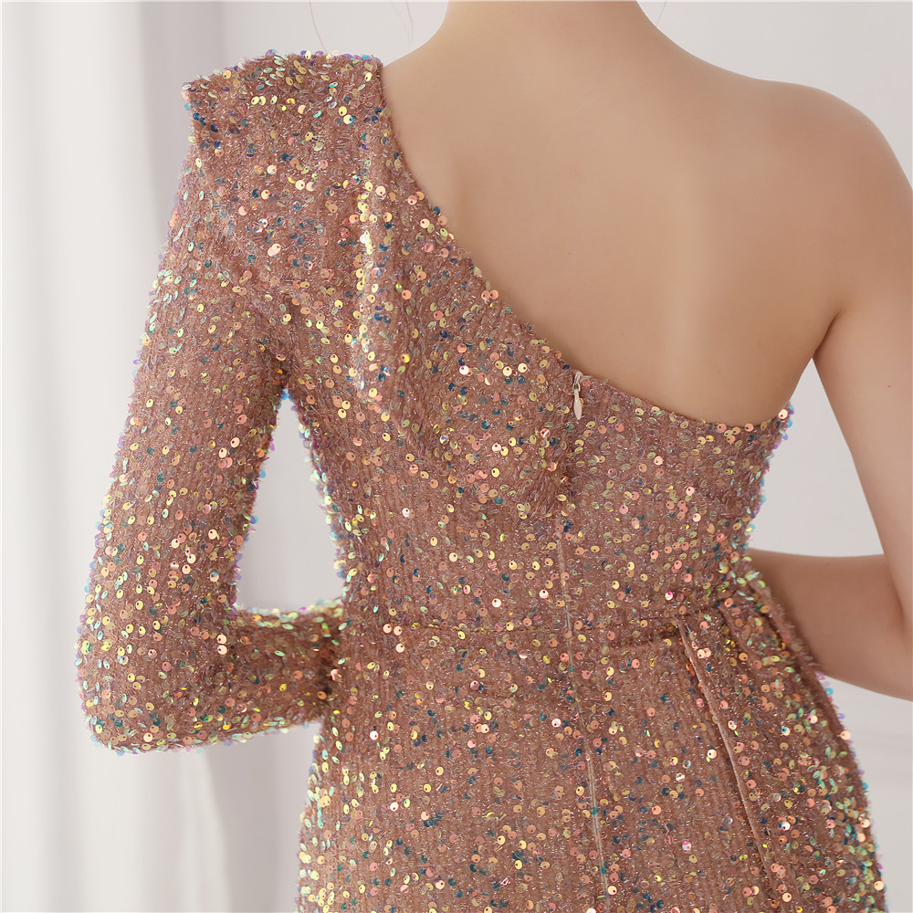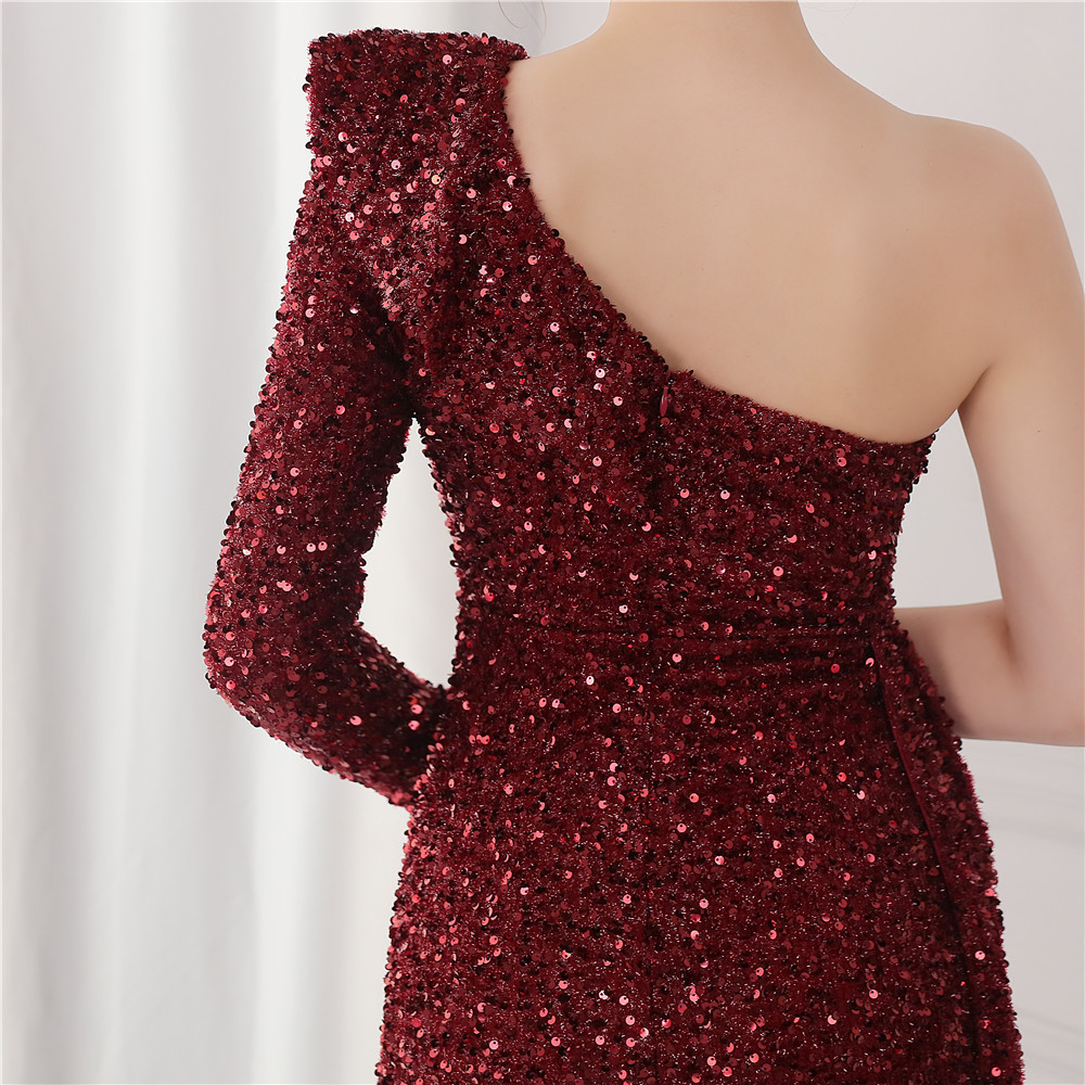 This Winter Elegant Sequins Ruffled One Shoulder Long Sleeve Slit Formal Party Evening Dress Design Made Of Good Quality Polyester And Spandex Material, Which Is Stretchy, Durable And Comfortable. The Long Evening Dresses And Gowns Is Always The main Choice For All Kinds Of Parties, Cocktail, Prom, Events, And Dating Occasions. Evening Gowns At BamBam Comes With Huge Selections - Sequins, Beaded, Satin, Velvet, Lace.... When You Need retail Evening Dresses, BamBam retail Women Garment Online Shop Is Your One-Stop Online Shopping Choice.