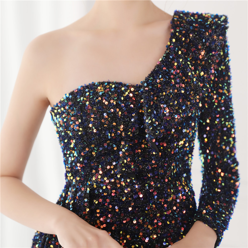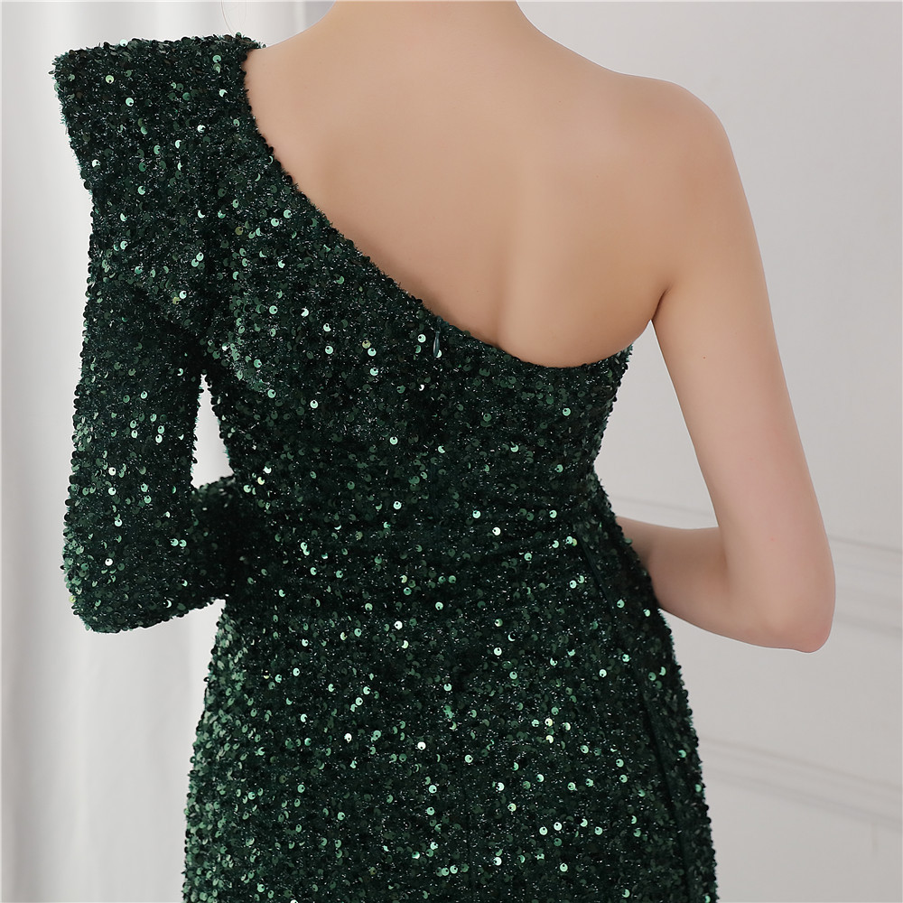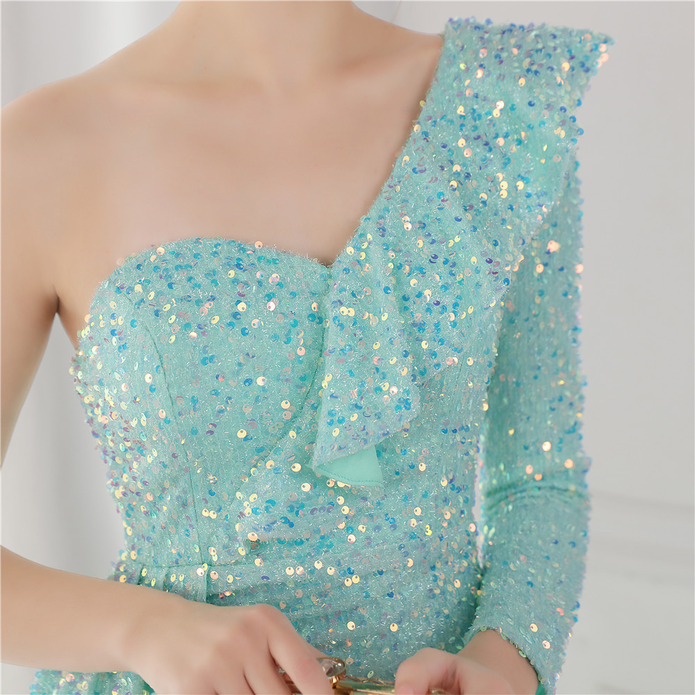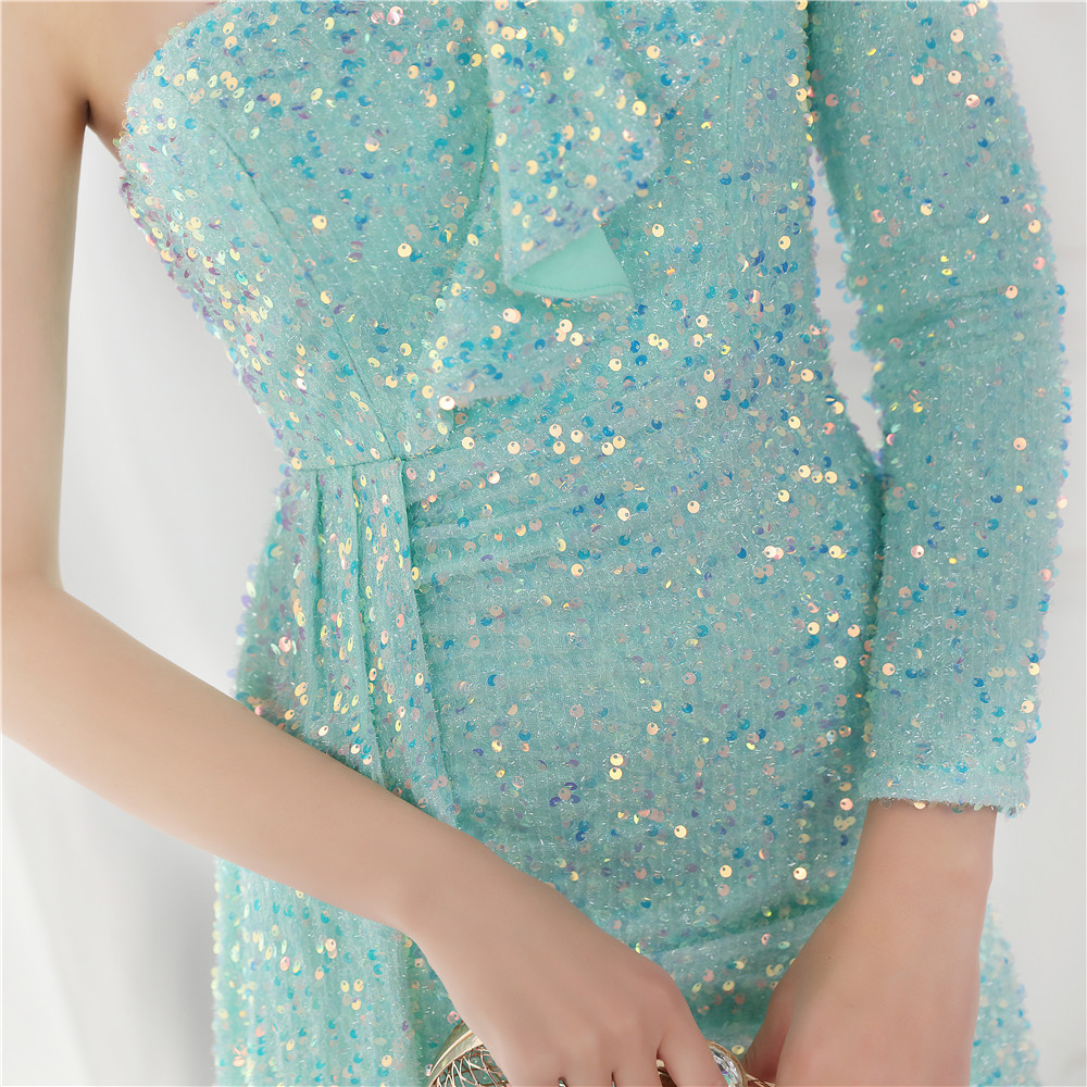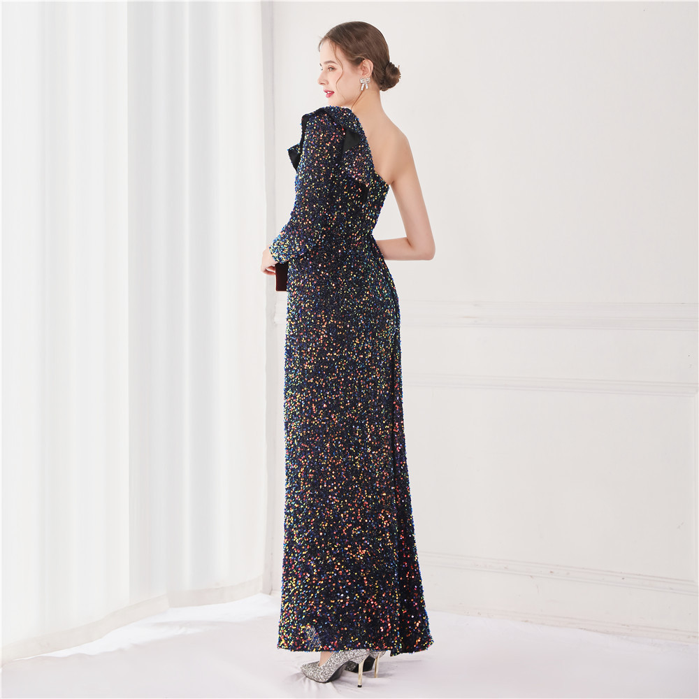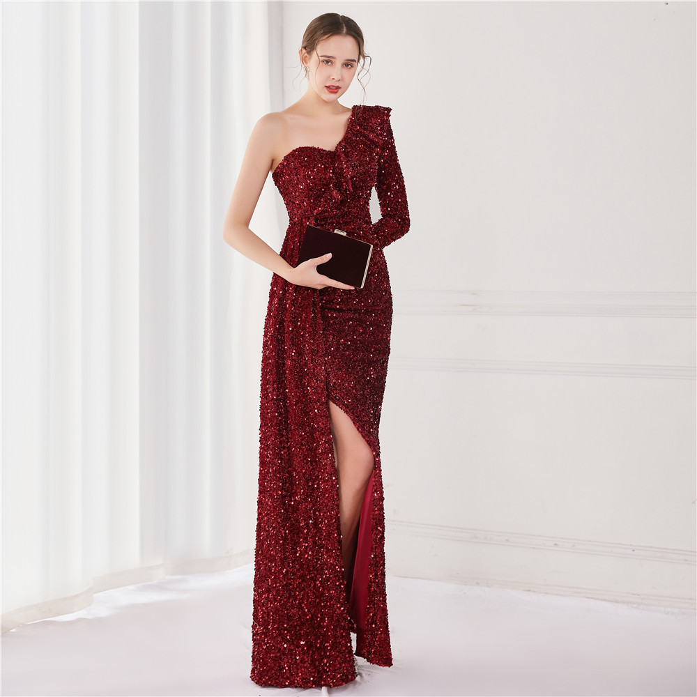 This Winter Elegant Sequins Ruffled One Shoulder Long Sleeve Slit Formal Party Evening Dress Design Made Of Good Quality Polyester And Spandex Material, Which Is Stretchy, Durable And Comfortable. The Long Evening Dresses And Gowns Is Always The main Choice For All Kinds Of Parties, Cocktail, Prom, Events, And Dating Occasions. Evening Gowns At BamBam Comes With Huge Selections - Sequins, Beaded, Satin, Velvet, Lace.... When You Need retail Evening Dresses, BamBam retail Women Garment Online Shop Is Your One-Stop Online Shopping Choice.