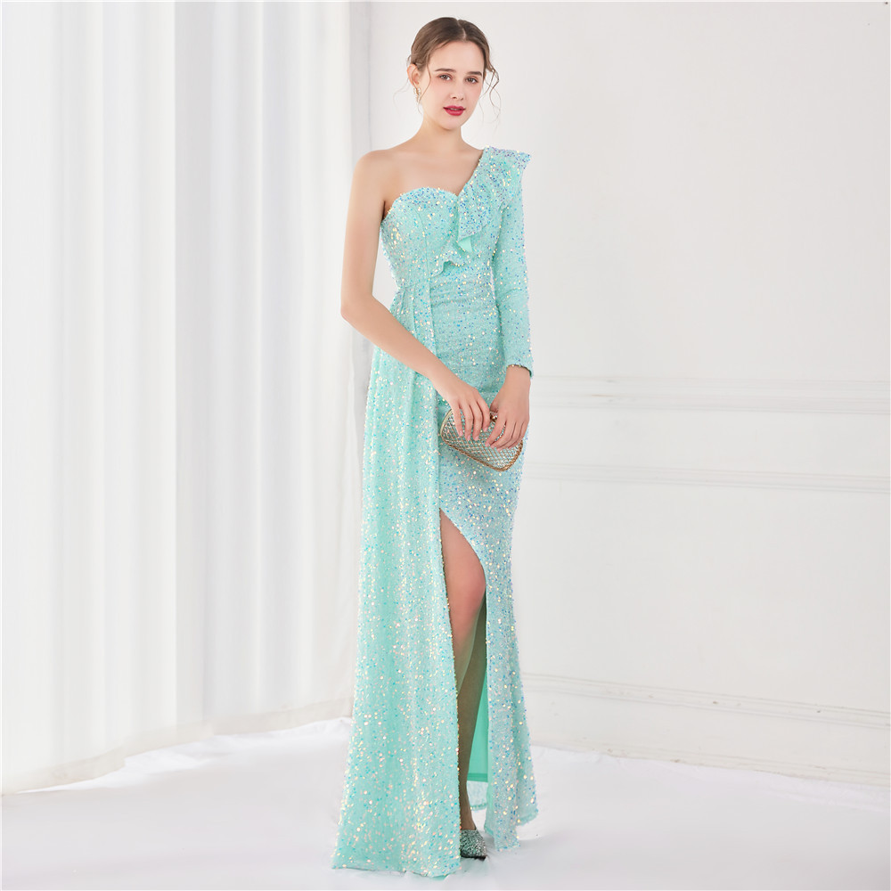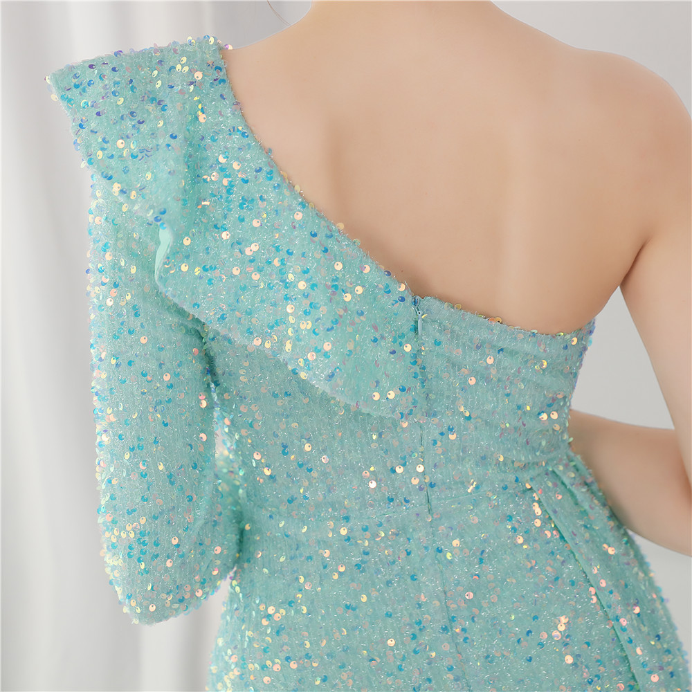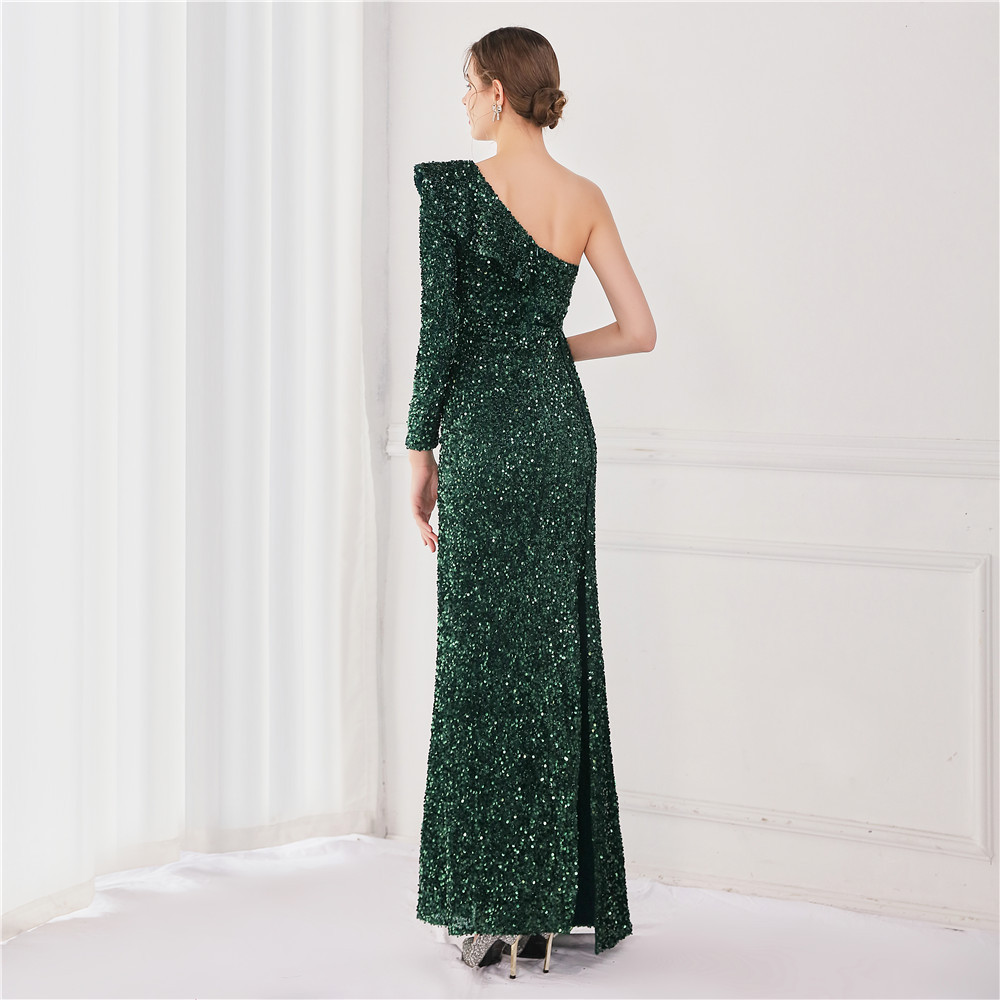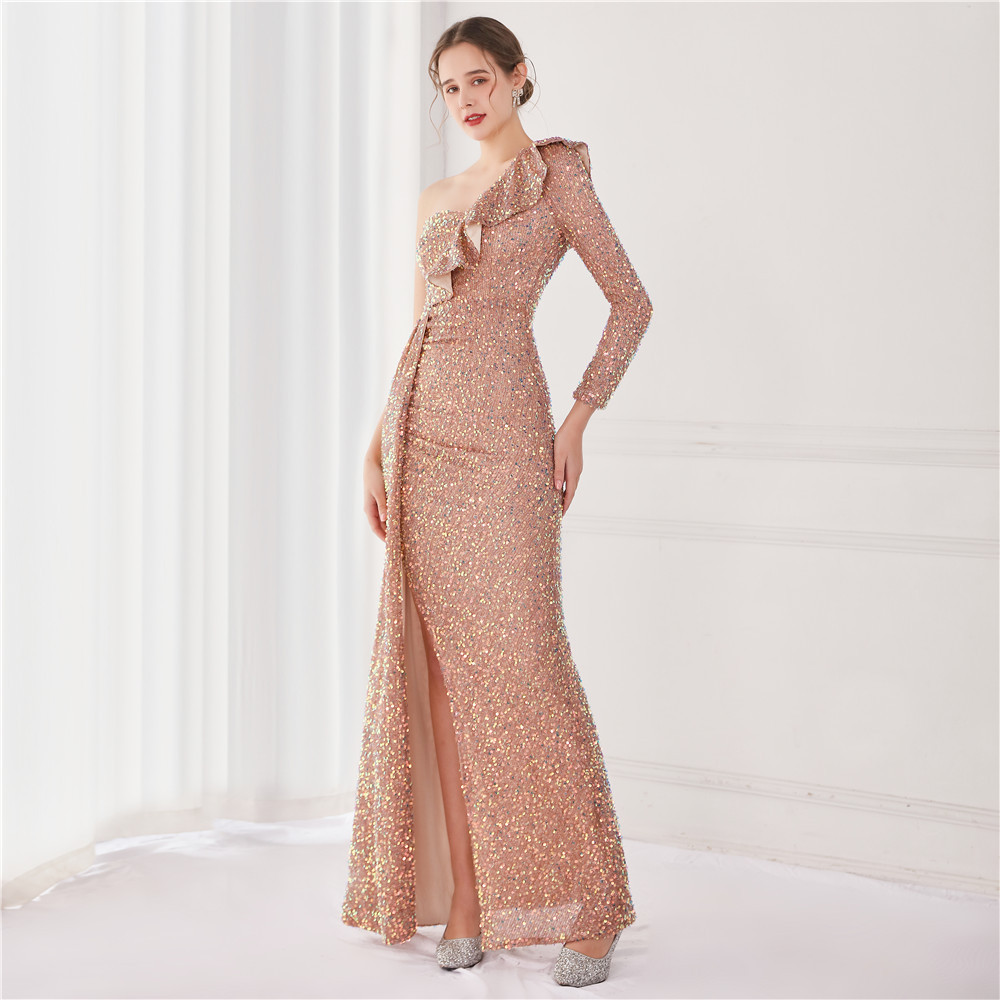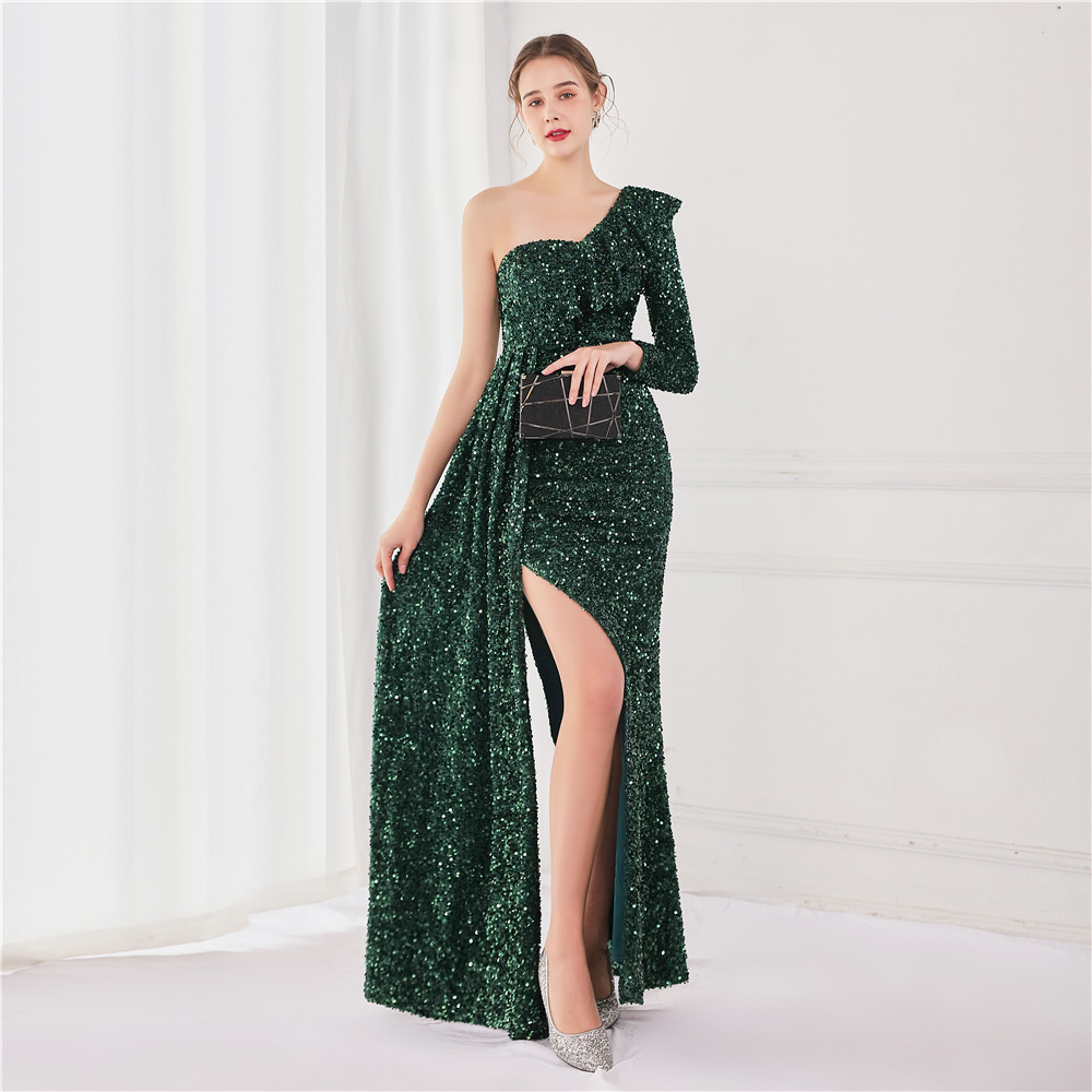 This Winter Elegant Sequins Ruffled One Shoulder Long Sleeve Slit Formal Party Evening Dress Design Made Of Good Quality Polyester And Spandex Material, Which Is Stretchy, Durable And Comfortable. The Long Evening Dresses And Gowns Is Always The main Choice For All Kinds Of Parties, Cocktail, Prom, Events, And Dating Occasions. Evening Gowns At BamBam Comes With Huge Selections - Sequins, Beaded, Satin, Velvet, Lace.... When You Need retail Evening Dresses, BamBam retail Women Garment Online Shop Is Your One-Stop Online Shopping Choice.