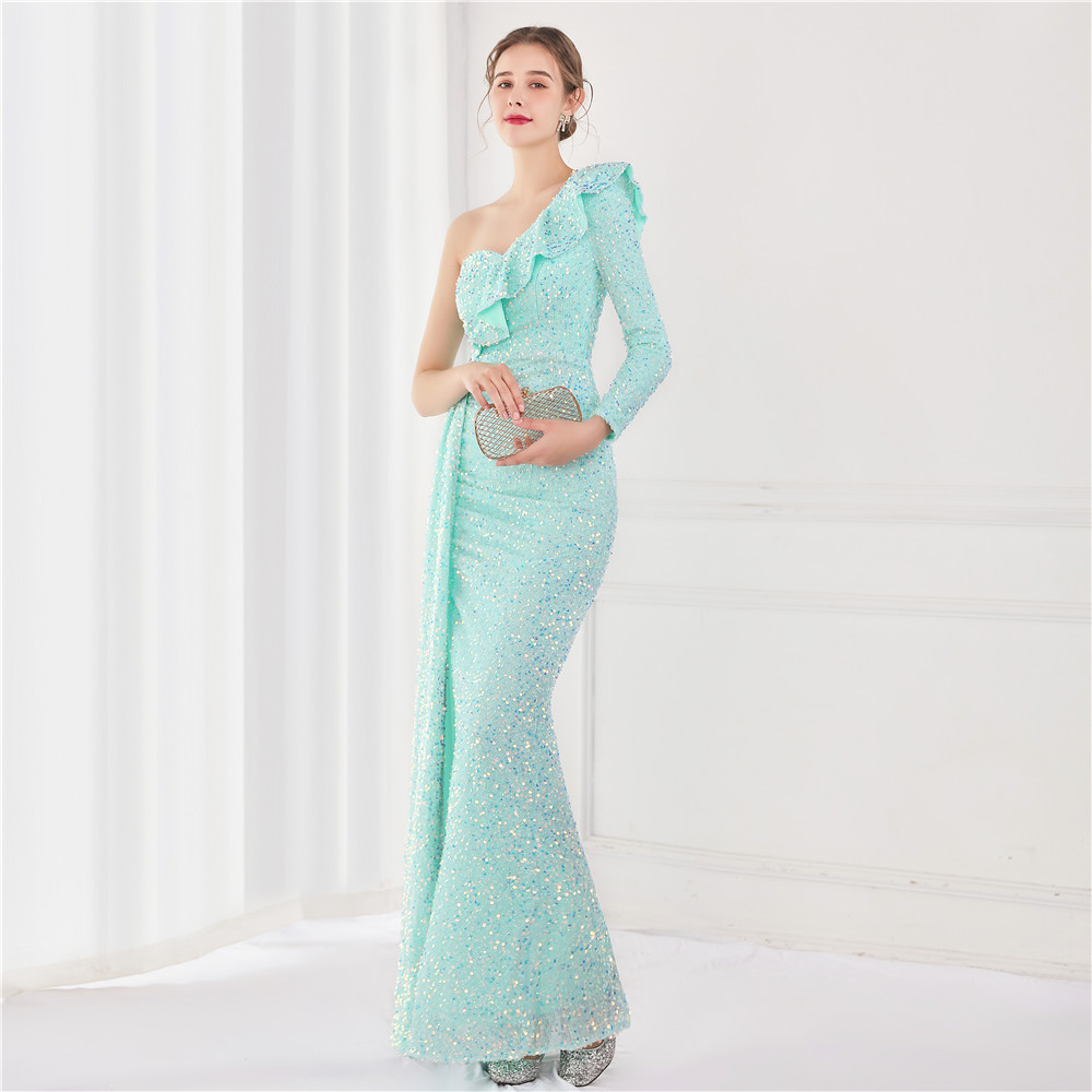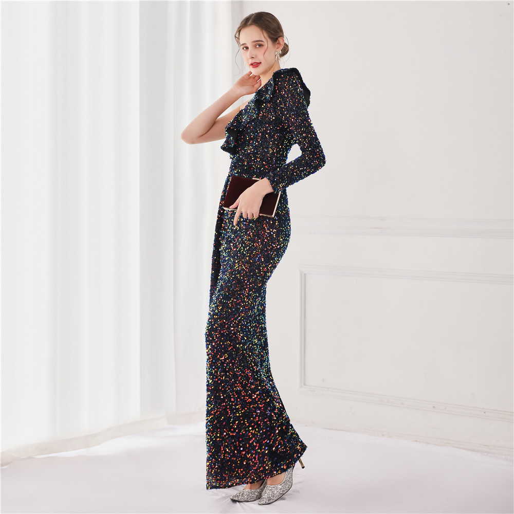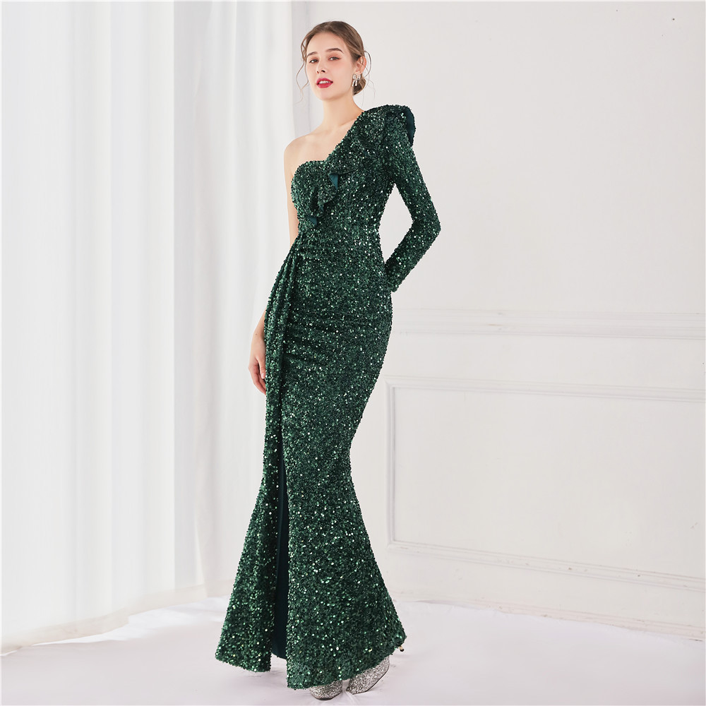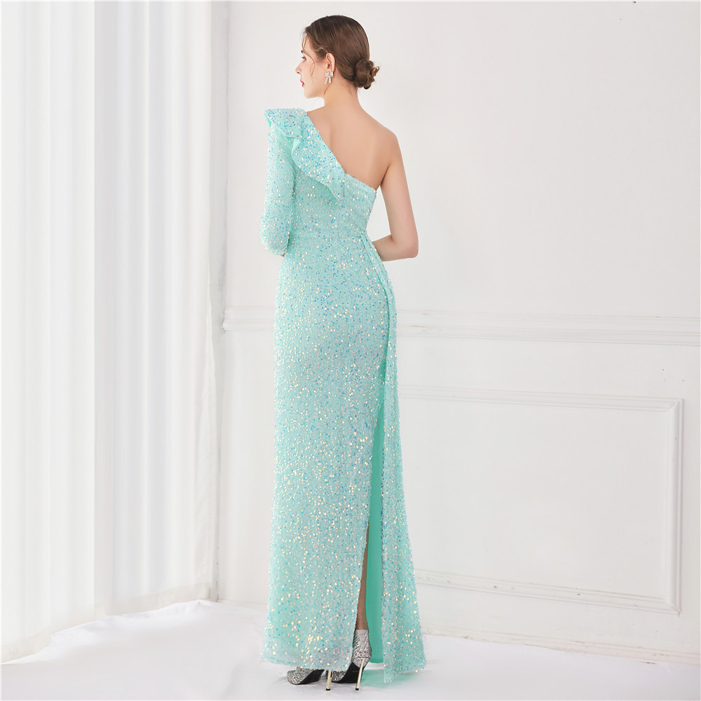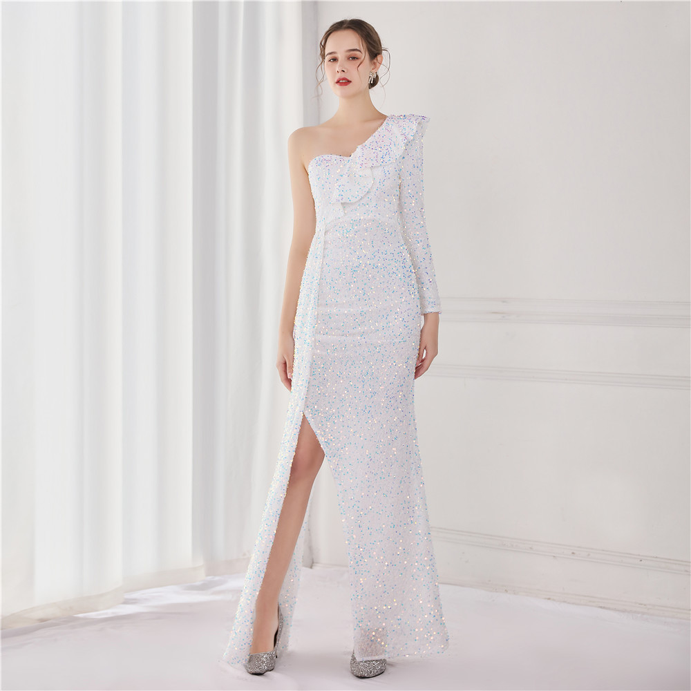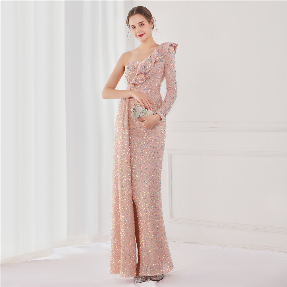 This Winter Elegant Sequins Ruffled One Shoulder Long Sleeve Slit Formal Party Evening Dress Design Made Of Good Quality Polyester And Spandex Material, Which Is Stretchy, Durable And Comfortable. The Long Evening Dresses And Gowns Is Always The main Choice For All Kinds Of Parties, Cocktail, Prom, Events, And Dating Occasions. Evening Gowns At BamBam Comes With Huge Selections - Sequins, Beaded, Satin, Velvet, Lace.... When You Need retail Evening Dresses, BamBam retail Women Garment Online Shop Is Your One-Stop Online Shopping Choice.