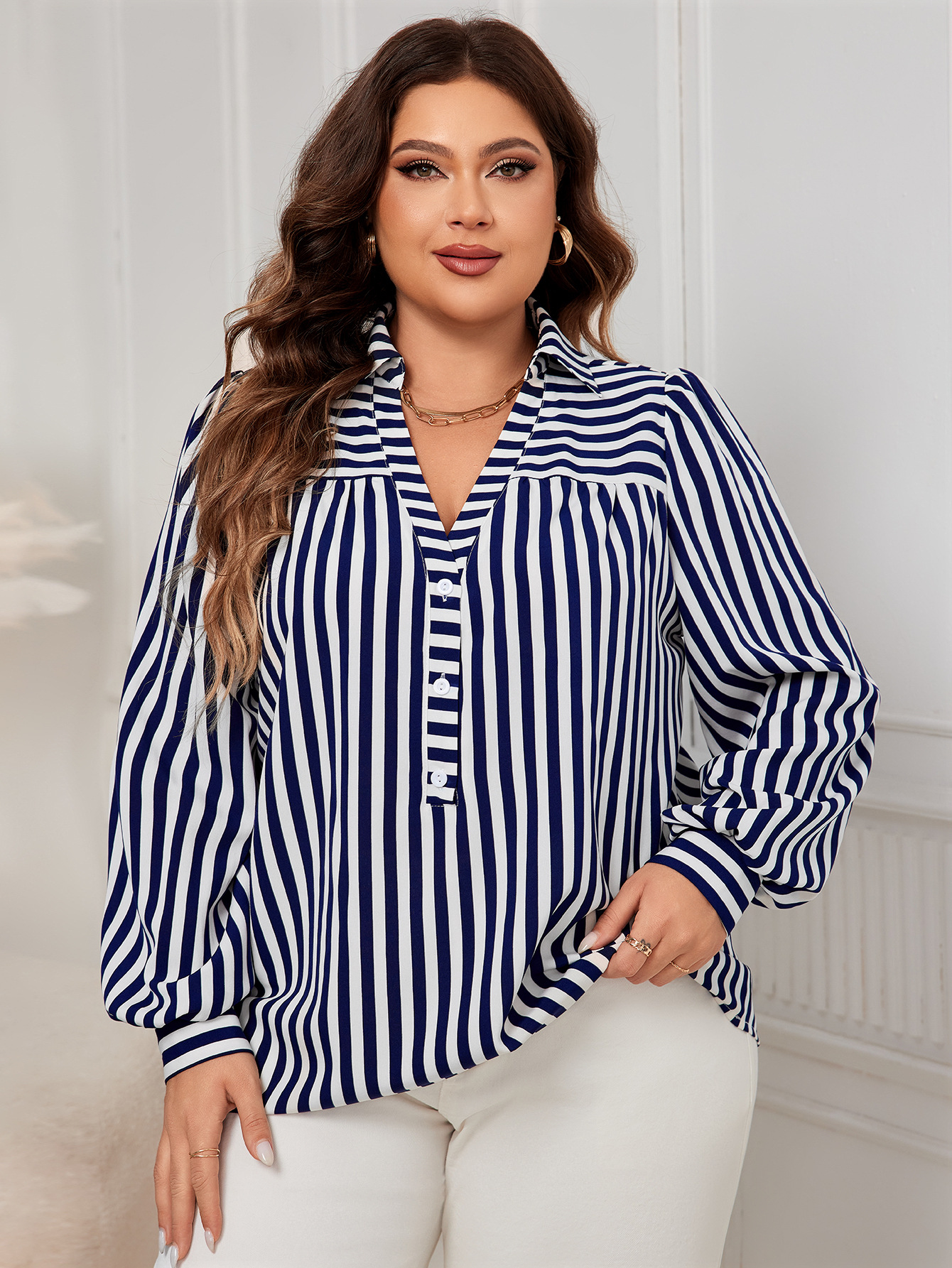 This Women Autumn Polo Collar Blue And White Striped Shirt Top Made Of Comfortable And stretchy Fabric. It Is retail Sexy Plus Size Tops For Women. With The Gradual Rise Of Feminist Awareness, The Mainstream Fashion Of "Beauty With Thinness" In The Past Can No Longer Dominate, BamBam Advocates That No Matter Whether The Body Is Thick Or Thin, We Are The Most Unique Existence. Ladies Can Also Show Off Their Figure Generously. BamBam Offer All Kinds Of retail Plus Size Blouses And Shirts At affordable Price And High Quality.