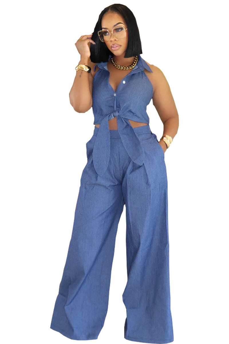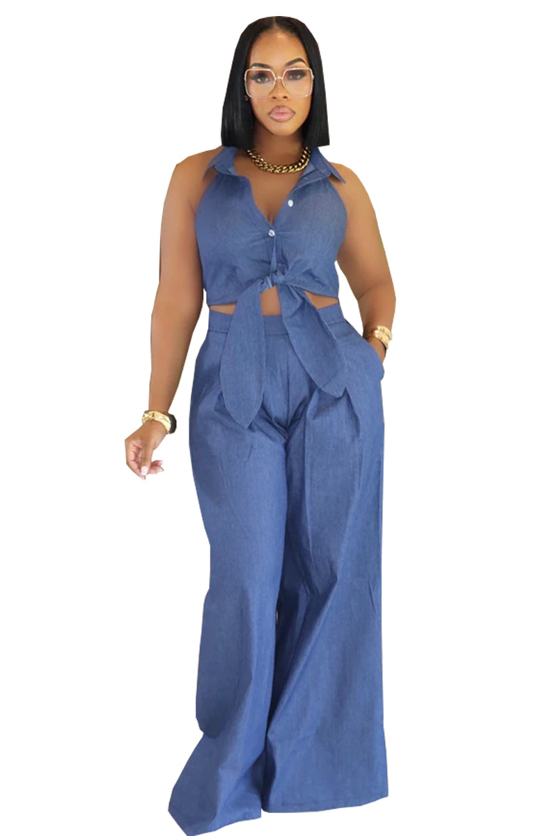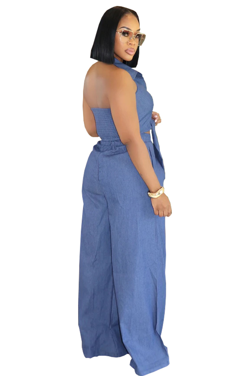 This Women Blue Denim Halter Neck Turndown Collar Backless Top And Wide Leg Pants Two Piece Set Design Made Of High Quality polyester And Spandex Material. It Is Stretchy, Durable And Comfortable. It Is a Must-Have Outfit For All Seasons. retail Two Piece Pant Sets Can Solve Your cloth selection Troubles. Explore More 2 Piece Pants Set On BamBam retail Women Clothing Online Store.