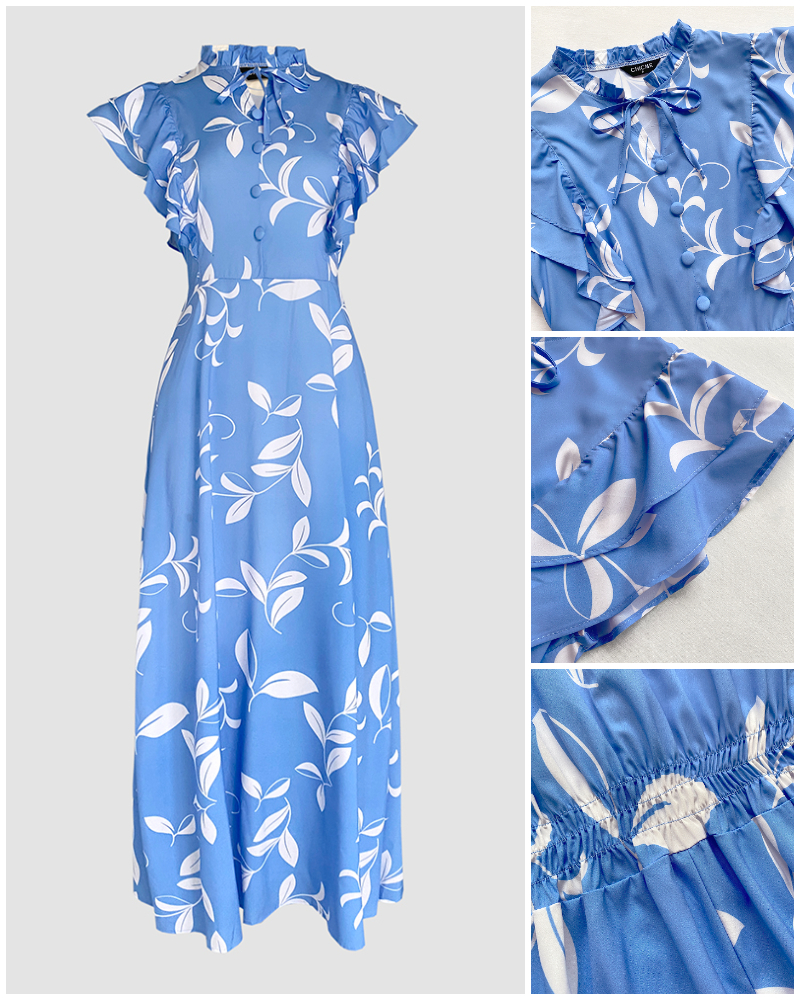 This Women Blue Floral Floral Lace-Up Maxi Dress With Ruffled S
