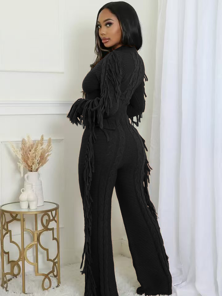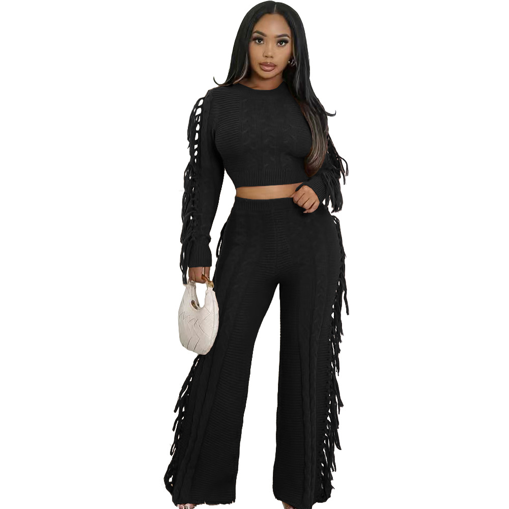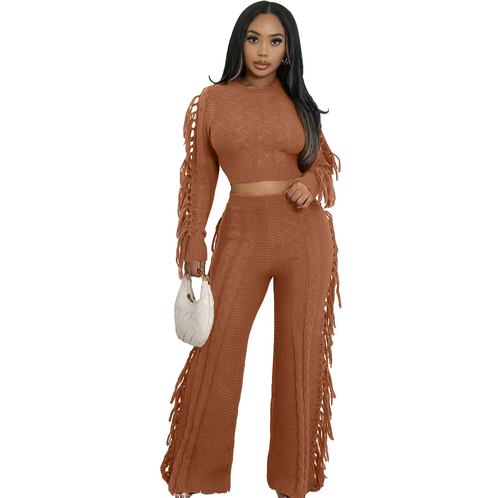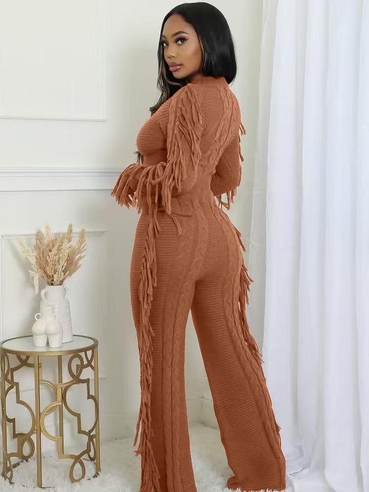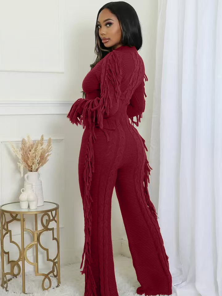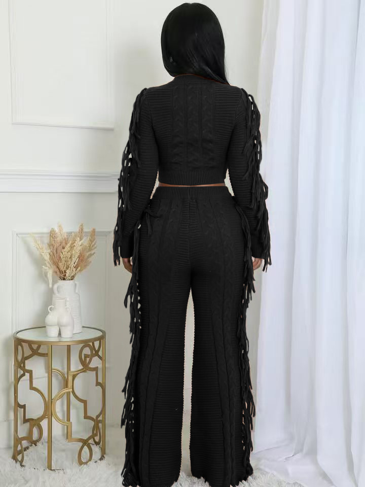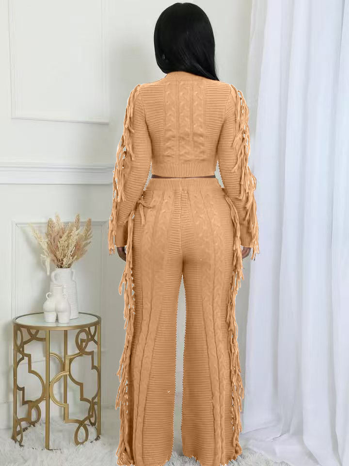 This Women Casual Solid Knitting Long-Sleeved Tassel Top And Pant Two-Piece Set Design Made Of High Quality polyester And Spandex Material. It Is Stretchy, Durable And Comfortable. It Is a Must-Have Outfit For All Seasons. retail Two Piece Pant Sets Can Solve Your cloth selection Troubles. Explore More 2 Piece Pants Set On BamBam retail Women Clothing Online Store.