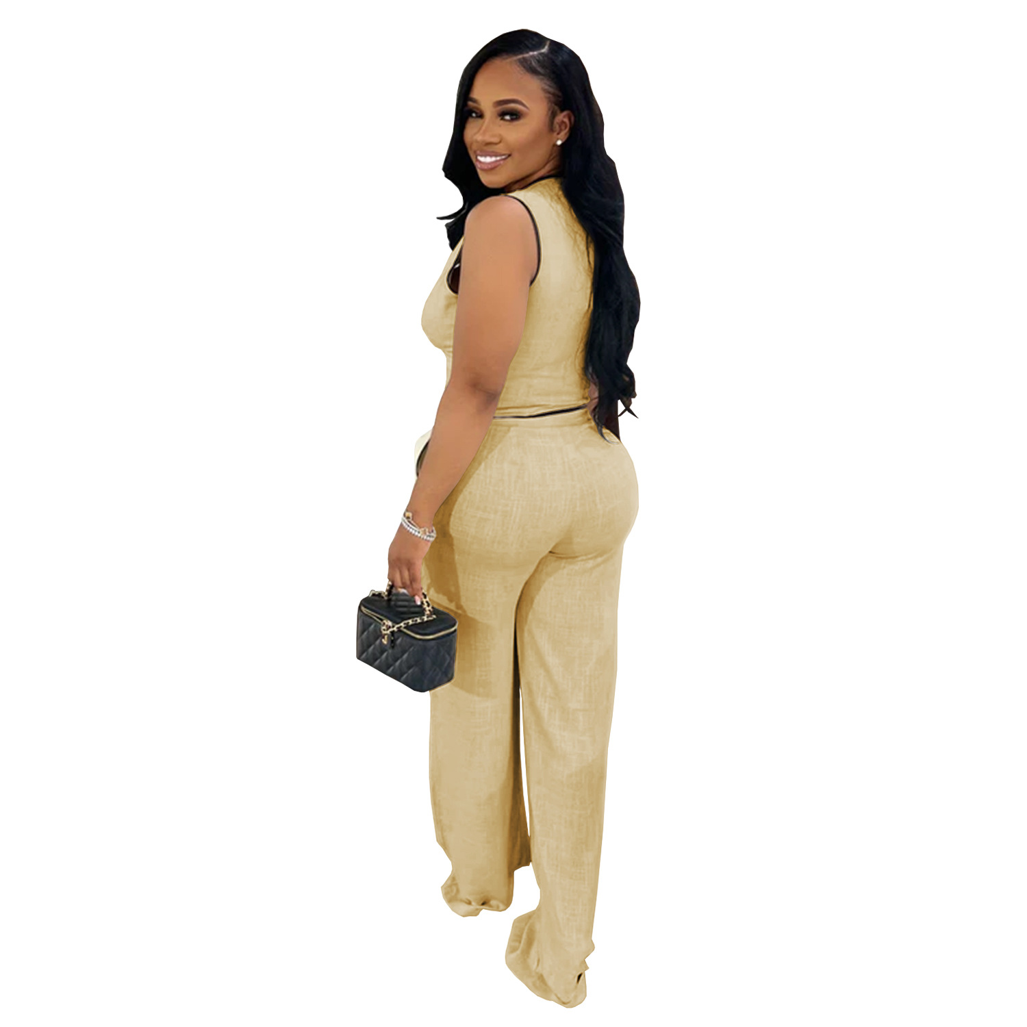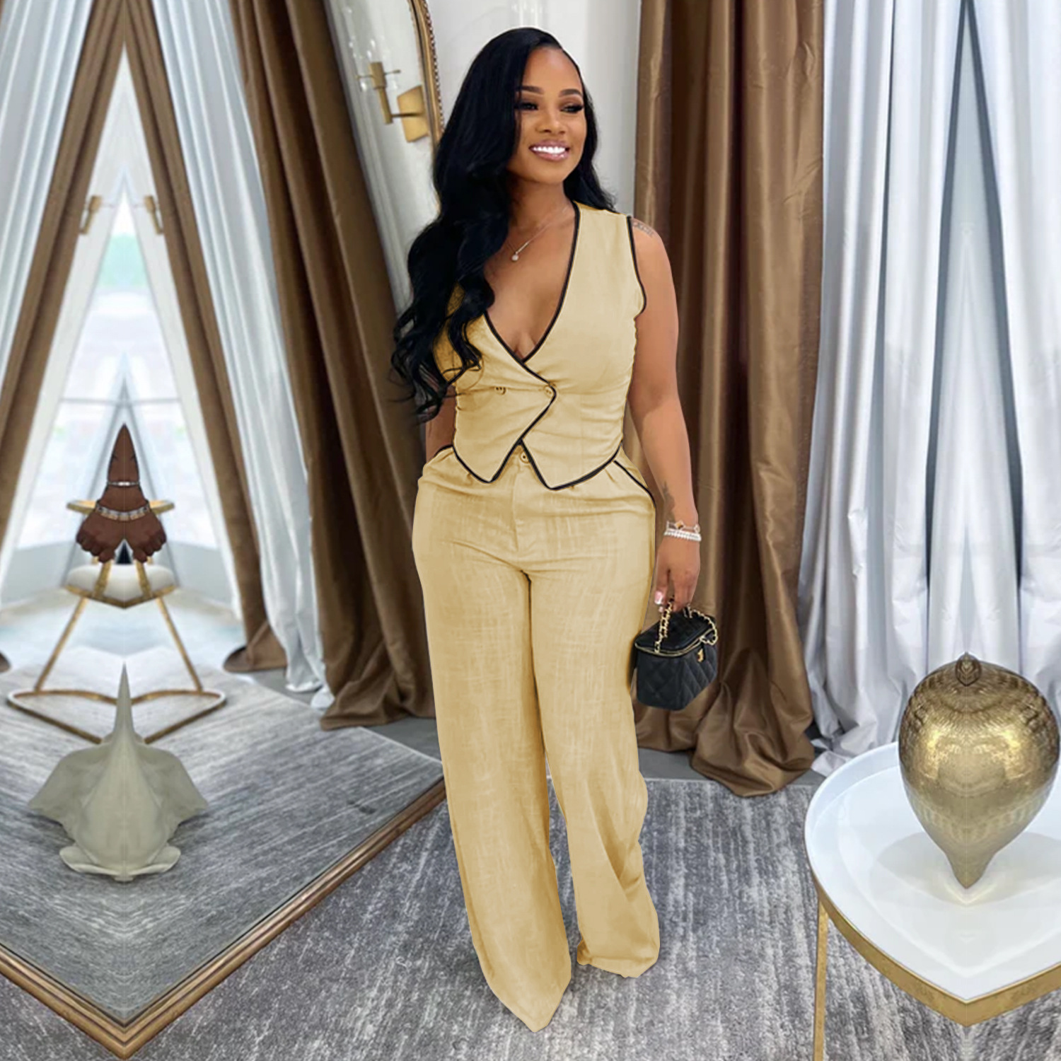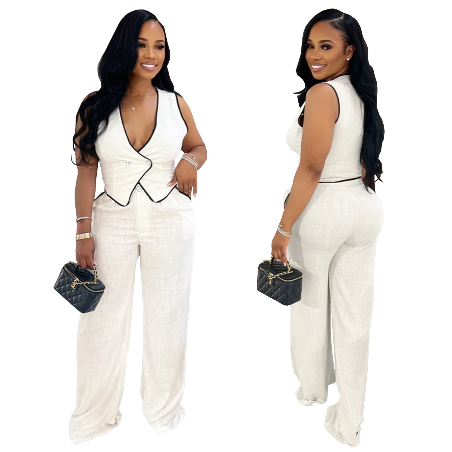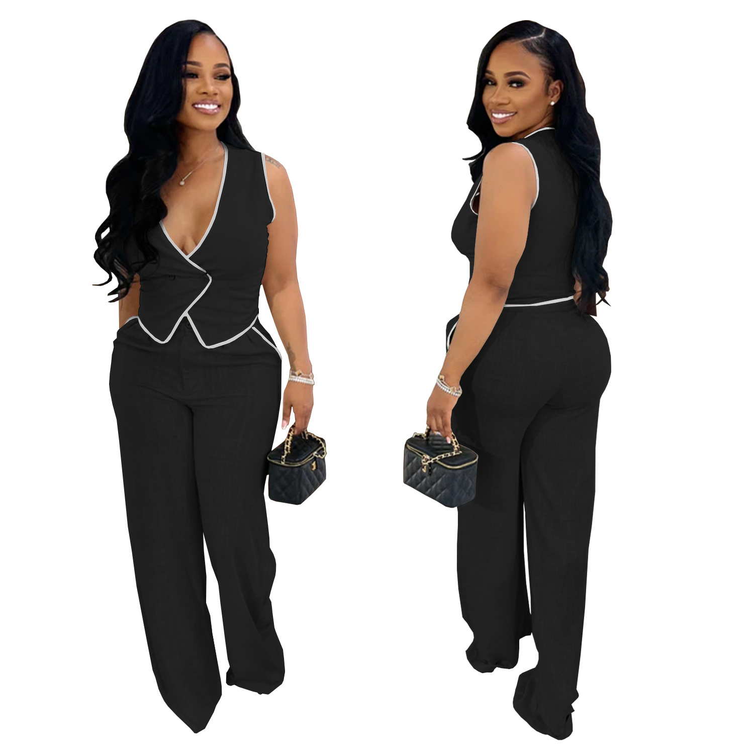 This Women Casual v-Neck Button Top And Trousers Two-Piece Suit Design Made Of High Quality polyester And Spandex Material. It Is Stretchy, Durable And Comfortable. It Is a Must-Have Outfit For All Seasons. retail Two Piece Pant Sets Can Solve Your cloth selection Troubles. Explore More 2 Piece Pants Set On BamBam retail Women Clothing Online Store.