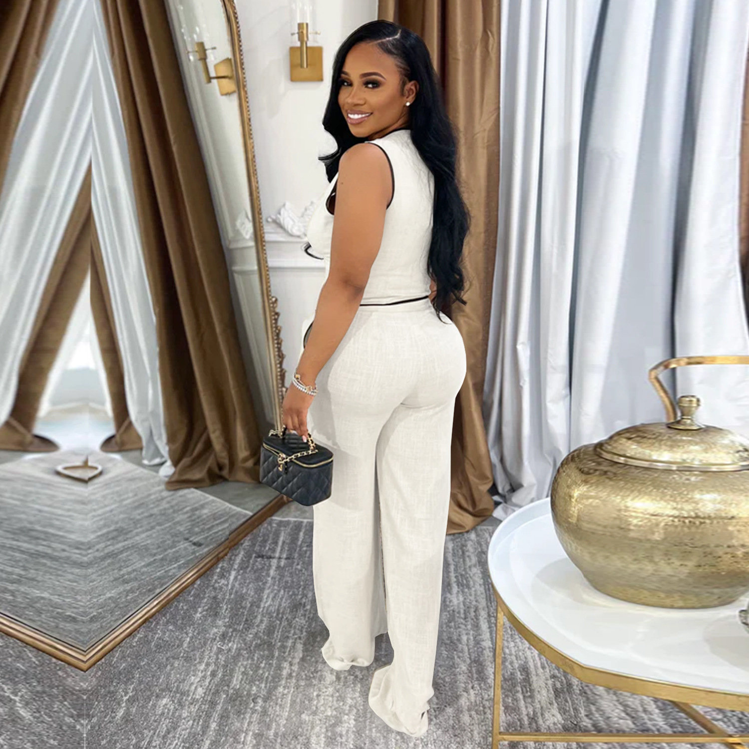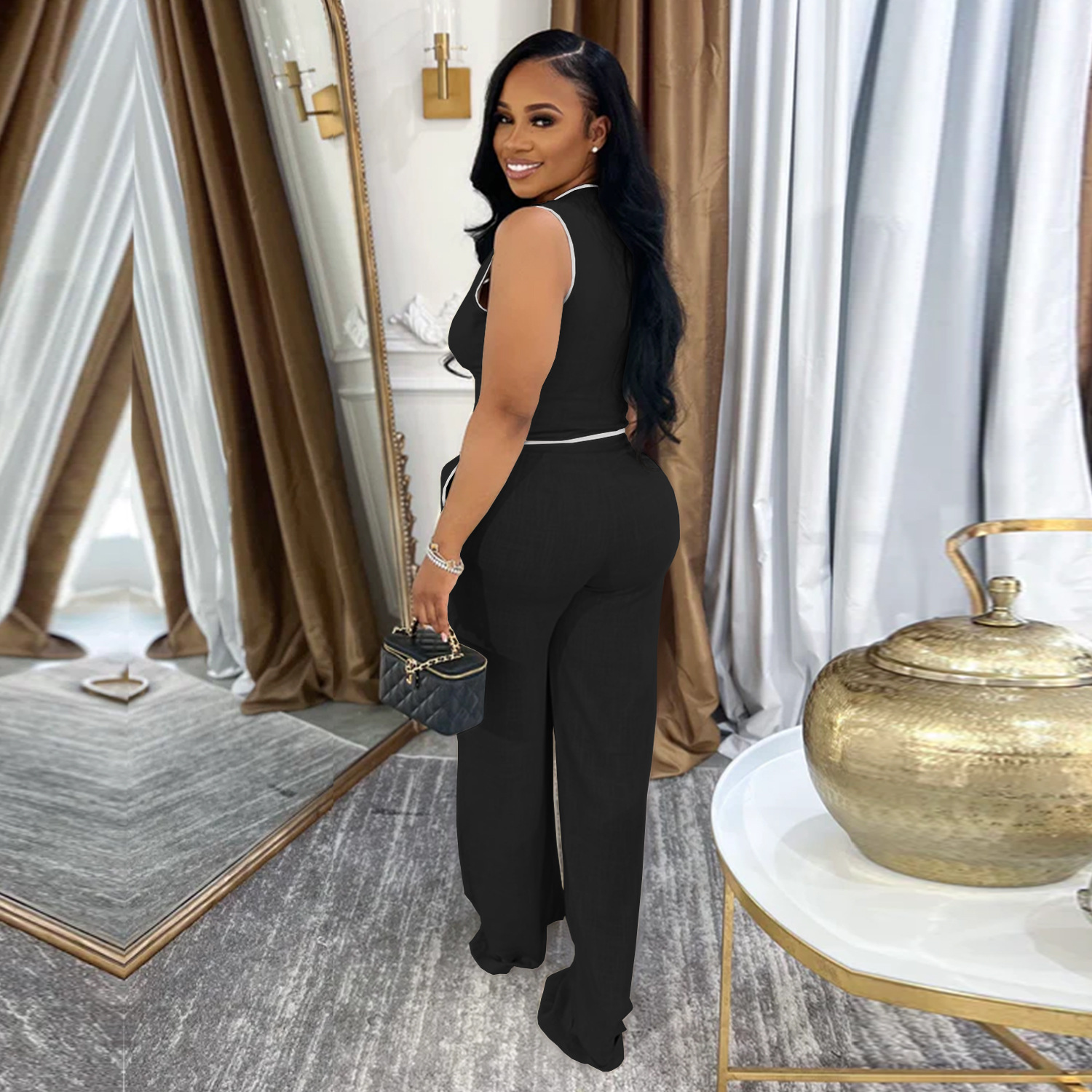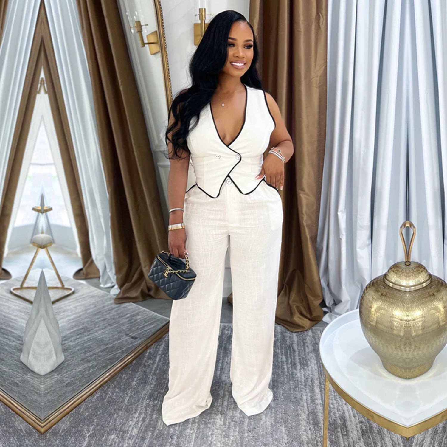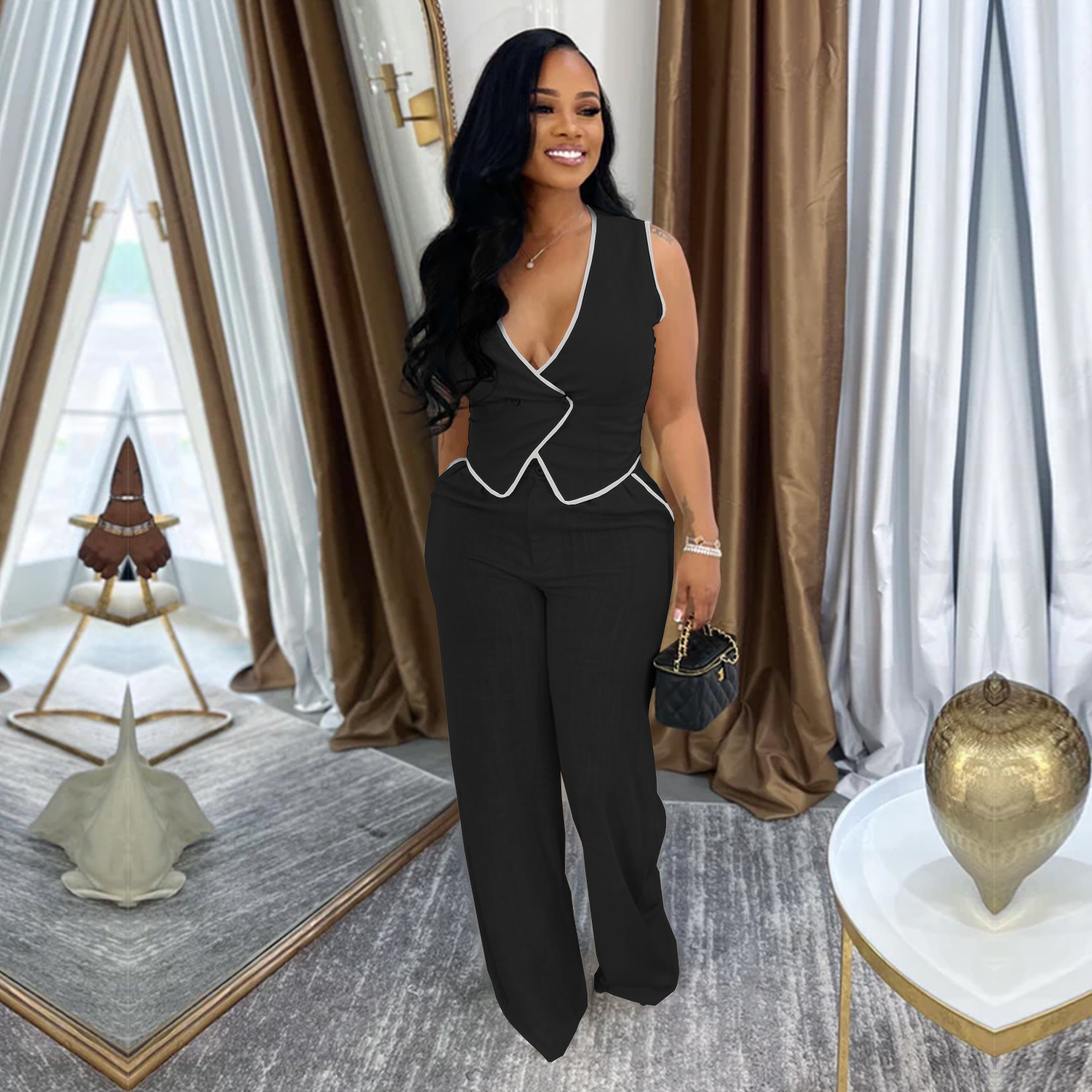 This Women Casual v-Neck Button Top And Trousers Two-Piece Suit Design Made Of High Quality polyester And Spandex Material. It Is Stretchy, Durable And Comfortable. It Is a Must-Have Outfit For All Seasons. retail Two Piece Pant Sets Can Solve Your cloth selection Troubles. Explore More 2 Piece Pants Set On BamBam retail Women Clothing Online Store.