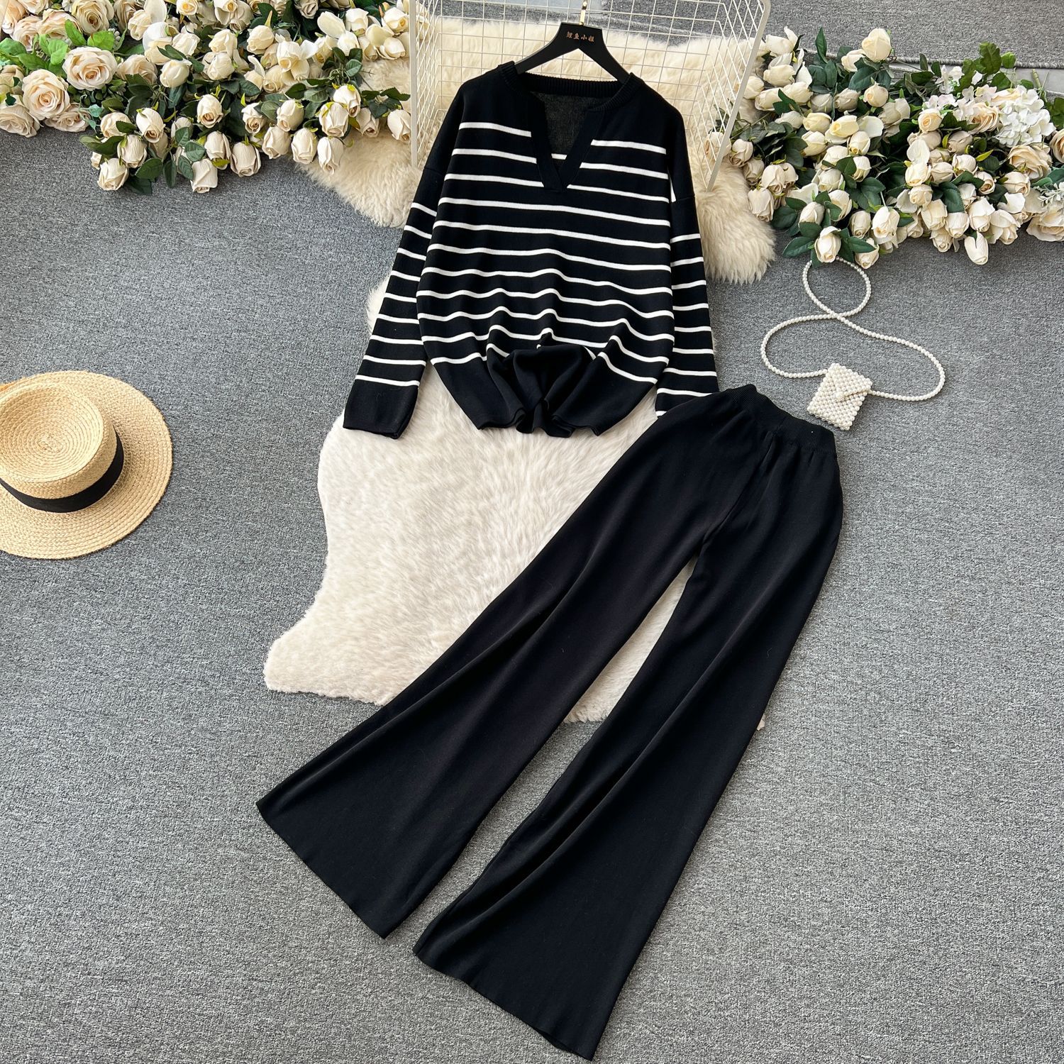 This Women Casual v Neck Striped Knitting Top And Pants Two-Piece Set Design Made Of High Quality polyester And Spandex Material. It Is Stretchy, Durable And Comfortable. It Is a Must-Have Outfit For All Seasons. retail Two Piece Pant Sets Can Solve Your cloth selection Troubles. Explore More 2 Piece Pants Set On BamBam retail Women Clothing Online Store.