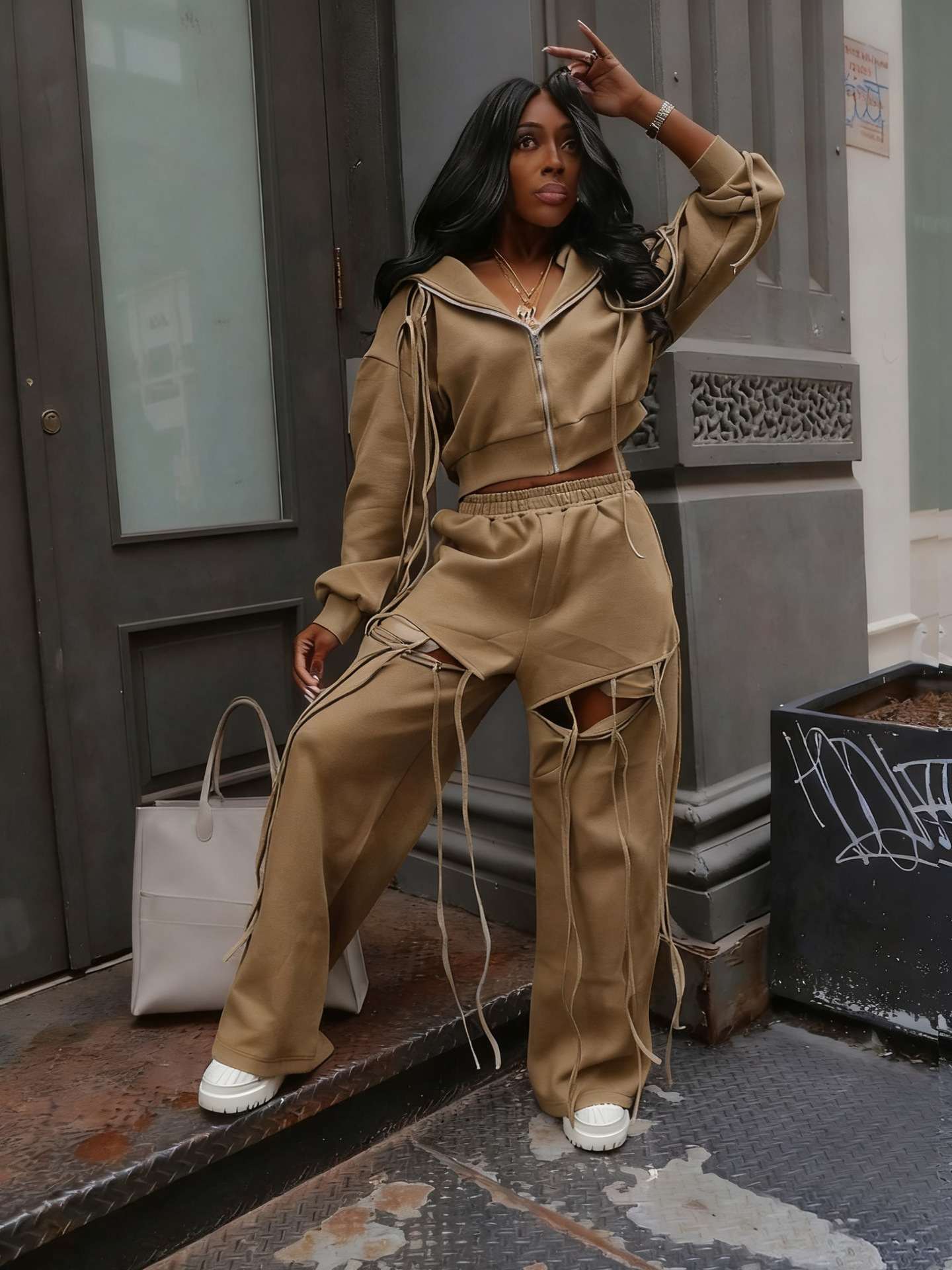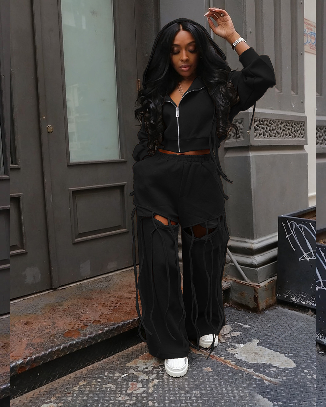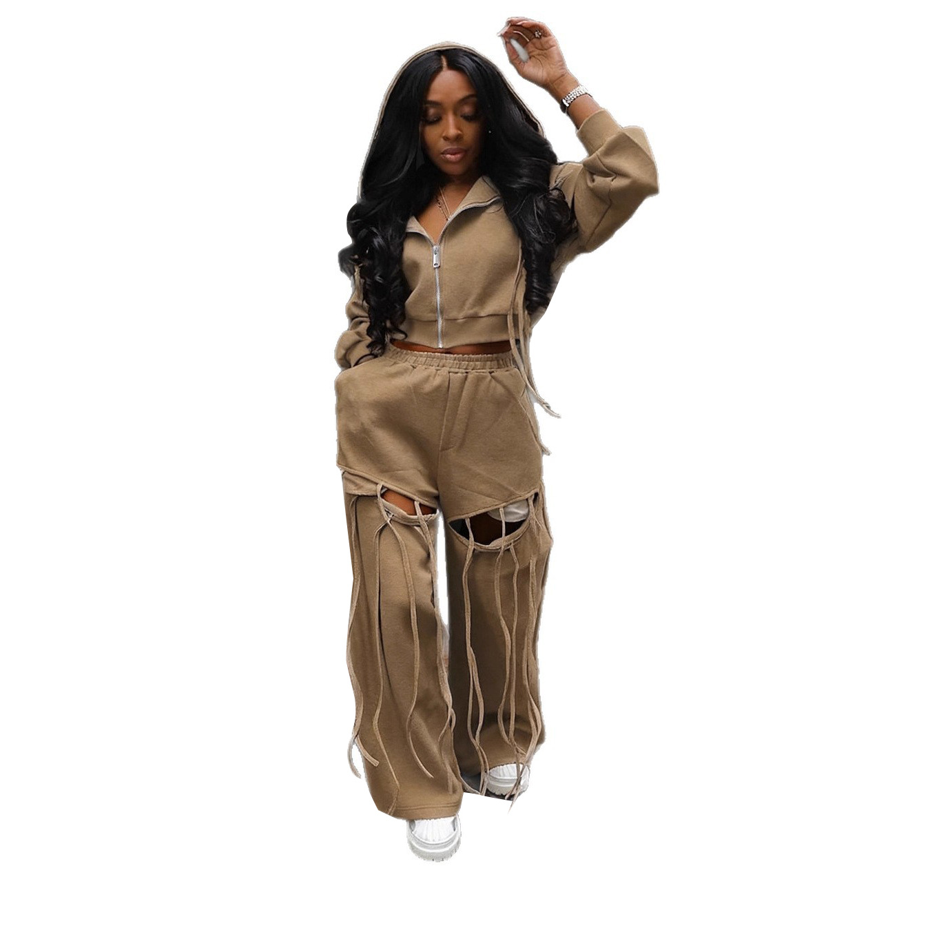 This Women Casual Zipper Hoodies And Ripped Wide-Leg Pants Two-Piece Set Design Made Of High Quality polyester And Spandex Material. It Is Stretchy, Durable And Comfortable. It Is a Must-Have Outfit For All Seasons. retail Two Piece Pant Sets Can Solve Your cloth selection Troubles. Explore More 2 Piece Pants Set On BamBam retail Women Clothing Online Store.