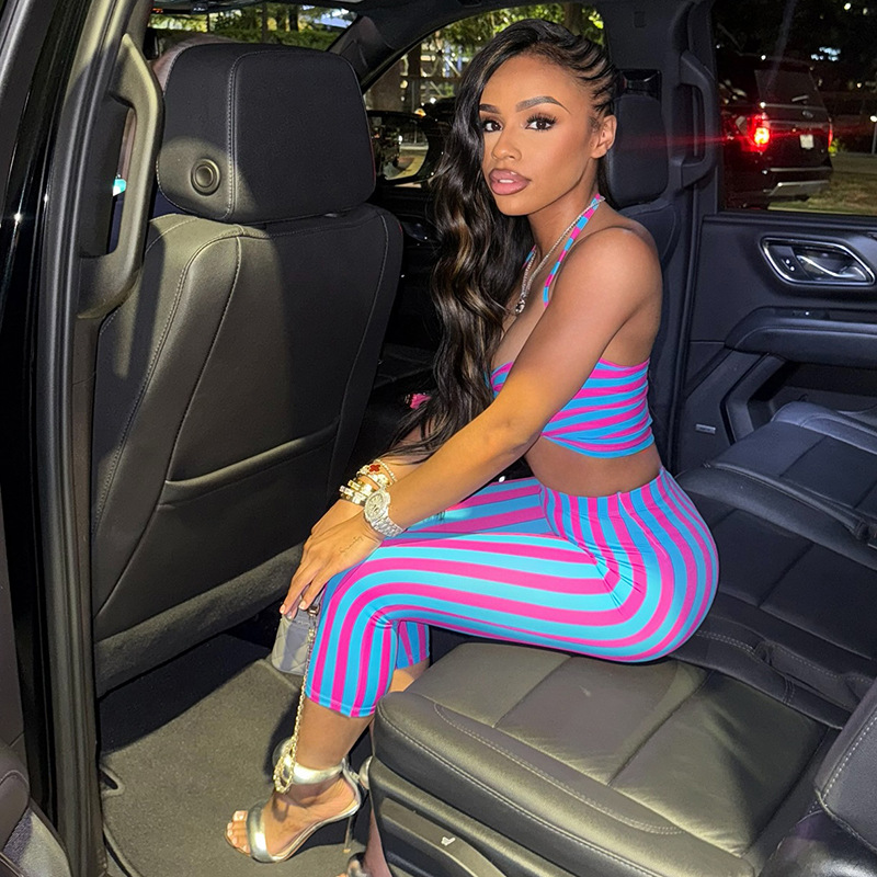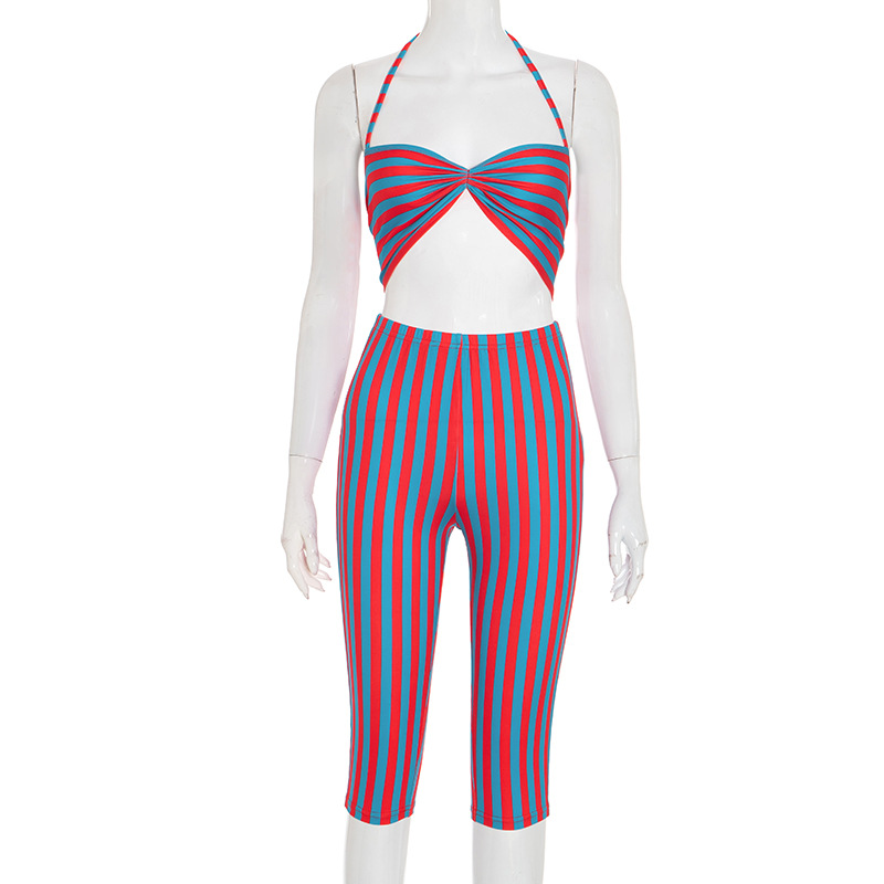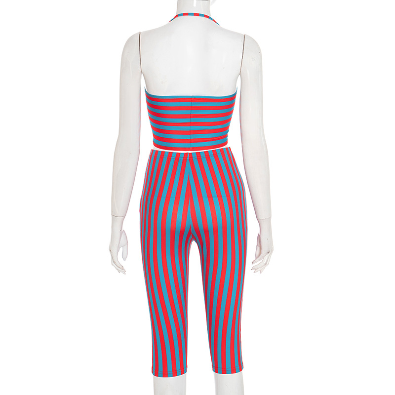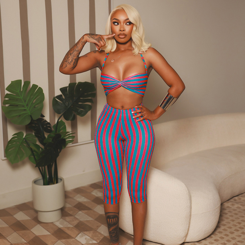 This Women Contrast Striped Halter Neck Top And Capri Pants Two-Piece Design Made Of High Quality polyester And Spandex Material. It Is Stretchy, Durable And Comfortable. It Come With The Top And Shorts. retail Short Sets Saves Some People From The Trouble Of Matching. And For Matchmakers It Is More Flexible Than One-Piece Outfit. Two Piece Short Set Can Be Worn Together Or Individually, Ladies Can Match Them According To Different Occasions. Grab Different Two Piece Short Sets For This Spring And Summer.