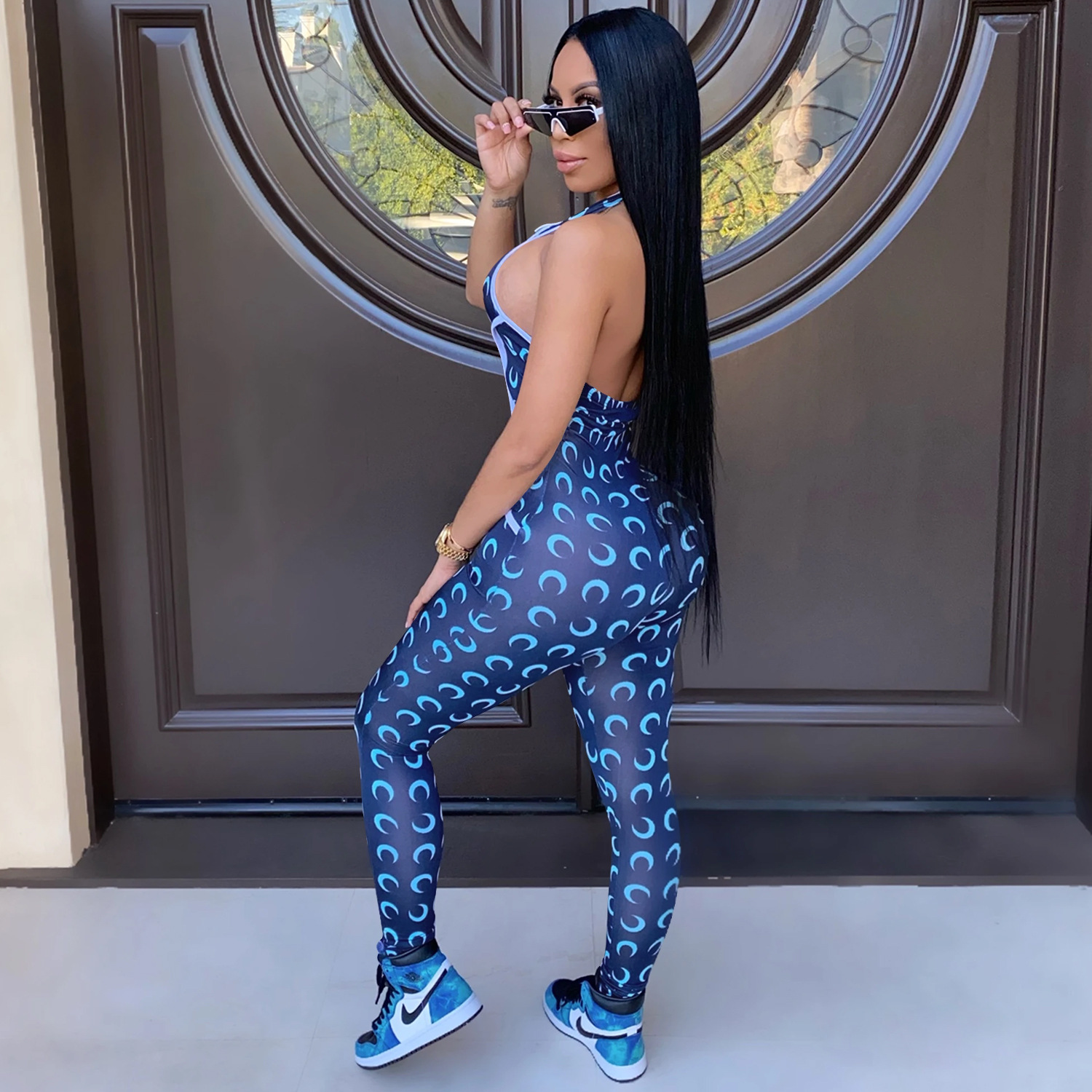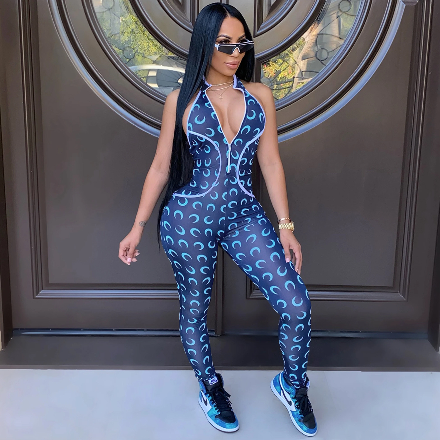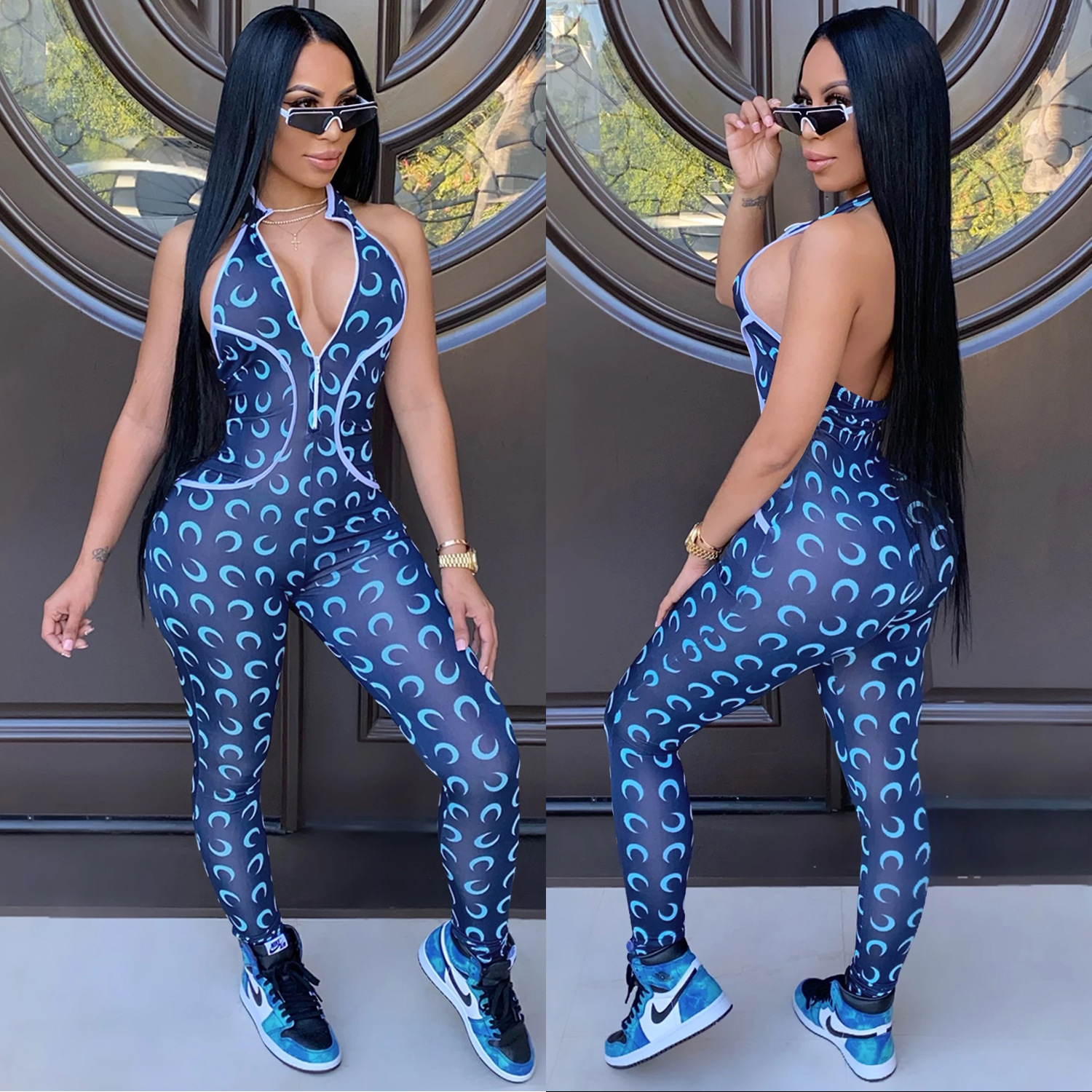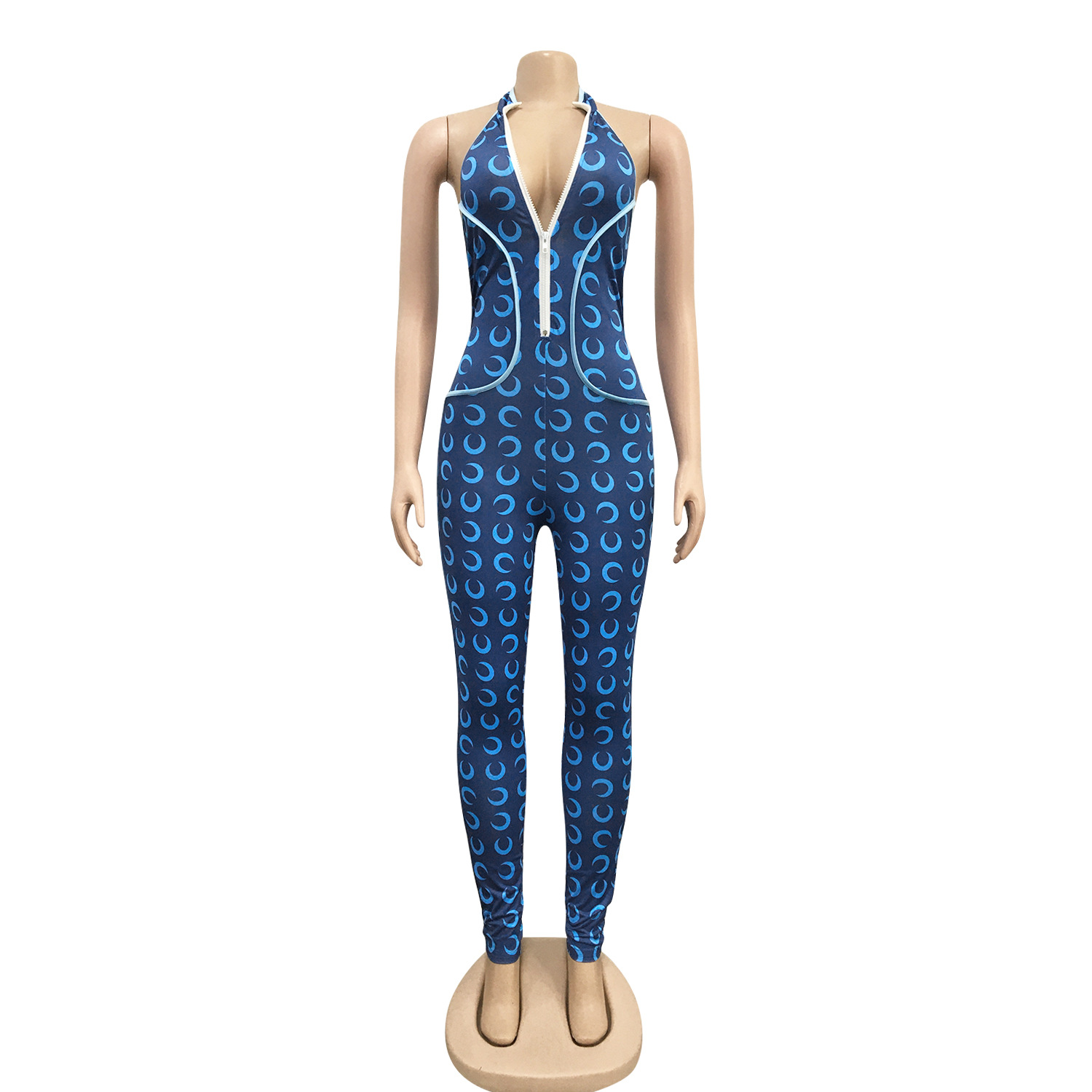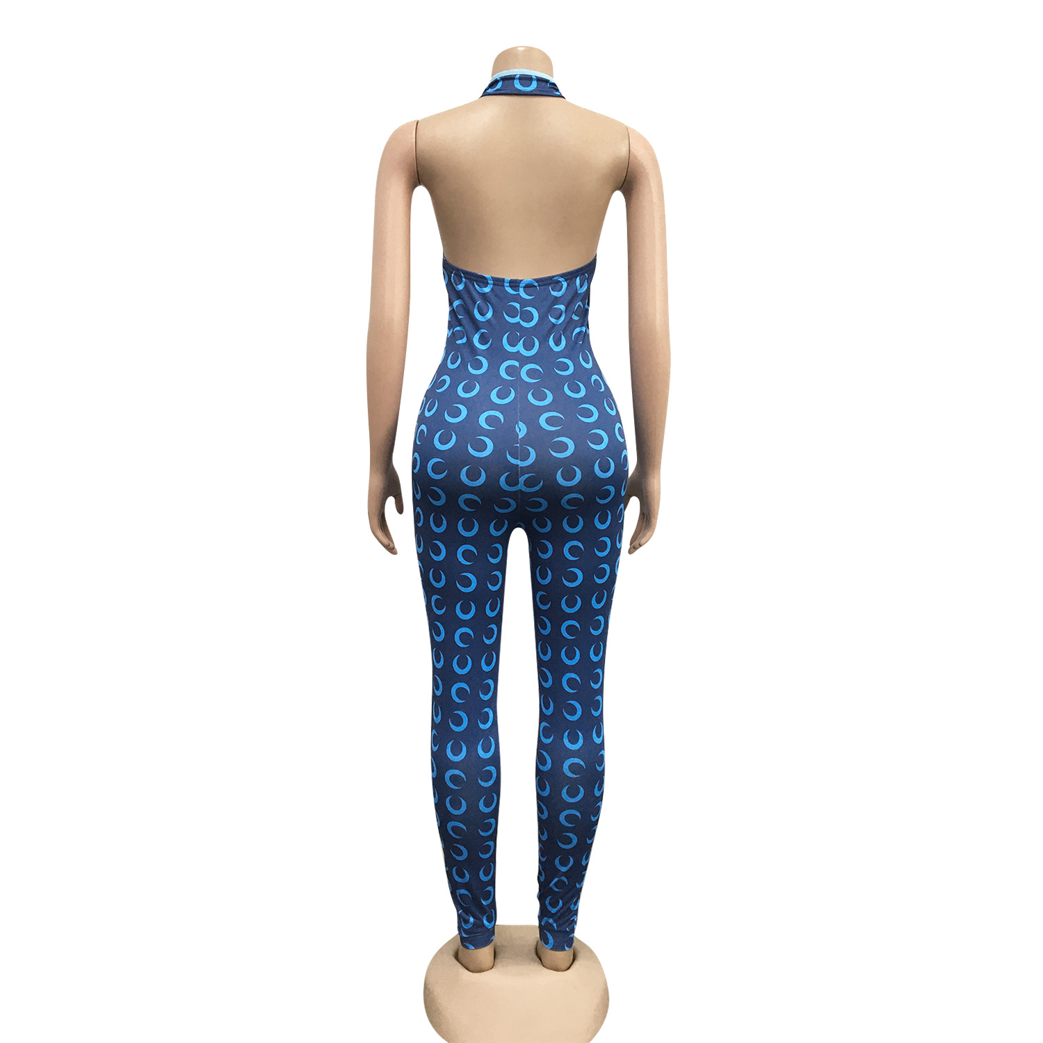 This Women Crescent Moon Print Halter Neck Jumpsuit Design Made Of High Quality Polyster And Spandex Material. It Is Stretchy, Durable And Comfortable. Affordable Sexy Jumpsuits For Women Has Long Been a Party Favorite. BamBam provides a Rich selection Of Sequin, Beaded, See Through Mesh, Leopard, Floral Lace, Leather, Velvet, Tight And Fitted retail Jumpsuit Without Moq Limit.