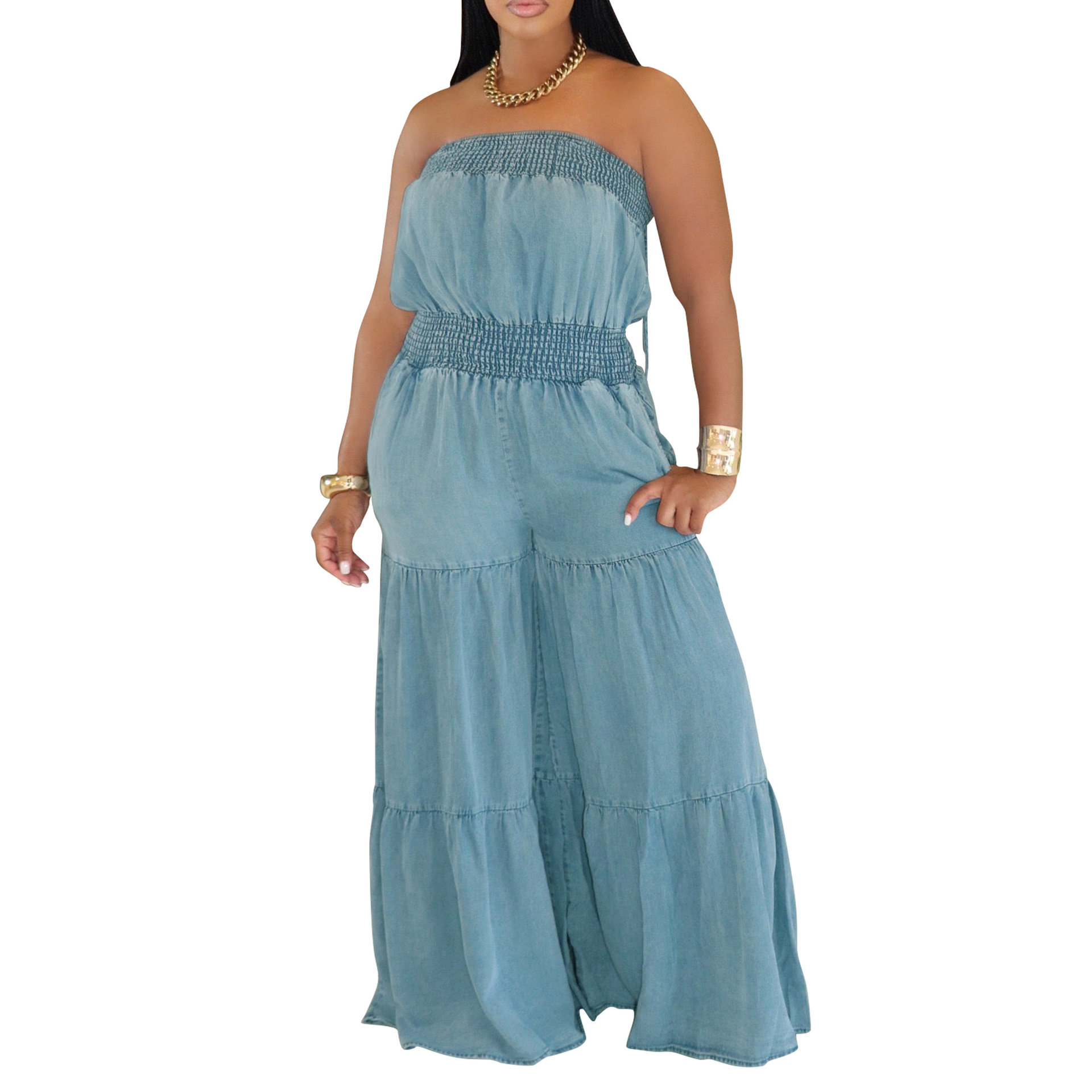 This Women Denim Solid Strapless Sleeveless Wide-Leg Jumpsuit Design Made Of High Quality Polyster And Spandex Material. It Is Stretchy, Durable And Comfortable. Affordable Sexy Jumpsuits For Women Has Long Been a Party Favorite. BamBam provides a Rich selection Of Sequin, Beaded, See Through Mesh, Leopard, Floral Lace, Leather, Velvet, Tight And Fitted retail Jumpsuit Without Moq Limit.
