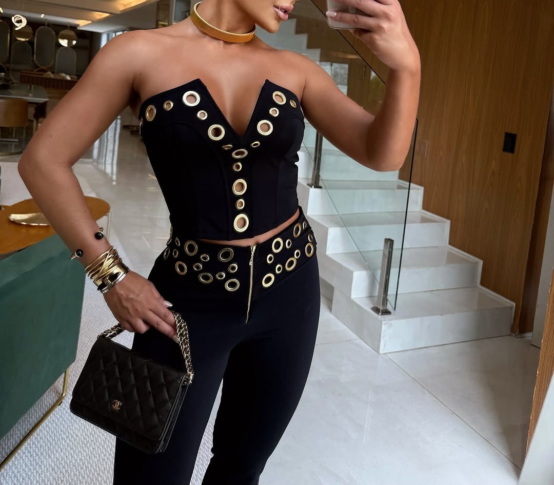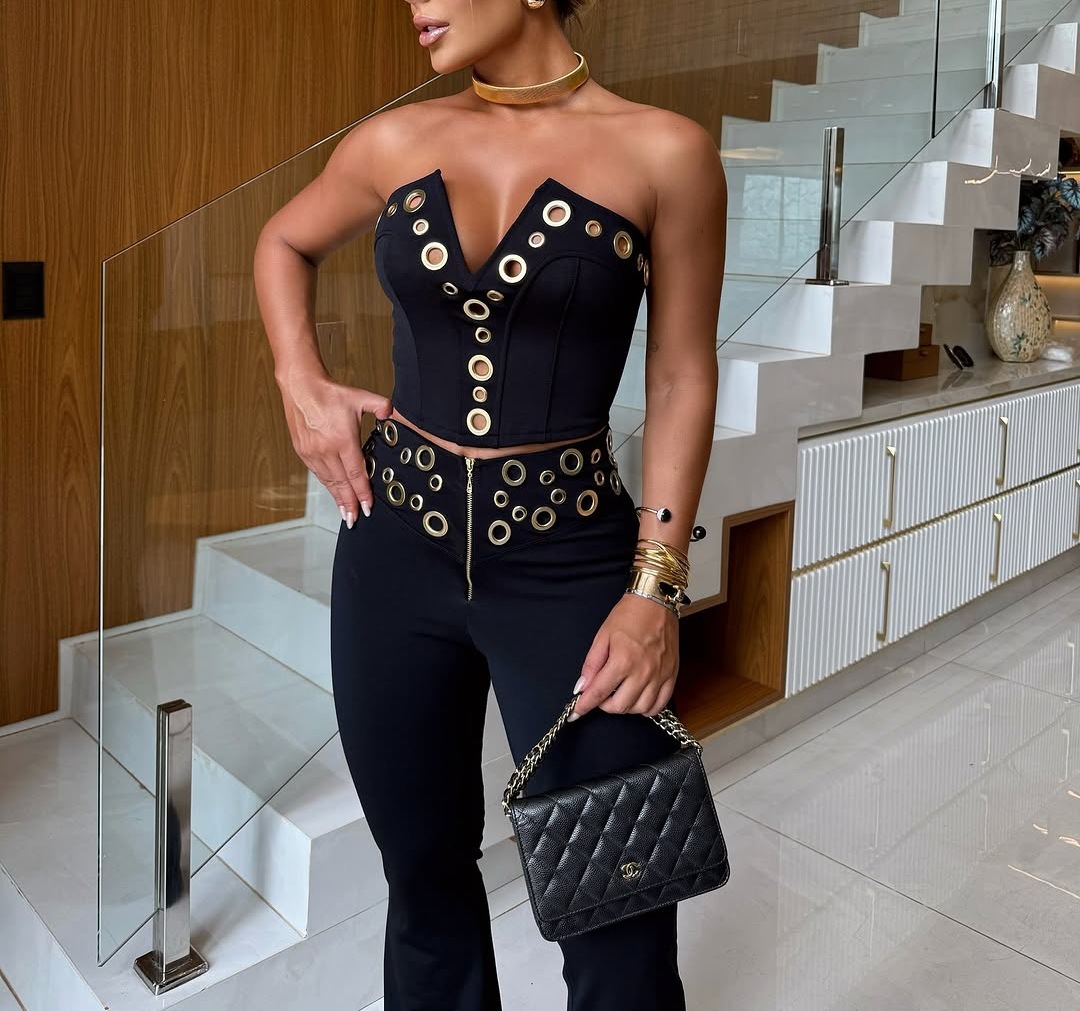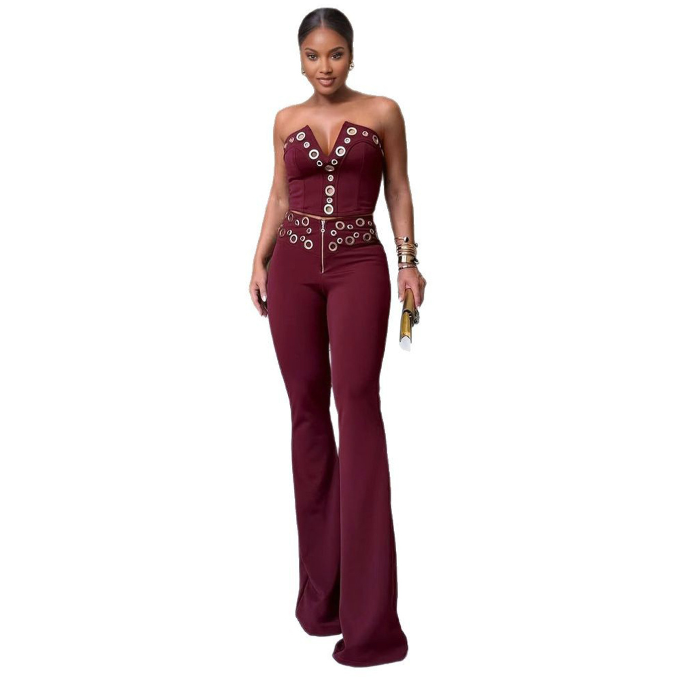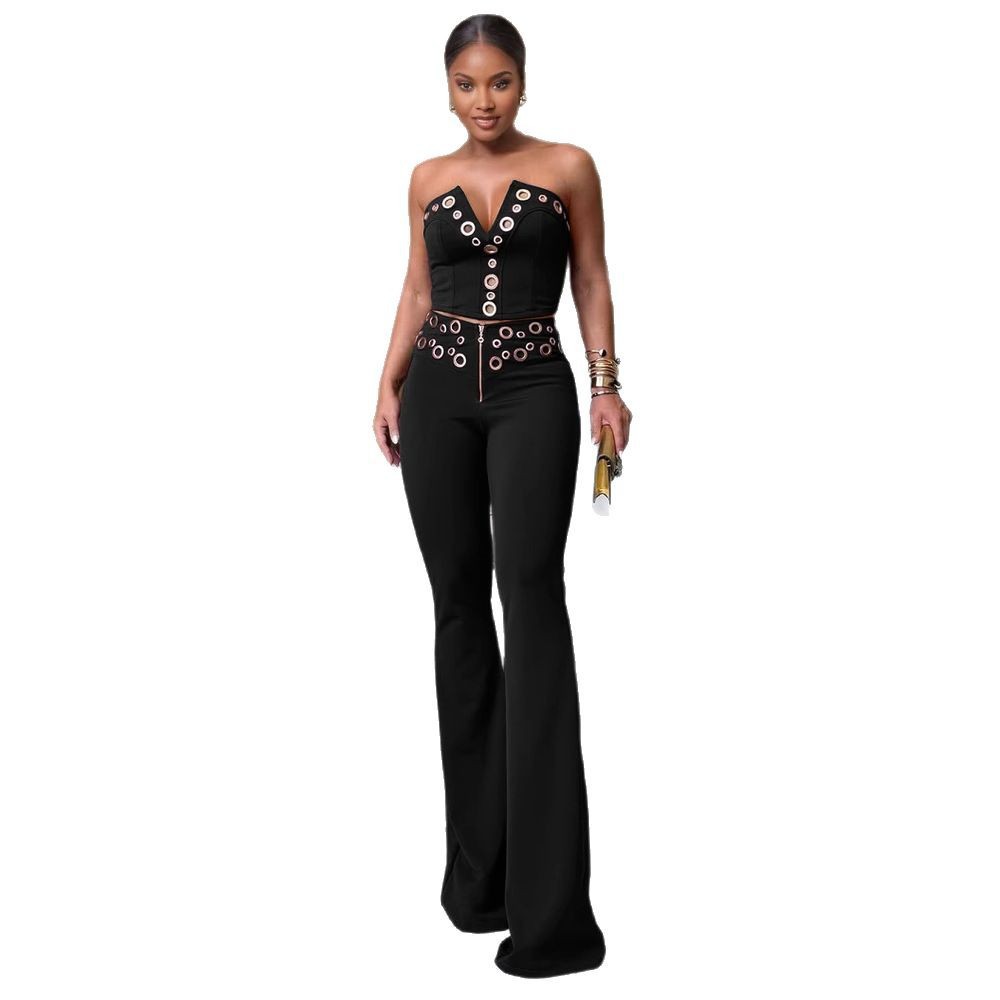 This Women Elegant Elastic Metal Buckle Decorated v-Neck Top And Pants Two-Piece Set Design Made Of High Quality polyester And Spandex Material. It Is Stretchy, Durable And Comfortable. It Is a Must-Have Outfit For All Seasons. retail Two Piece Pant Sets Can Solve Your cloth selection Troubles. Explore More 2 Piece Pants Set On BamBam retail Women Clothing Online Store.