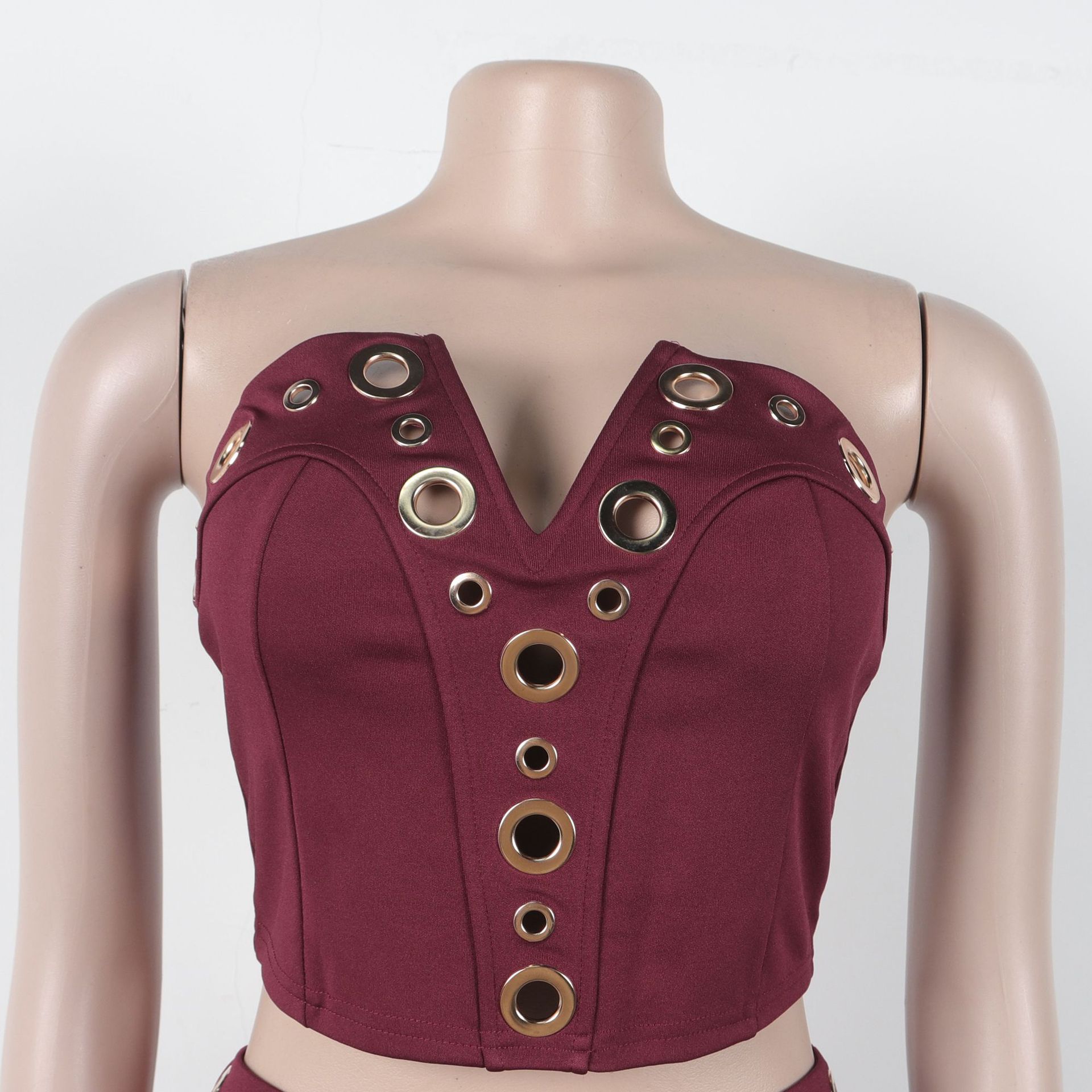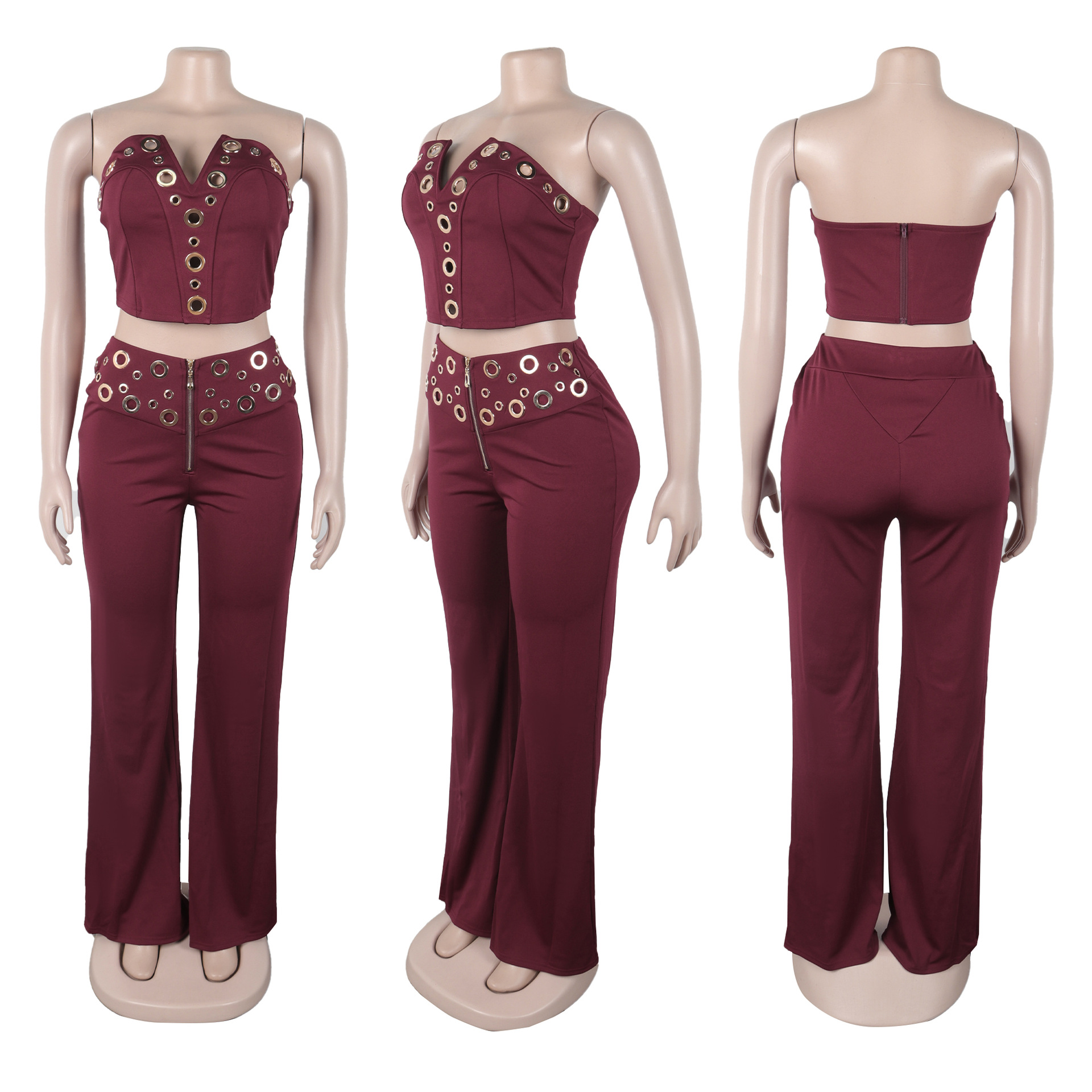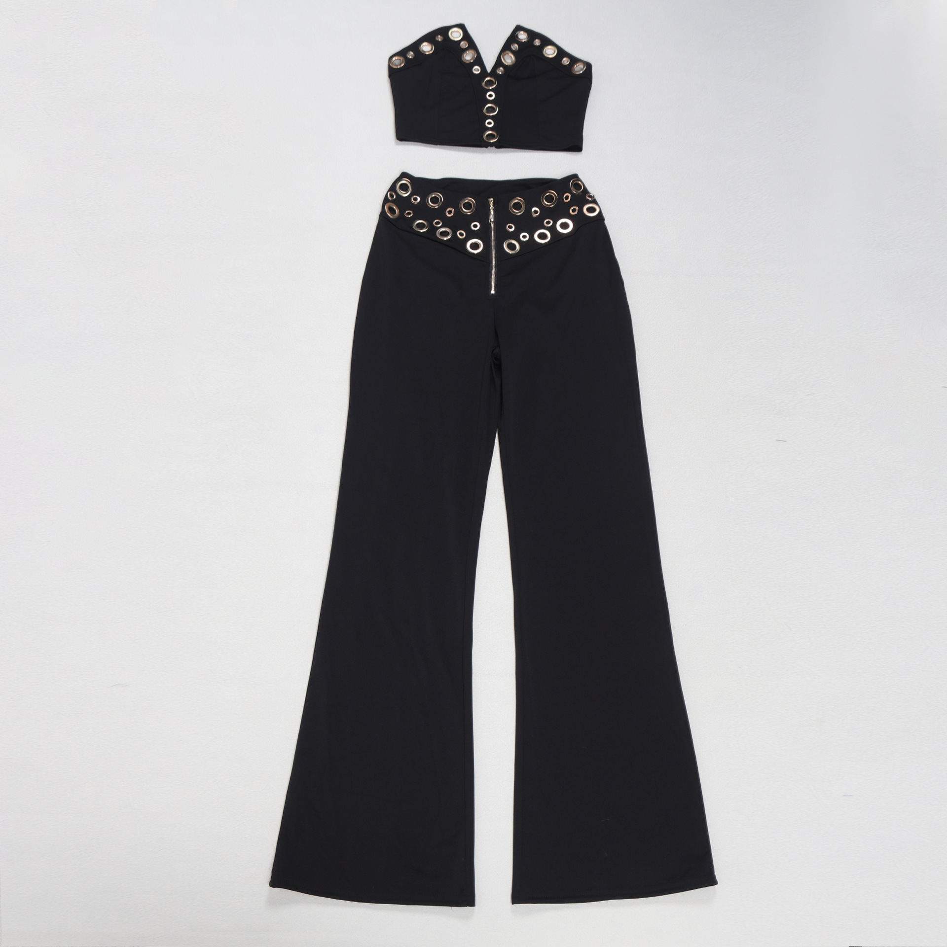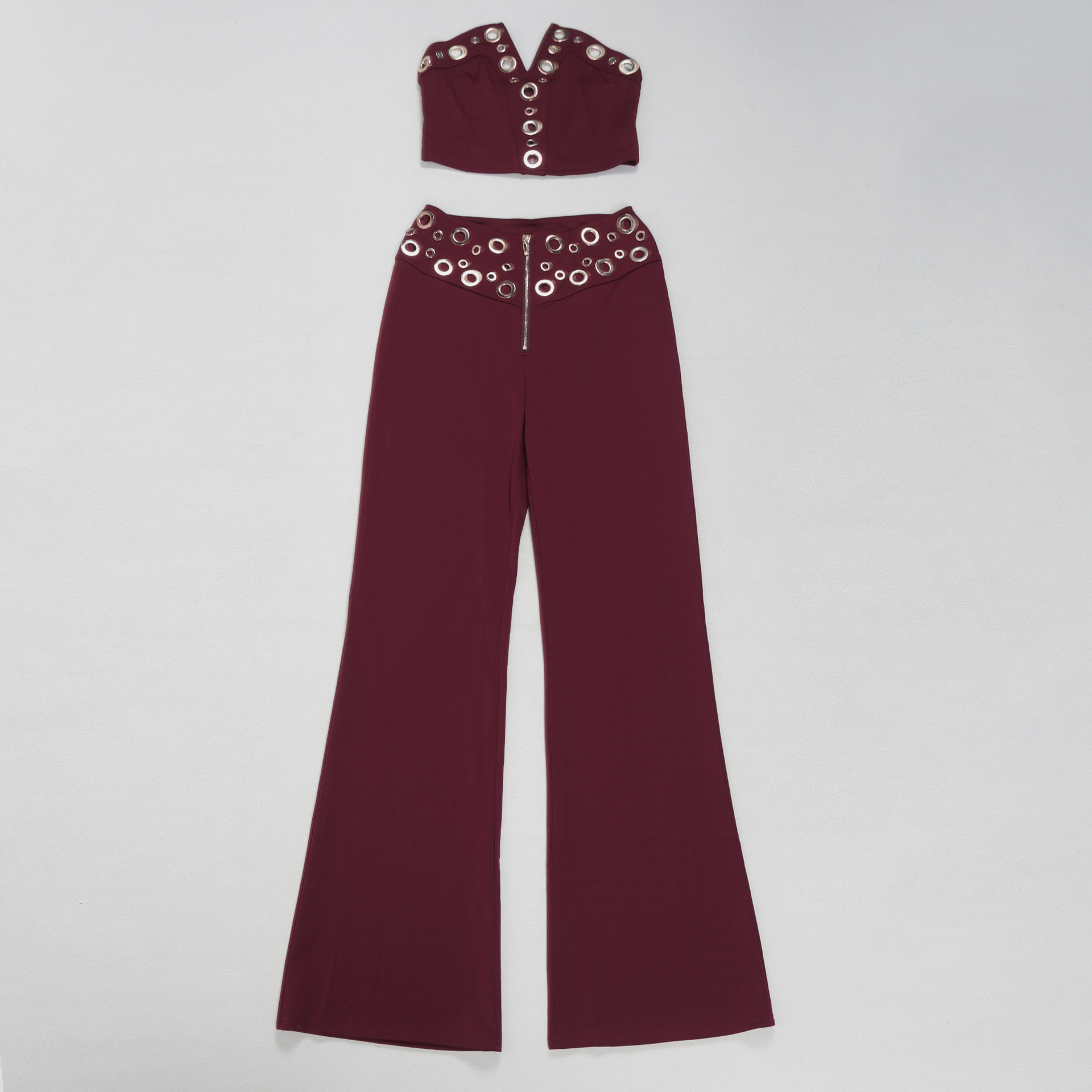 This Women Elegant Elastic Metal Buckle Decorated v-Neck Top And Pants Two-Piece Set Design Made Of High Quality polyester And Spandex Material. It Is Stretchy, Durable And Comfortable. It Is a Must-Have Outfit For All Seasons. retail Two Piece Pant Sets Can Solve Your cloth selection Troubles. Explore More 2 Piece Pants Set On BamBam retail Women Clothing Online Store.