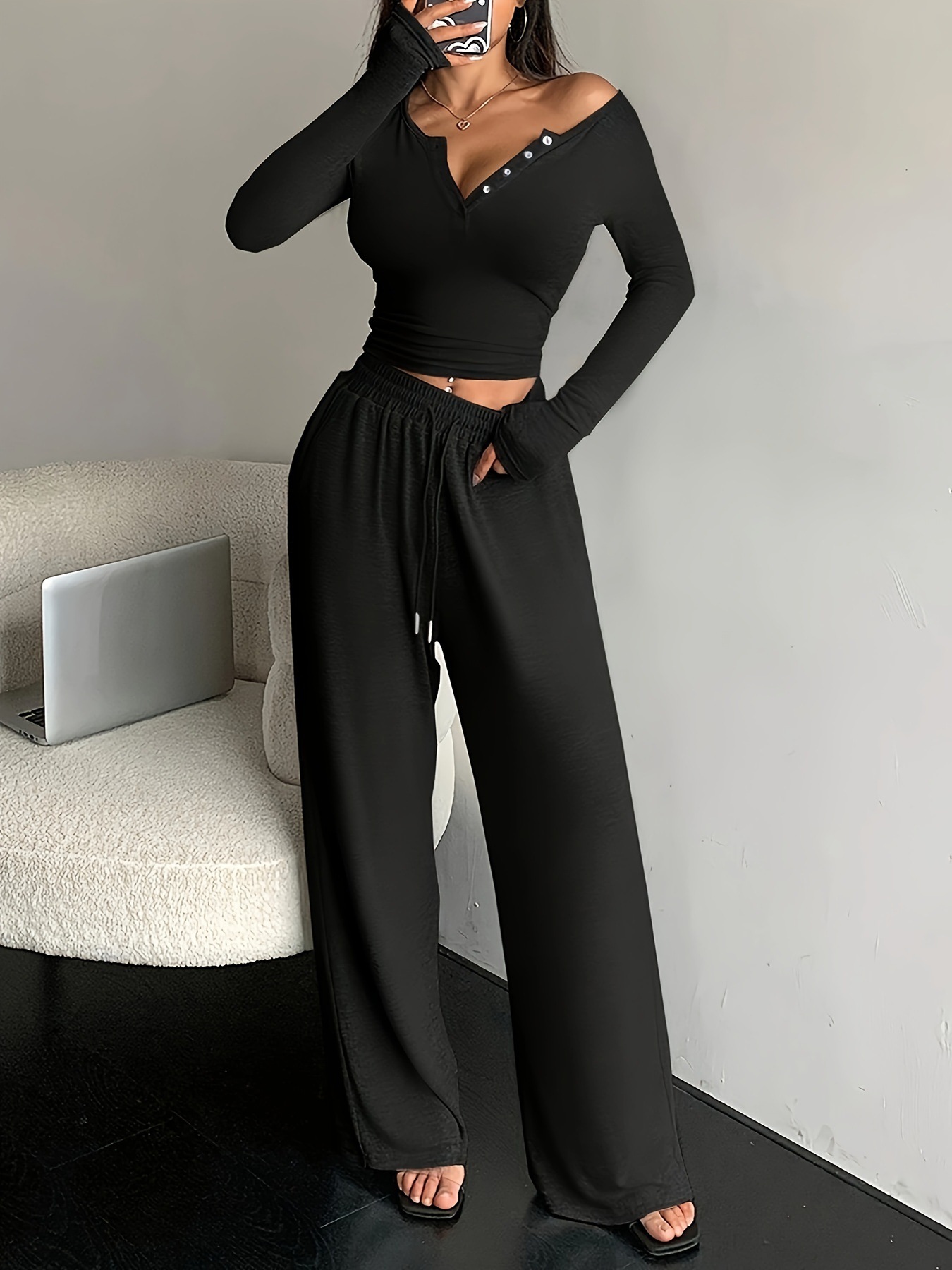 This Women Fall Long-Sleeved Buttoned Solid Top And Pants Two-Piece Set Design Made Of High Quality polyester And Spandex Material. It Is Stretchy, Durable And Comfortable. It Is a Must-Have Outfit For All Seasons. retail Two Piece Pant Sets Can Solve Your cloth selection Troubles. Explore More 2 Piece Pants Set On BamBam retail Women Clothing Online Store.