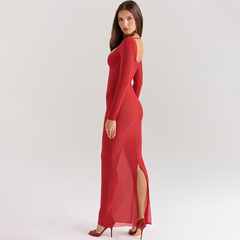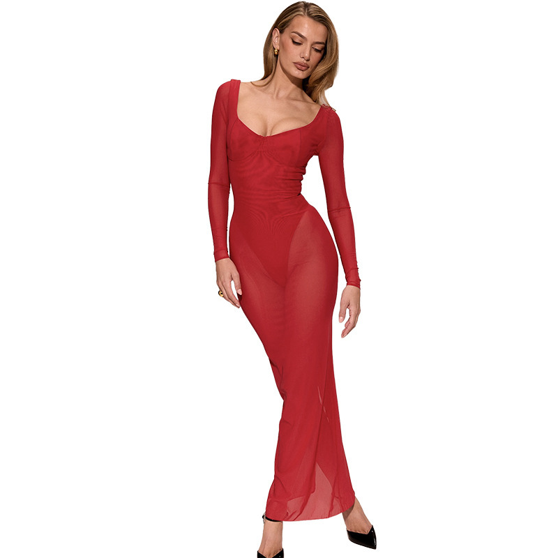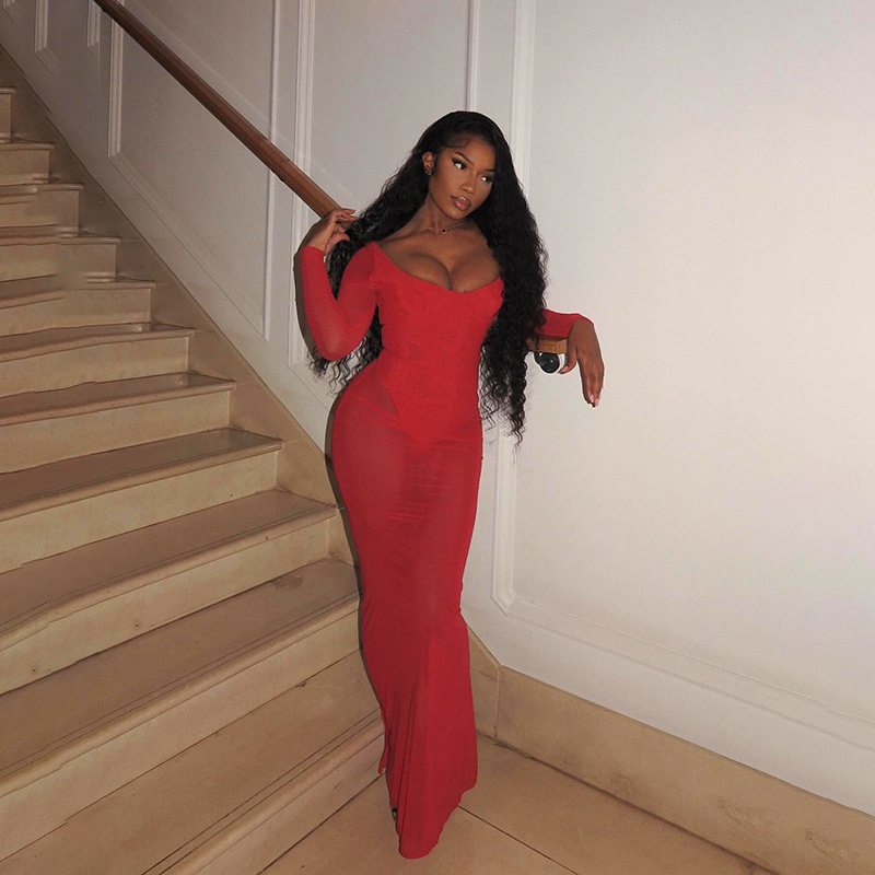 This Women Fall Sexy Plunging Mesh Long-Sleeved Maxi Dress Design Made Of High Quality polyester And Spandex Material. It Is Stretchy, Durable And Comfortable. Casual Dresses With Long Sleeves Can Not Only Be Worn As Outerwear In Spring And Autumn, But Also Matching a Jacket In Winter, It Is a Must Have Item For Every Season. Grab Really Great Buy Casual Dresses For Women And Grow Your Business. No Moq In BamBam.