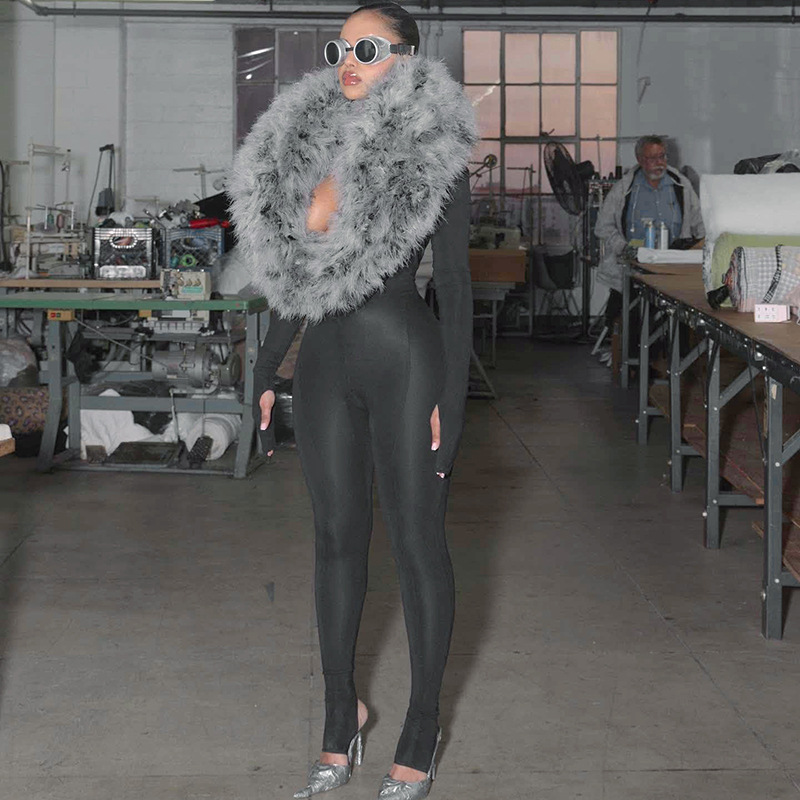 This Women Fall/Winter v-Neck Furry Patchwork Shawl Collar Solid Long-Sleeved Jumpsuit Design Made Of High Quality Polyster And Spandex Material. It Is Stretchy, Durable And Comfortable. Affordable Sexy Jumpsuits For Women Has Long Been a Party Favorite. BamBam provides a Rich selection Of Sequin, Beaded, See Through Mesh, Leopard, Floral Lace, Leather, Velvet, Tight And Fitted retail Jumpsuit Without Moq Limit.