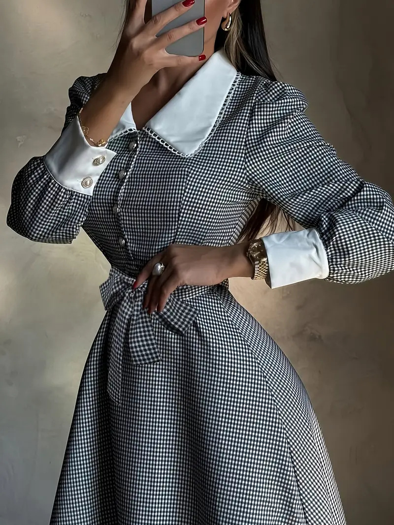 This Women French Elegant Houndstooth Autumn Lace-Up Dress Design Made Of High Quality polyester And Spandex Material. It Is Stretchy, Durable And Comfortable. Casual Dresses With Long Sleeves Can Not Only Be Worn As Outerwear In Spring And Autumn, But Also Matching a Jacket In Winter, It Is a Must Have Item For Every Season. Grab Really Great Buy Casual Dresses For Women And Grow Your Business. No Moq In BamBam.