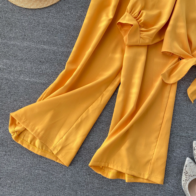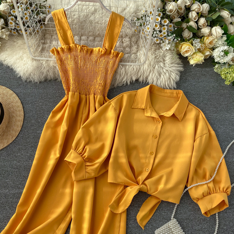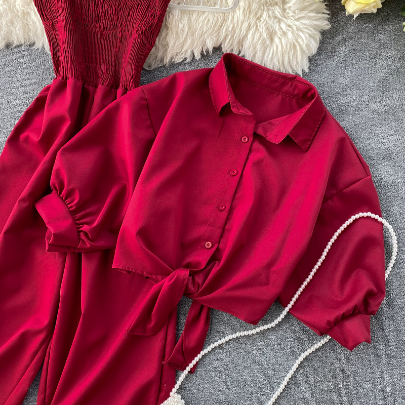 This Women Holidays Stand Collar Short Sleeve Shirt And Suspender Pleated Wide-Leg Jumpsuit Two-Piece Set Design Made Of High Quality polyester And Spandex Material. It Is Stretchy, Durable And Comfortable. It Is a Must-Have Outfit For All Seasons. retail Two Piece Pant Sets Can Solve Your cloth selection Troubles. Explore More 2 Piece Pants Set On BamBam retail Women Clothing Online Store.