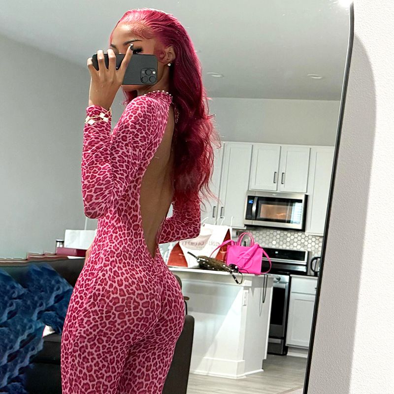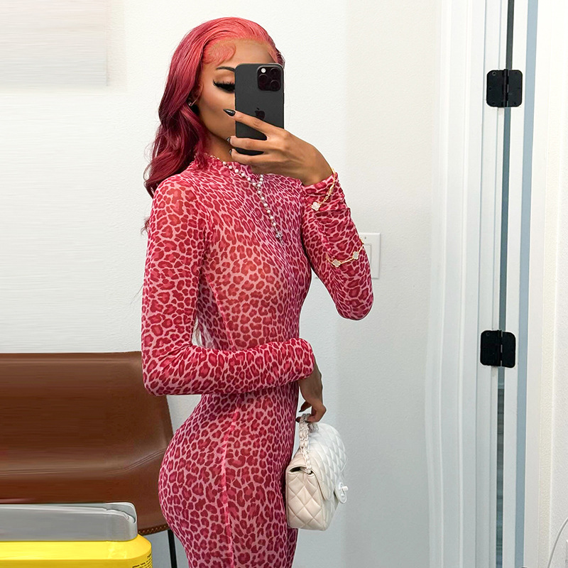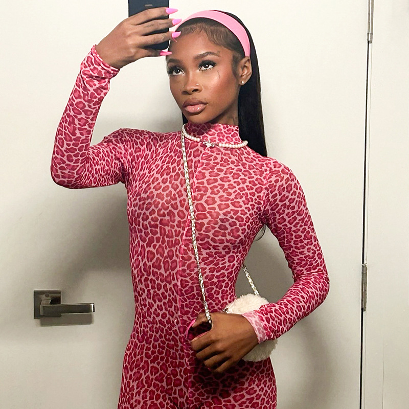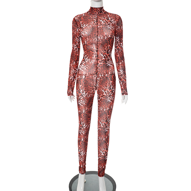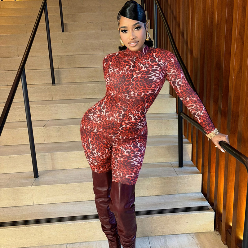 This Women Leopard Print Mesh Half High Neck Large Backless Long Sleeve Jumpsuit Design Made Of High Quality Polyster And Spandex Material. It Is Stretchy, Durable And Comfortable. Affordable Sexy Jumpsuits For Women Has Long Been a Party Favorite. BamBam provides a Rich selection Of Sequin, Beaded, See Through Mesh, Leopard, Floral Lace, Leather, Velvet, Tight And Fitted retail Jumpsuit Without Moq Limit.