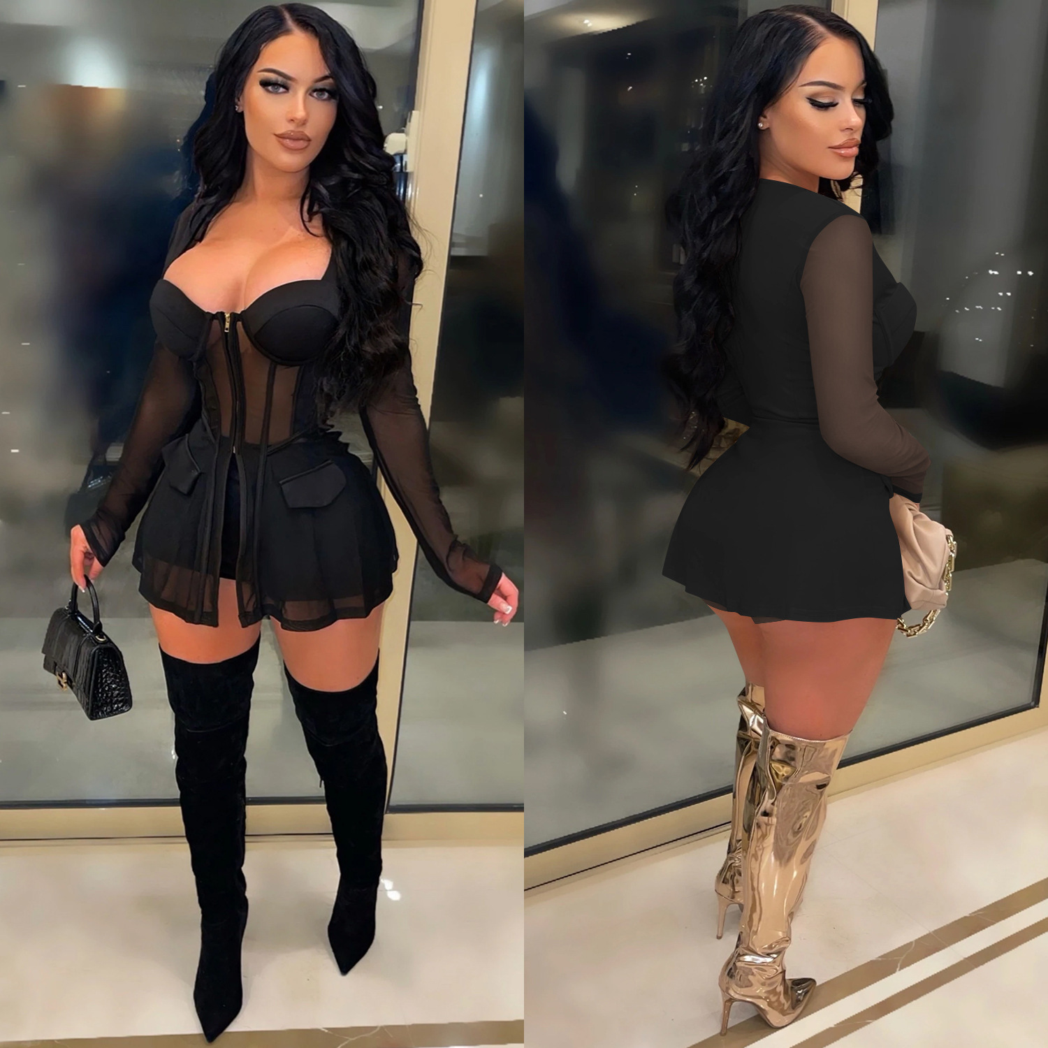 This Women Mesh See-Through Long-Sleeved Top And Shorts Two-Piece Set Design Made Of High Quality polyester And Spandex Material. It Is Stretchy, Durable And Comfortable. It Come With The Top And Shorts. retail Short Sets Saves Some People From The Trouble Of Matching. And For Matchmakers It Is More Flexible Than One-Piece Outfit. Two Piece Short Set Can Be Worn Together Or Individually, Ladies Can Match Them According To Different Occasions. Grab Different Two Piece Short Sets For This Spring And Summer.
