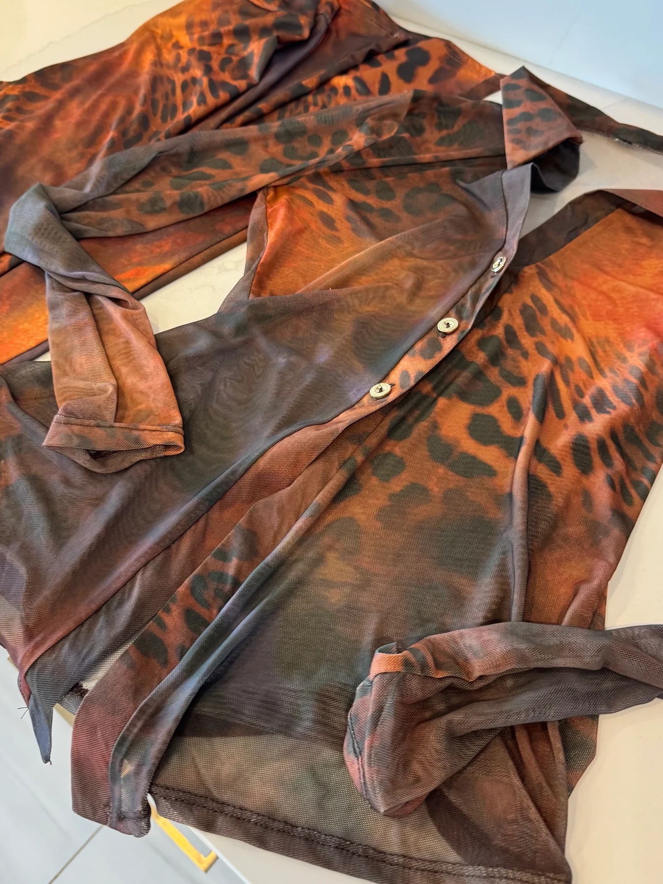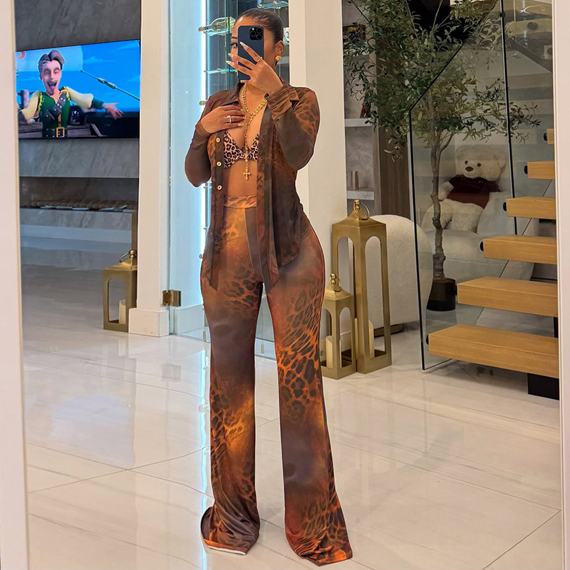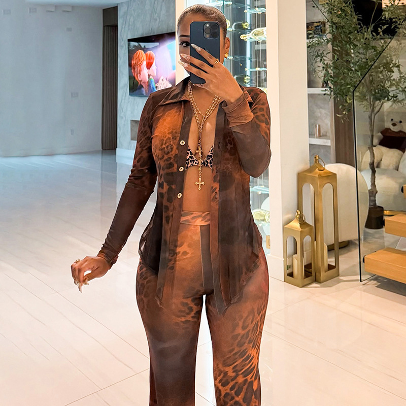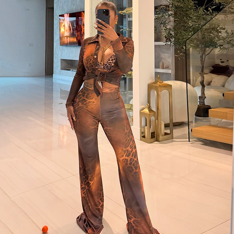 This Women Printed Mesh Turndown Collar Long-Sleeved Button Top And Bell Bottom Pants Two-Piece Set Design Made Of High Quality polyester And Spandex Material. It Is Stretchy, Durable And Comfortable. It Is a Must-Have Outfit For All Seasons. retail Two Piece Pant Sets Can Solve Your cloth selection Troubles. Explore More 2 Piece Pants Set On BamBam retail Women Clothing Online Store.
