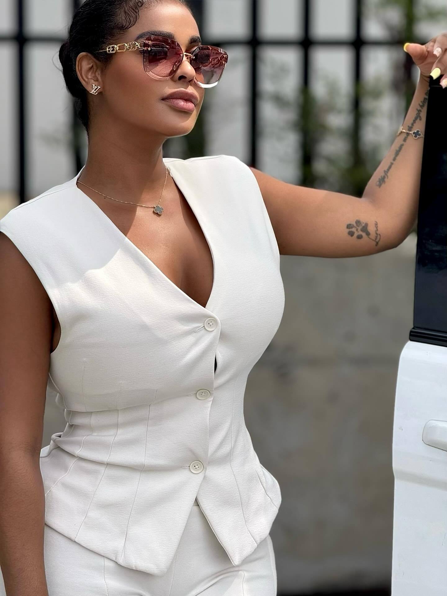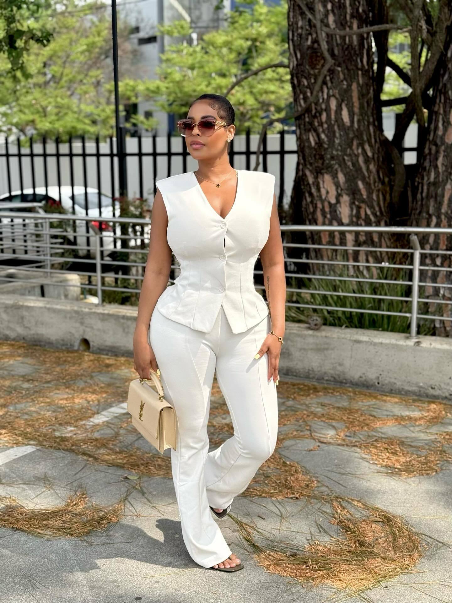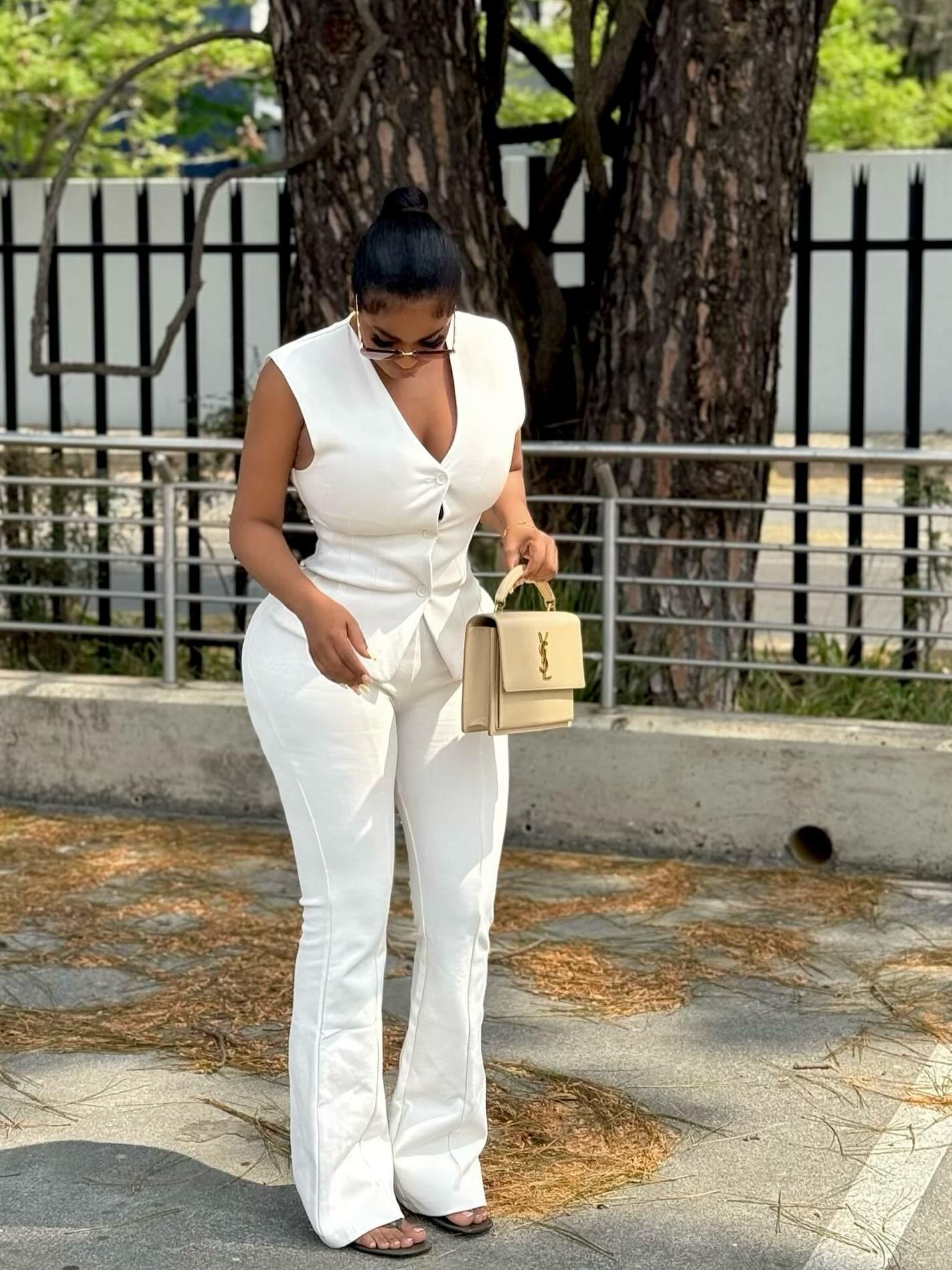 This Women's Autumn Fashion v-Neck Button Slim Waist Vest Straight Leg Solid Color Pants Set Design Made Of High Quality polyester And Spandex Material. It Is Stretchy, Durable And Comfortable. It Is a Must-Have Outfit For All Seasons. retail Two Piece Pant Sets Can Solve Your cloth selection Troubles. Explore More 2 Piece Pants Set On BamBam retail Women Clothing Online Store.