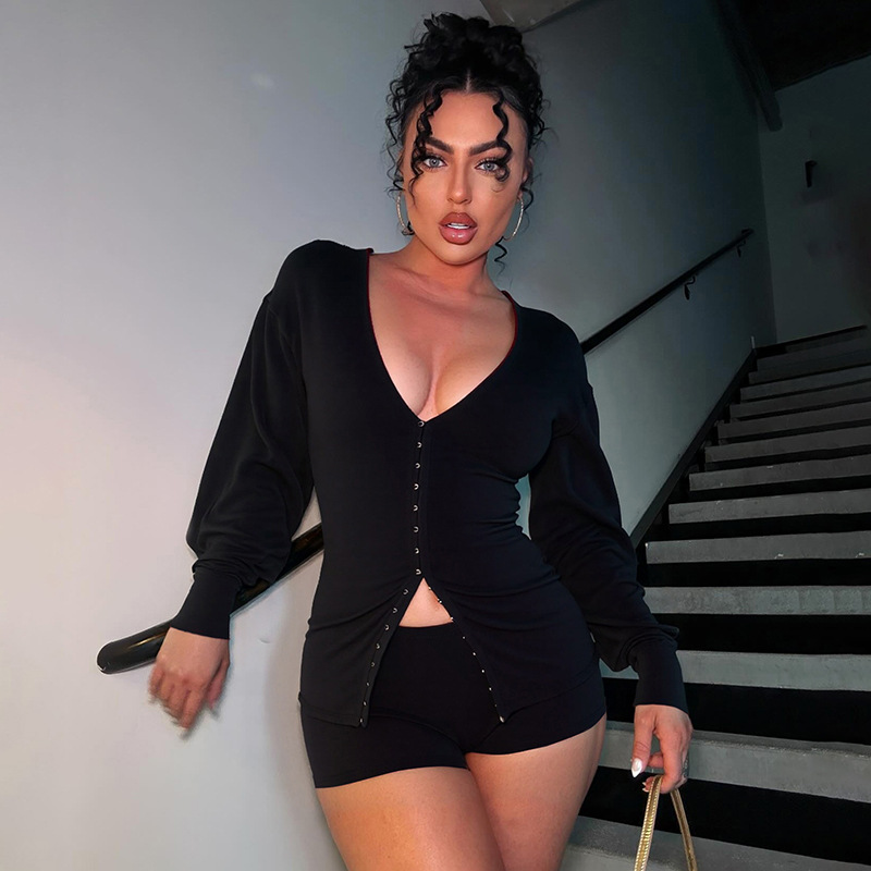This Women's Autumn Winter Round Neck Buttons Slim Waist Long Sleeve Top Shorts Set Design Made Of High Quality polyester And Spandex Material. It Is Stretchy, Durable And Comfortable. It Come With The Top And Shorts. retail Short Sets Saves Some People From The Trouble Of Matching. And For Matchmakers It Is More Flexible Than One-Piece Outfit. Two Piece Short Set Can Be Worn Together Or Individually, Ladies Can Match Them According To Different Occasions. Grab Different Two Piece Short Sets For This Spring And Summer.