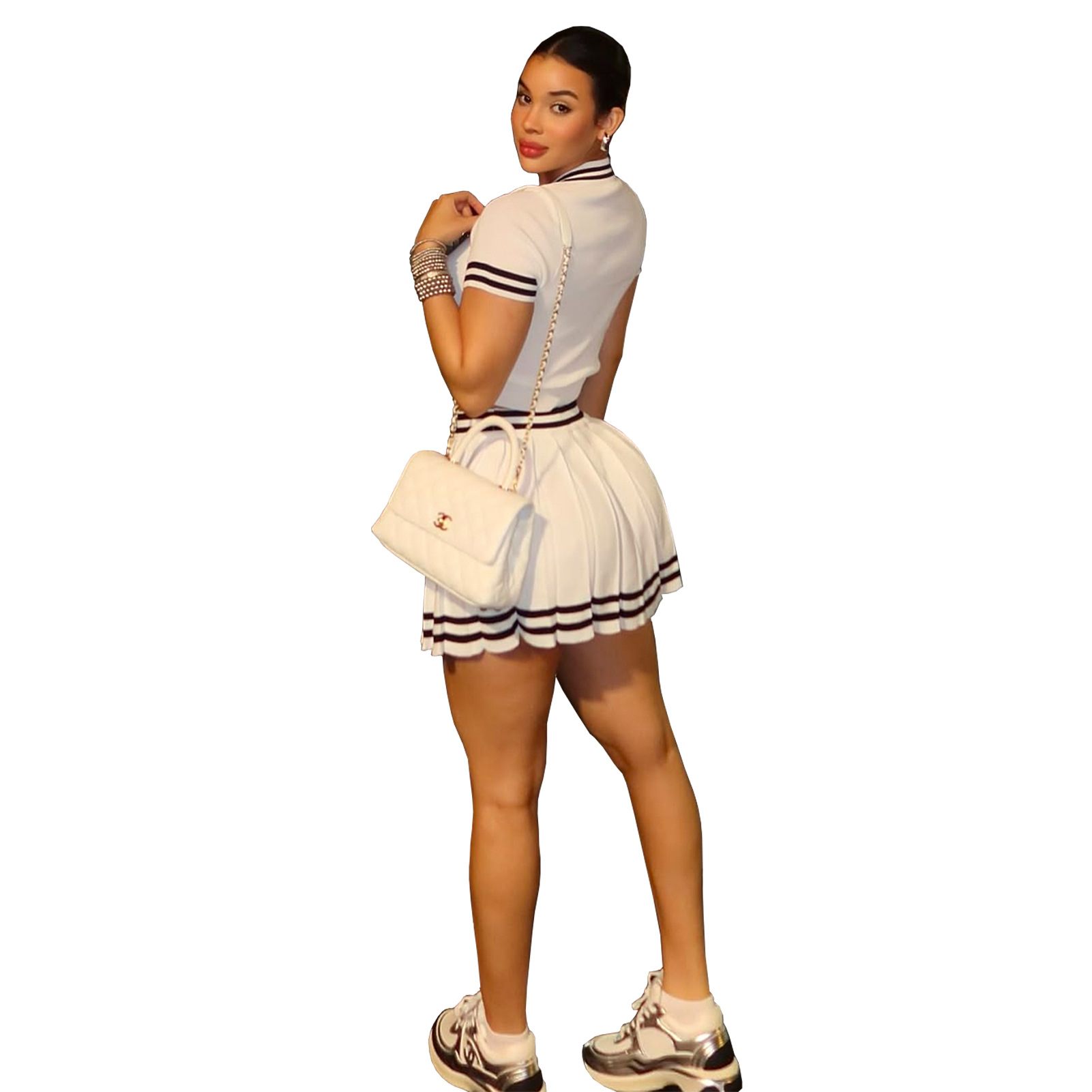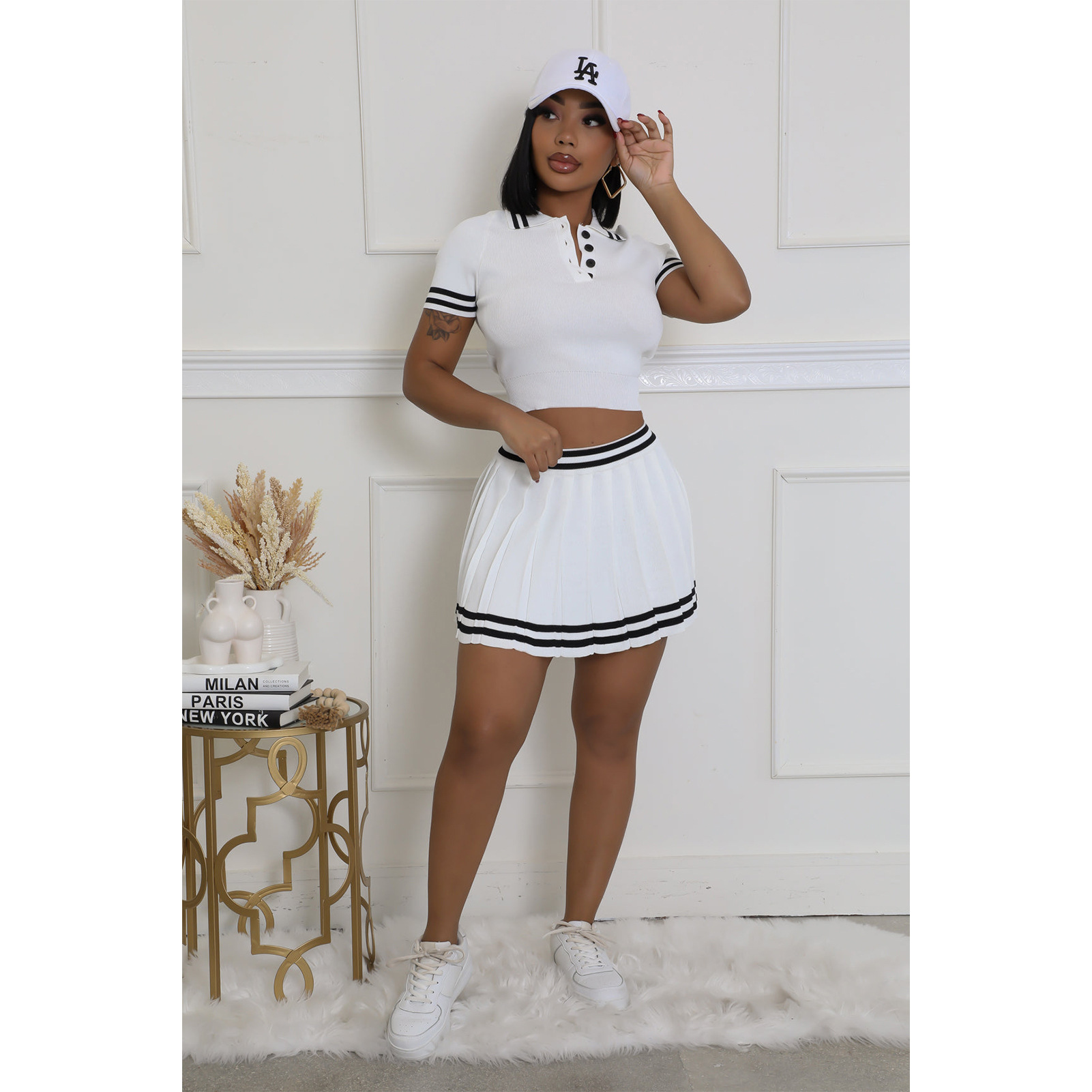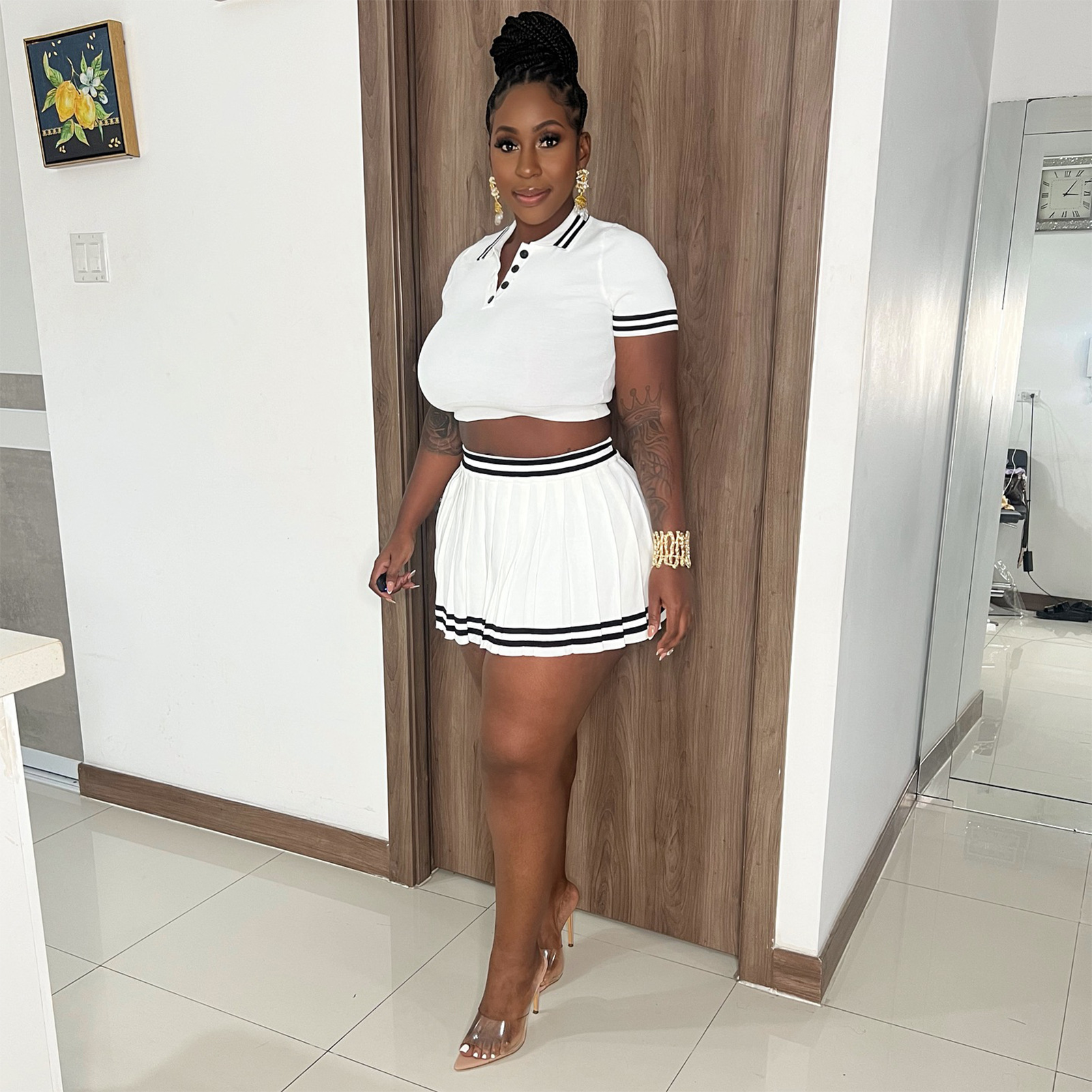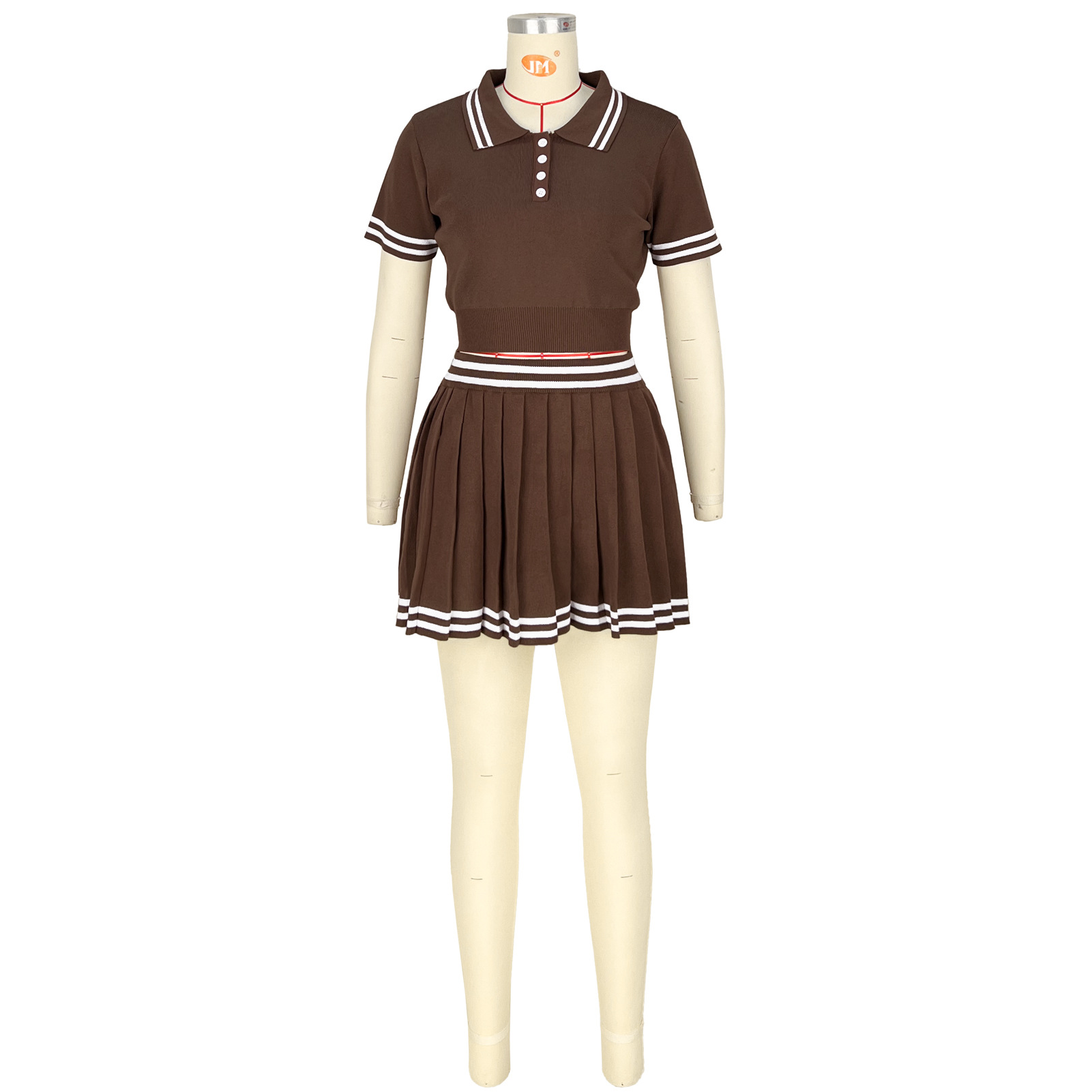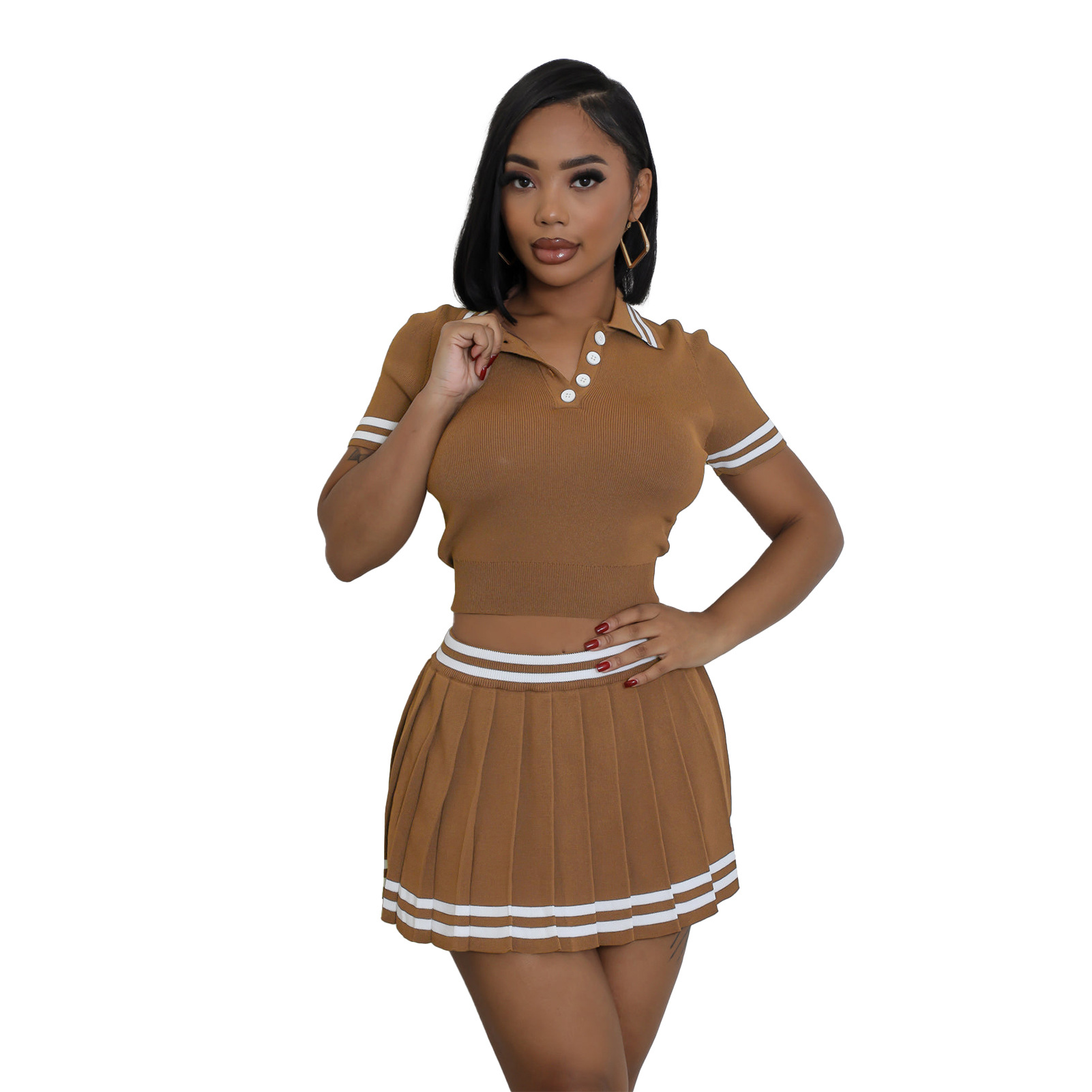 This Women's Clothing Turndown Collar Contrast Color Short Sleeve Knitting Shirt Pleated Skirt Two-Piece Set Design Made Of High Quality polyester And Spandex Material. It Is Stretchy, Durable And Comfortable. It Come With The Top And Skirt Matching Set. Women’s Skirt Suit Sets Is a Great Alternative To One Piece Outfit. It Can Either Be Worn Together Or Individually, So You Can Combine Them Endlessly. Grab Different Two Piece Skirt Set retail On Our Website a Women's Clothing Store Online At Really affordable price And Enjoy fast delivery worldwide.