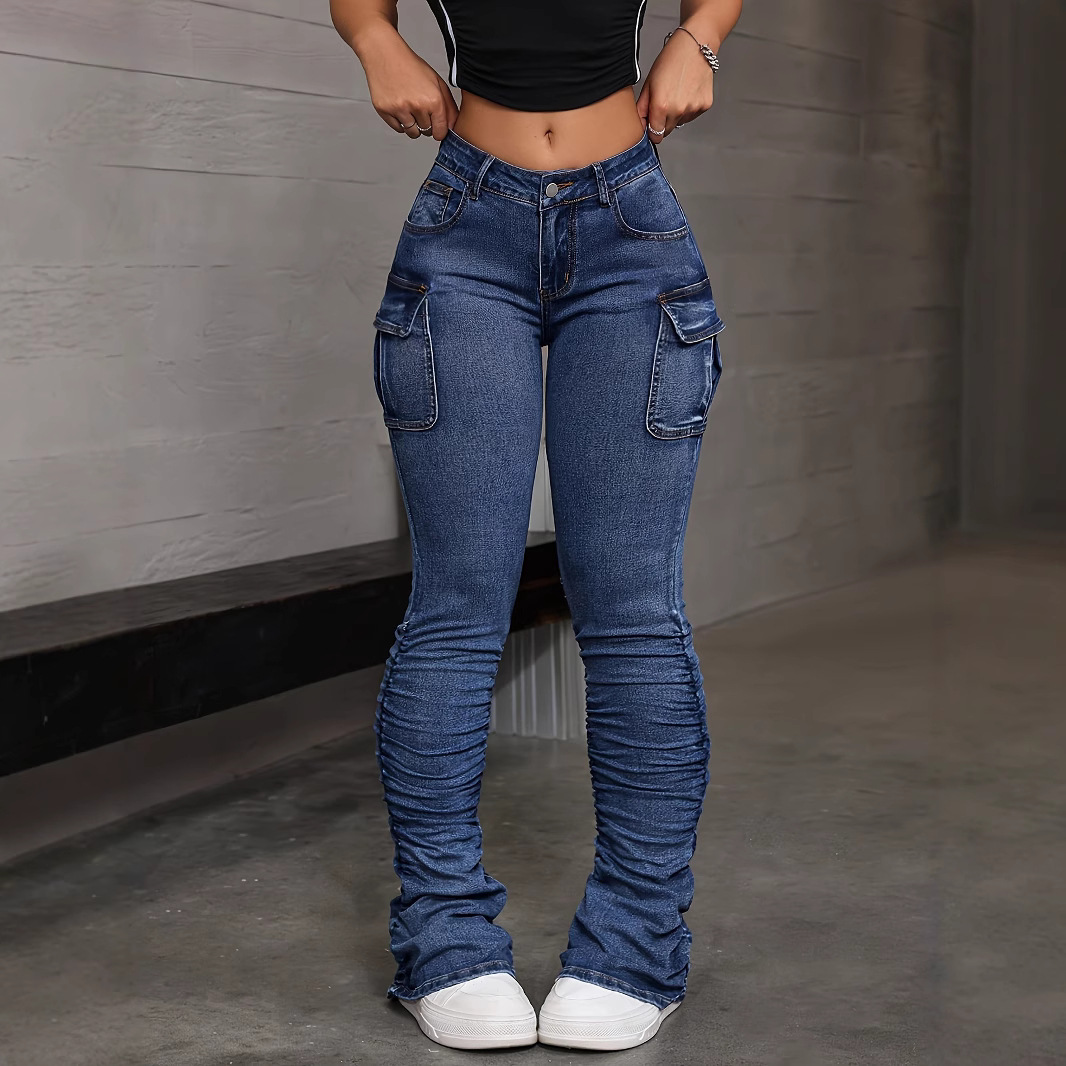 This Women's Denim Side Pleats Mid Waist Elastic Dark Blue Cargo Stacked Pants Design Made Of Durable And Stretchy Jeans Fabric. It Is a Must-Have Item For everyday use. Trendy retail Jeans Is a Indispensable Item For Everyday Fashion. Women’s Jeans With High Waist Is a Must Have trouser/pant that helps bring the grace of shape of your legs out even more and fits perfectly snugging your thighs and body gracefully. Grab a Must Have High Waist Jeans retail For Your Closet, Just Choose Different Matching Tops To stay in control of Every Occasion Easily.